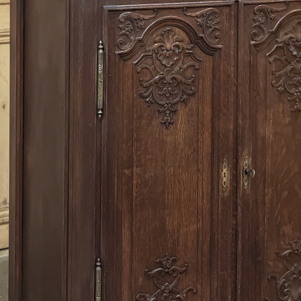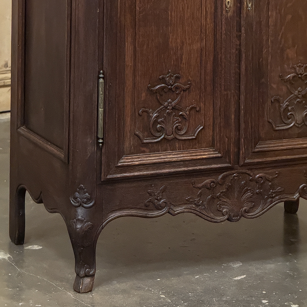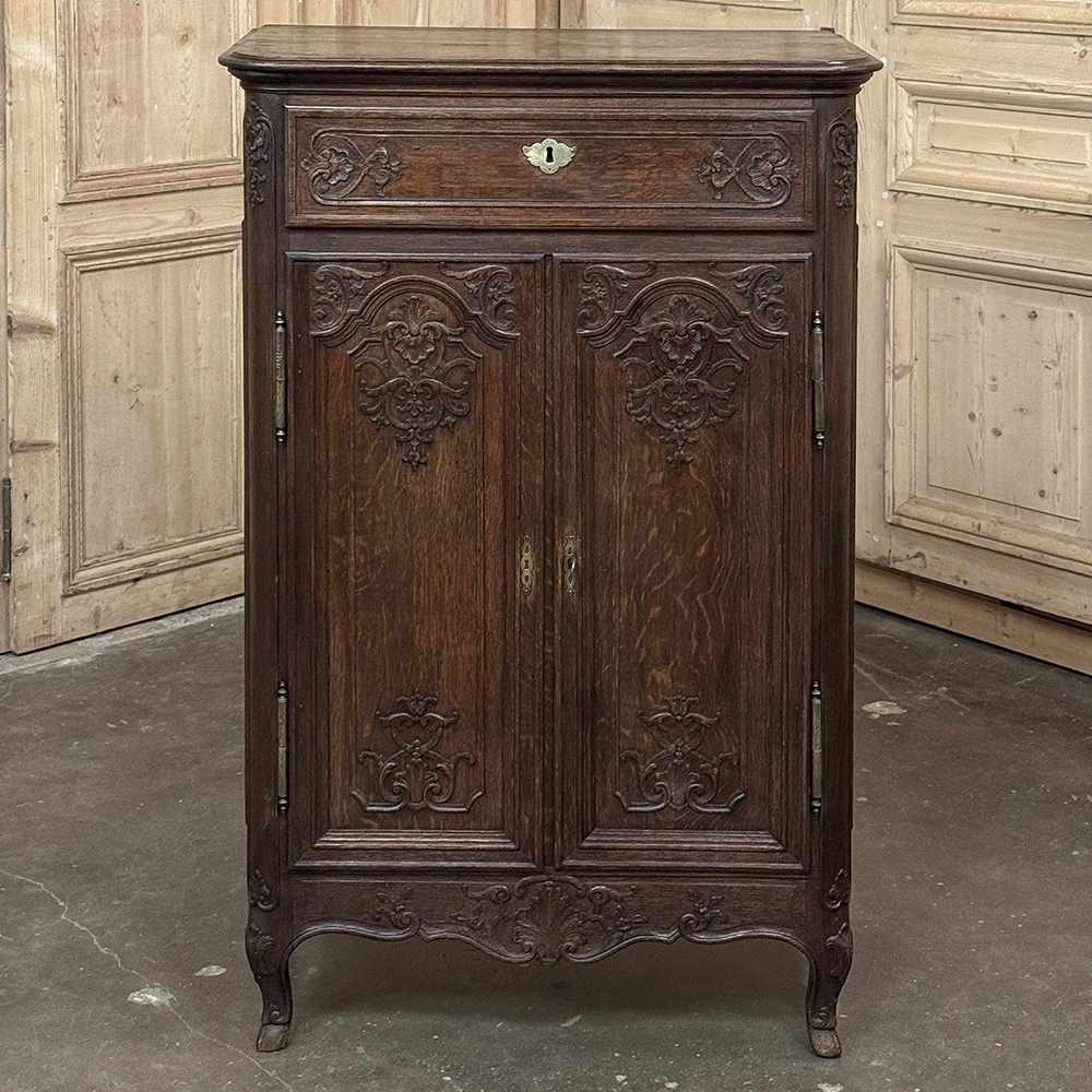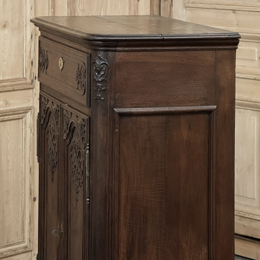 19th Century Country French Liegoise Confiturer ~ Cabinet was hand-crafted from dense, old-growth indigenous white oak by the master artisans of Liege. The storied region has centuries of history in the creation of fine hand-made goods of all types, but is most known in antique circles for its furniture. This example is also of an intriguing design, ideal for narrow spaces while still exuding a refined Country French charm thanks to its hand-carved embellishment. Usually one door affairs, this example boasts a brace of doors not just carved, but hung with brass hinges and fitted with brass key guards. A contoured and carved apron with scrolled feet rounds out the package below, while a full width drawer fitted with a brass key guard finishes out the top. Just enough surface and storage to make use of a space between windows, a corner, or other such types of spaces, with less than a foot and a half in depth added to the appeal!