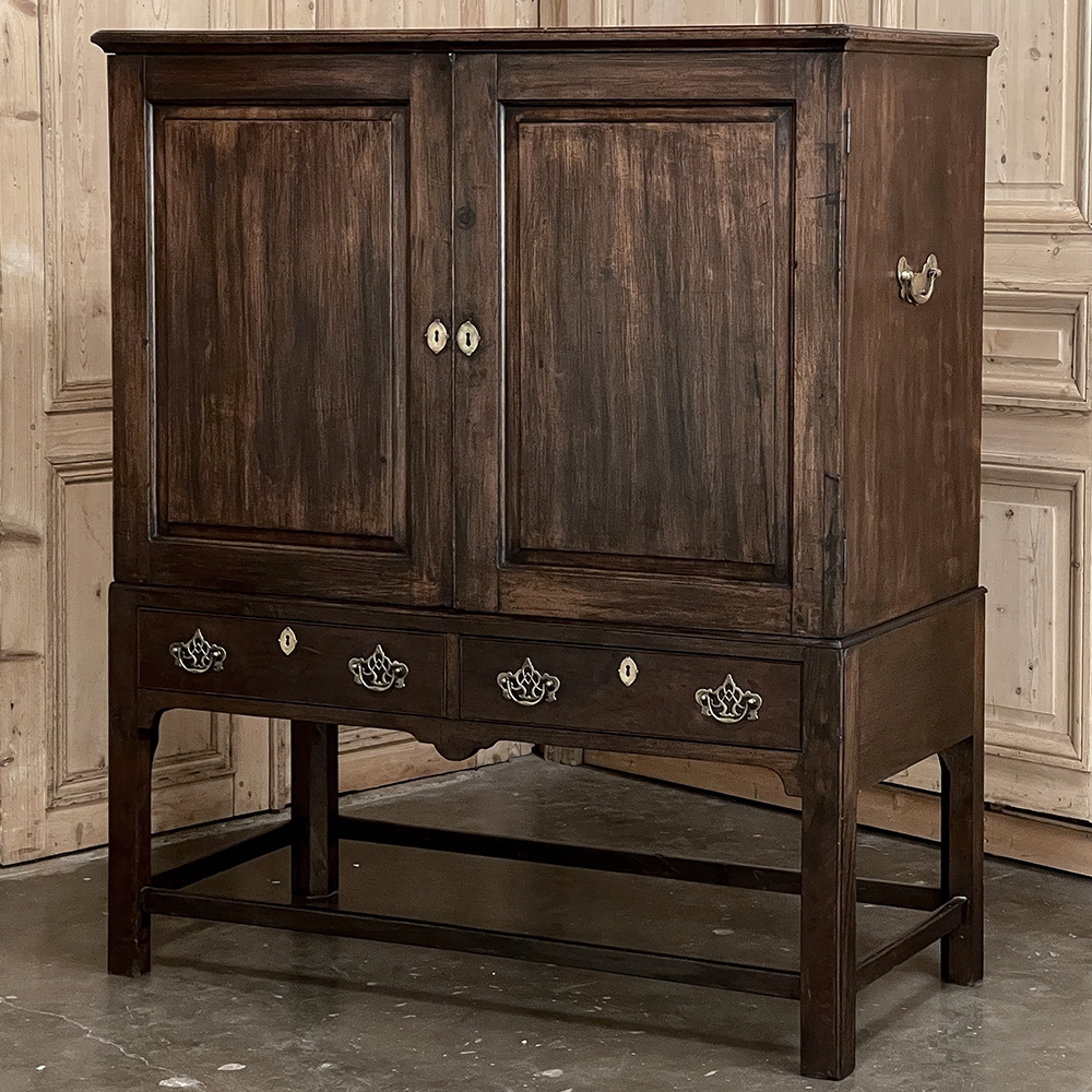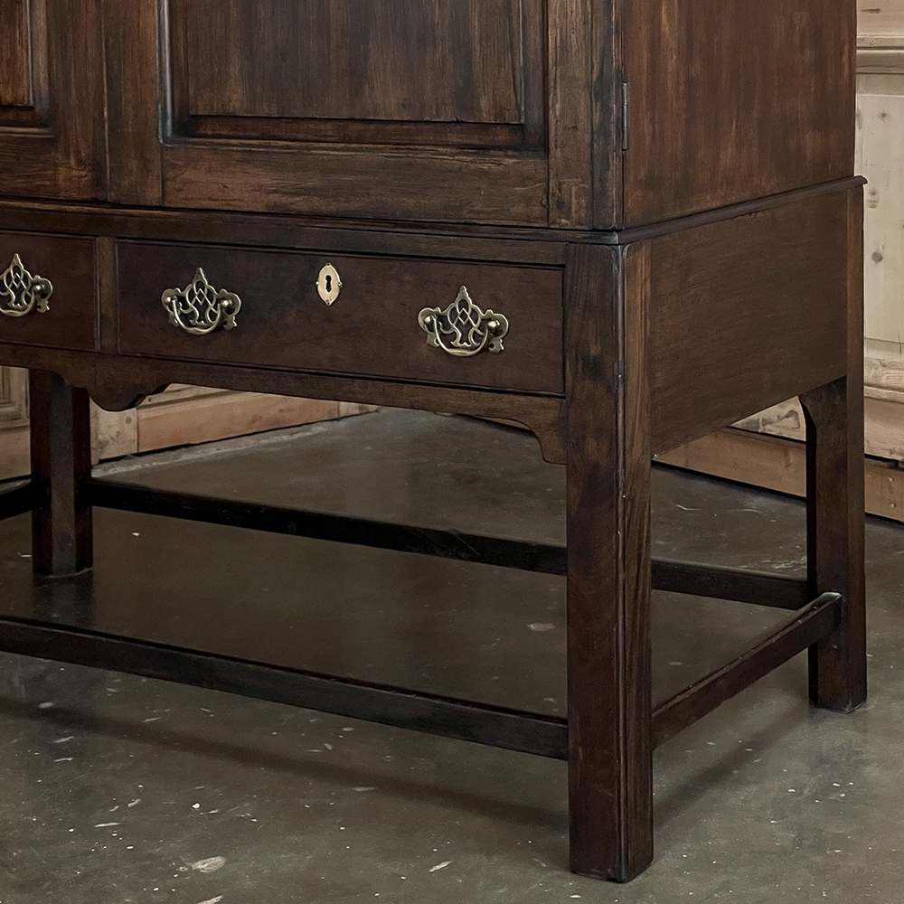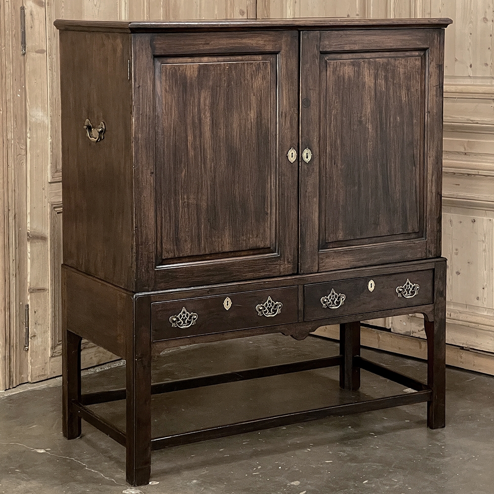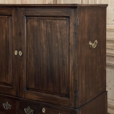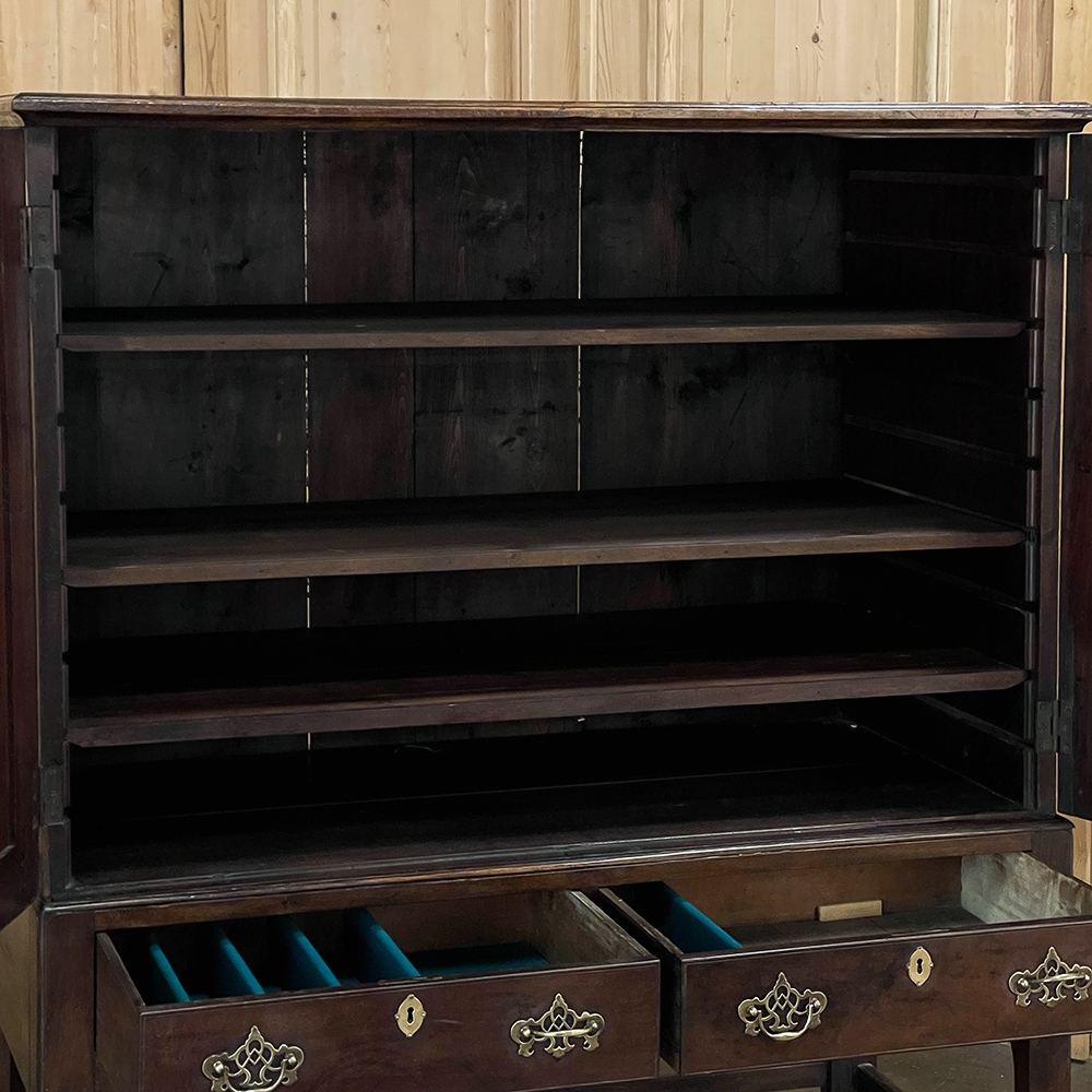 19th Century English Linen Press ~ Silver Chest was designed for refined living, hand-crafted to store a family's entire collection of table linens and silverware, all raised up on legs to create a cabinet exceptionally easy to access! Two piano hinged doors open to reveal four surfaces in the upper cabinet unobstructed by a stile, while two drawers immediately underneath are configured for organizing silverware. The straight, tailored lines makes this a great choice for the tailored decor. Post style legs below are connected with stretchers for added sturdiness, with only a slight emphasis on corbel-style treatment of the lower apron; otherwise the lines are rectilinear. Brass key guards and bale pulls add a visual touch as well as convenience. Hand-crafted from solid sycamore to provide enjoyment for decades to come!