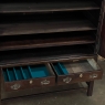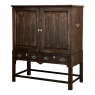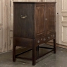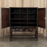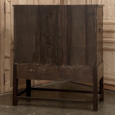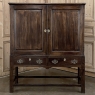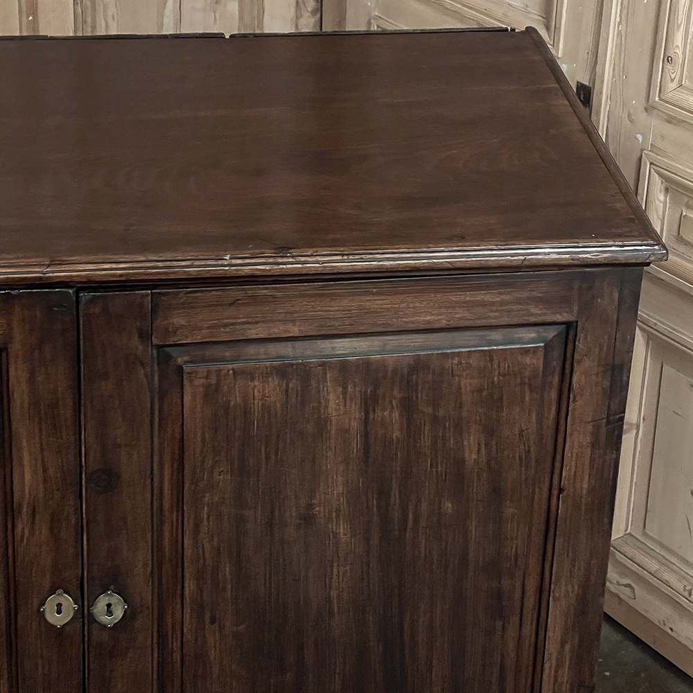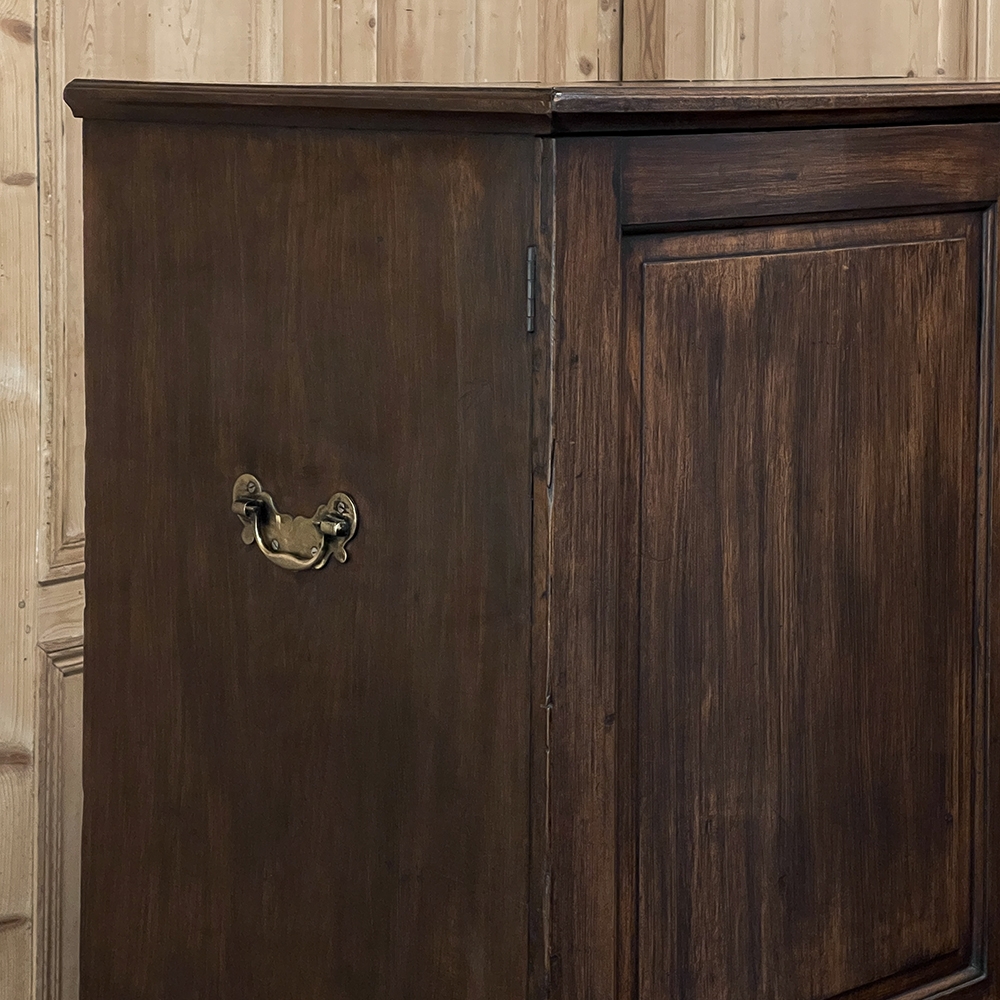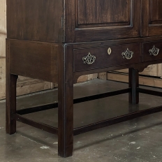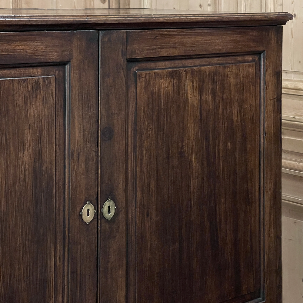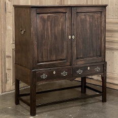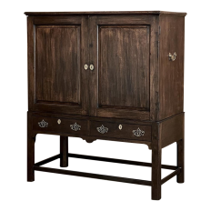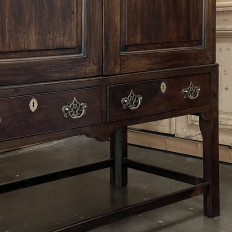 19th Century English Linen Press ~ Silver Chest was designed for refined living, hand-crafted to store a family's entire collection of table linens and silverware, all raised up on legs to create a cabinet exceptionally easy to access! Two piano hinged doors open to reveal four surfaces in the upper cabinet unobstructed by a stile, while two drawers immediately underneath are configured for organizing silverware. The straight, tailored lines makes this a great choice for the tailored decor. Post style legs below are connected with stretchers for added sturdiness, with only a slight emphasis on corbel-style treatment of the lower apron; otherwise the lines are rectilinear. Brass key guards and bale pulls add a visual touch as well as convenience. Hand-crafted from solid sycamore to provide enjoyment for decades to come!