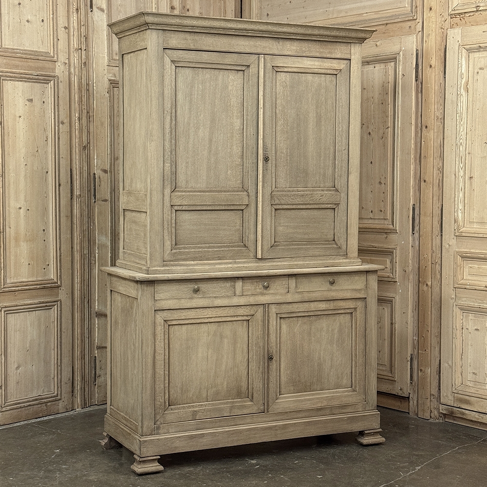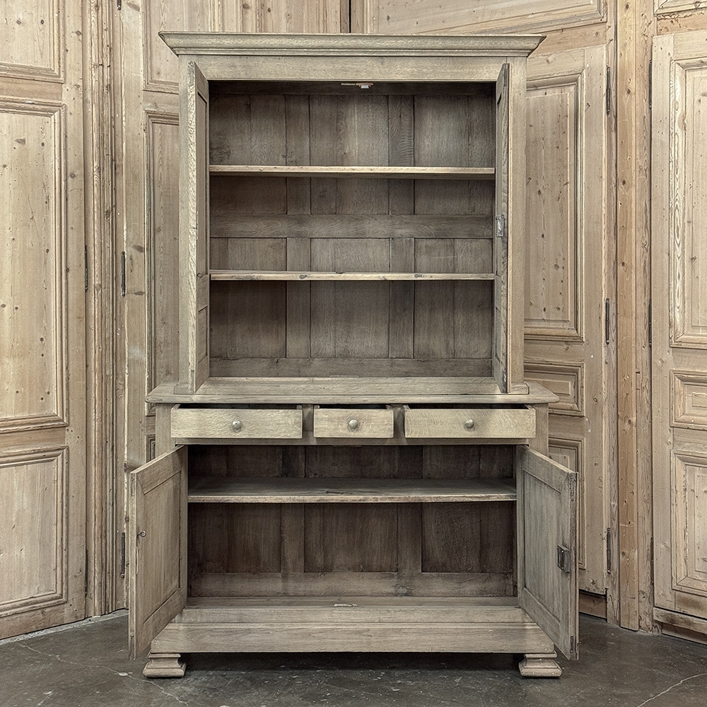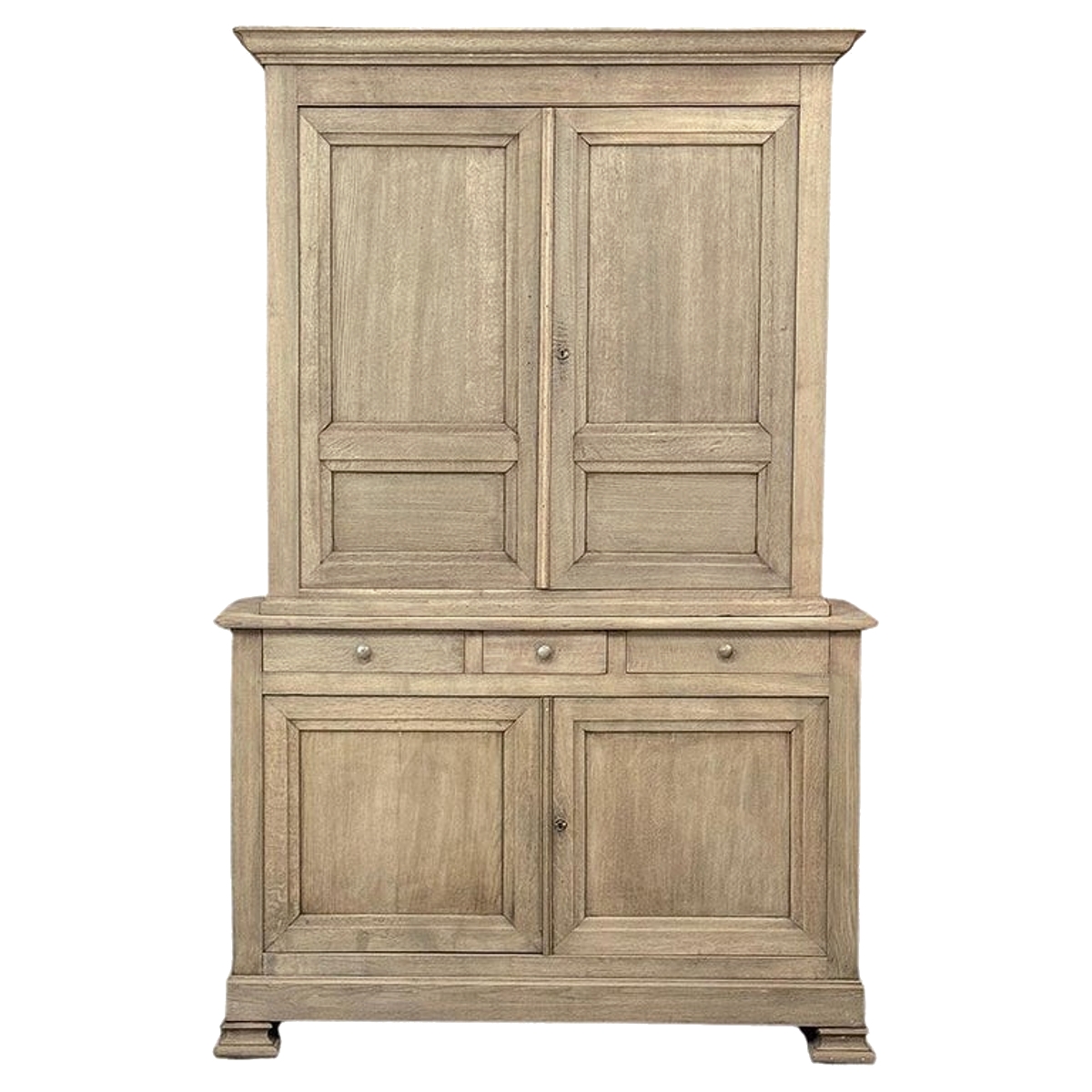Sale19th Century French Louis Philippe Period Buffet a Deux Corps in Stripped Oak was hand-crafted by master artisans during the period, and exemplifies the tailored, simplistic architectural form that is definitive of that era. Created from dense, old-growth indigenous oak, it features two tiers that can be easily separated for transport, yet are so solidly designed and made that gravity alone is all that is needed to assemble the two. A handsome crown molding appears over the top tier, whose pair of doors open to reveal shelves and spacious storage, while the lower tier is deeper and affords as much storage as the top. A tier of three drawers separates the two, above which is a shallow surface ideal for setting things down while loading or removing such items from their storage. Brass knobs, key guards, and half-mortised steel locks appear to be original to the piece. Pediment style feet complete the look, while the sheer natural beauty of the wood is revealed thanks to our painstaking proprietary stripping process that retains the patina of the old wood, all performed by our expert in-house staff.