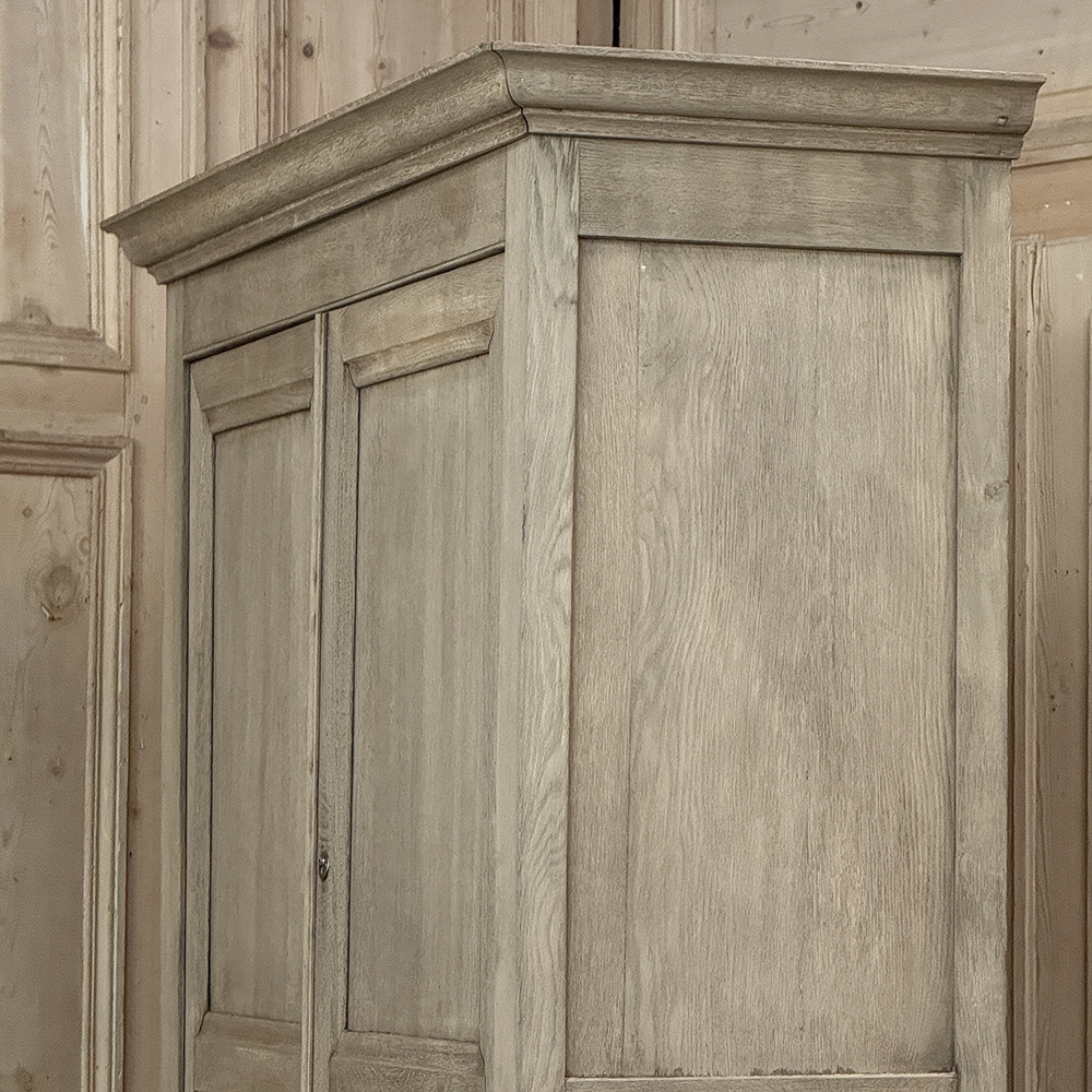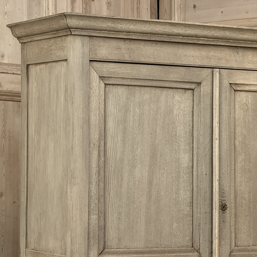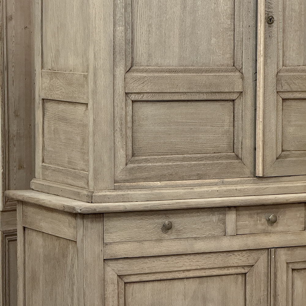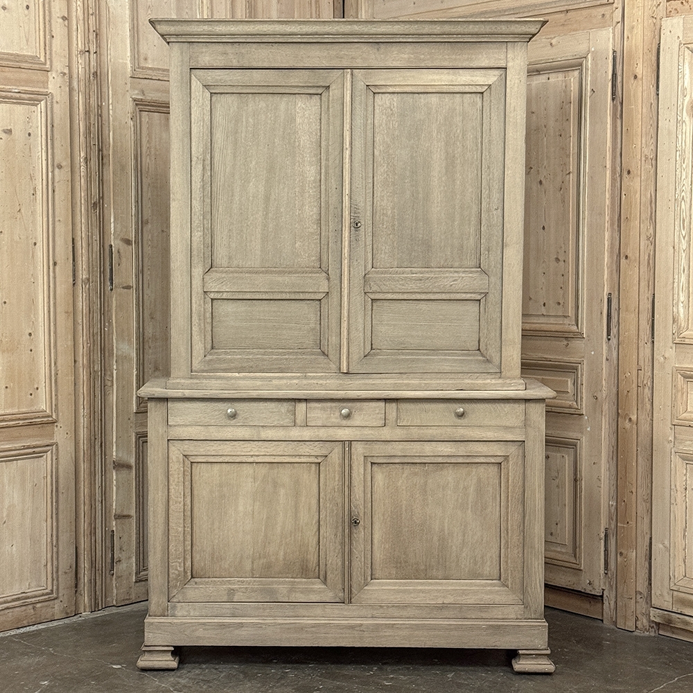Sale19th Century French Louis Philippe Period Buffet a Deux Corps in Stripped Oak was hand-crafted by master artisans during the period, and exemplifies the tailored, simplistic architectural form that is definitive of that era. Created from dense, old-growth indigenous oak, it features two tiers that can be easily separated for transport, yet are so solidly designed and made that gravity alone is all that is needed to assemble the two. A handsome crown molding appears over the top tier, whose pair of doors open to reveal shelves and spacious storage, while the lower tier is deeper and affords as much storage as the top. A tier of three drawers separates the two, above which is a shallow surface ideal for setting things down while loading or removing such items from their storage. Brass knobs, key guards, and half-mortised steel locks appear to be original to the piece. Pediment style feet complete the look, while the sheer natural beauty of the wood is revealed thanks to our painstaking proprietary stripping process that retains the patina of the old wood, all performed by our expert in-house staff.