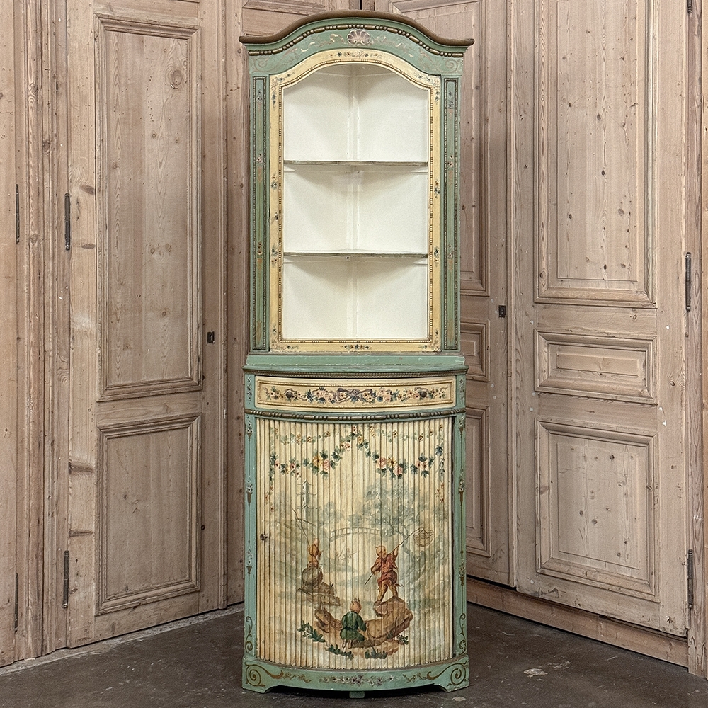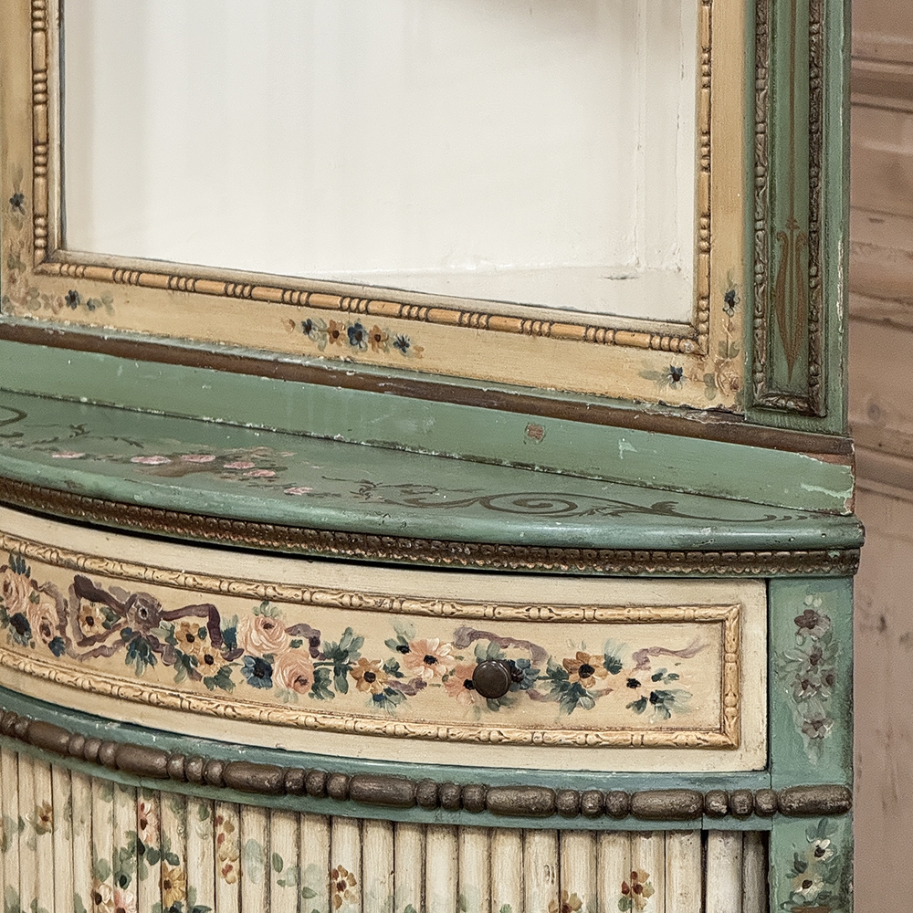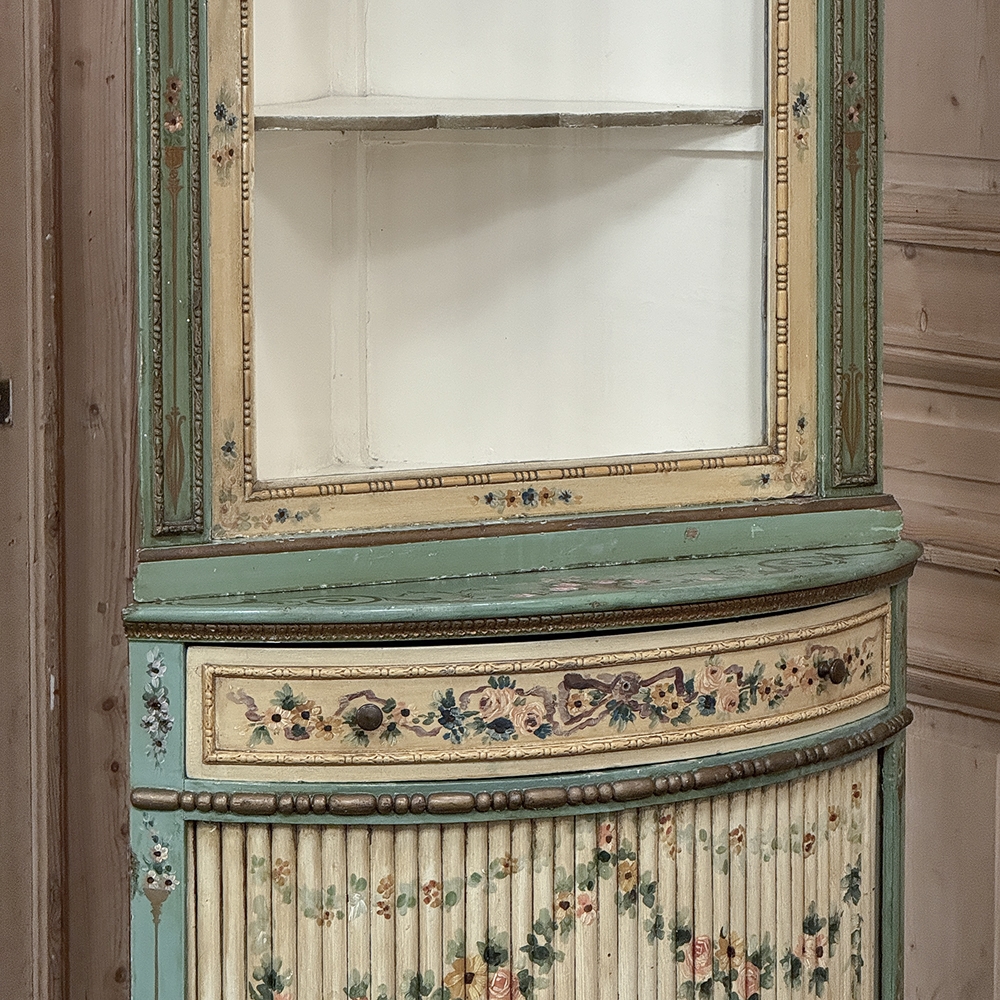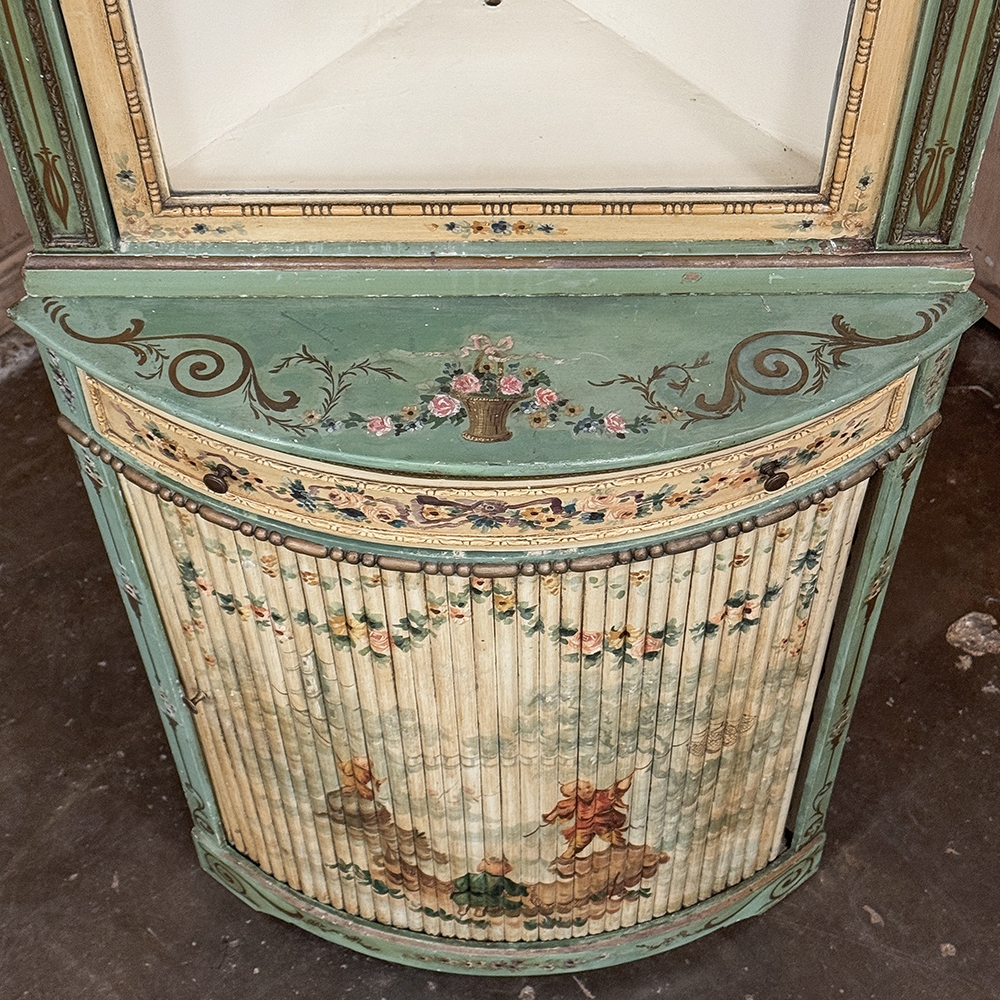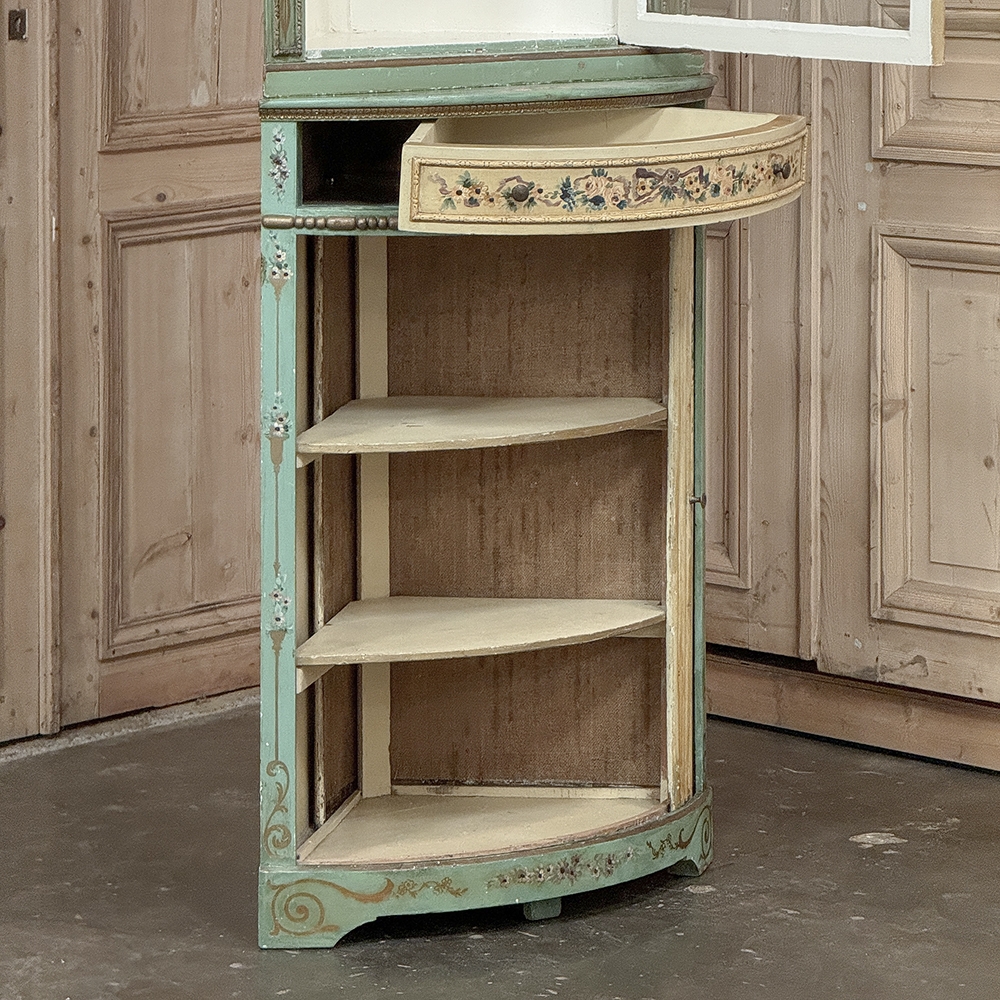 19th Century Italian Neoclassical Painted Corner Cabinet ~ Vitrine is a marvelous combination of artistic form & function! The tailored, classically inspired architecture includes a triangular upper tier topped with a boldly arched crown and glazed door for display, and a quarter-cylinder casework below that provides space for a cabinet and drawer for storage. Subtle molding detail is the rule, with the hand-painted embellishments intended to capture all the attention, which is admirably accomplished. a wide variety of natural-themed and classically executed stylings are lavished on the entire front facade, with an olive green background on the surrounding framework and a more dark almond background on the door and drawer frames. Upon those backgrounds are depictions of shells, flowers and foliates in a broad palette of luscious earth and jewel tones. On the top of the lower cabinet surface, which creates a demilune form, is a delightful basket bursting with roses, for example, with floral sprays all across the drawer underneath, which is fitted with a pair of brass knobs so it can be pulled straight out for access. The lower composition depicts fishermen with a chinoiserie style influence, topped with more floral garlands and sprays. Even the side corners and base board are lavished with artistic hand-painted adornment! Note the hand-hewn chamfered panels on the back side, and the painted interior above for making your displayed collection or heirlooms "pop".
