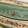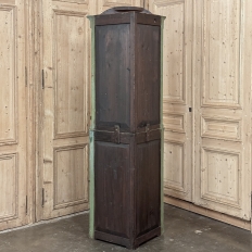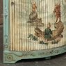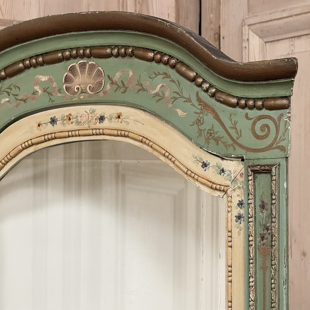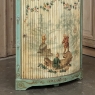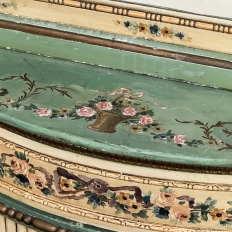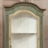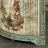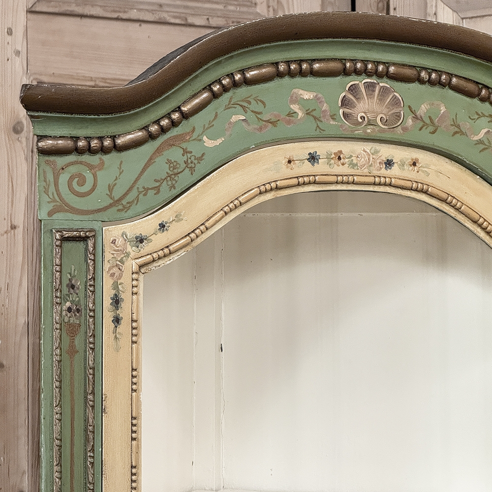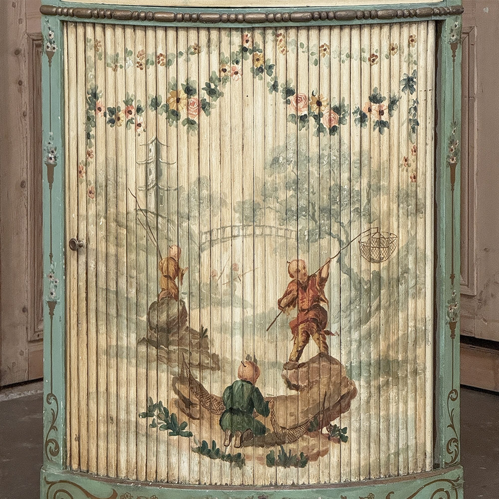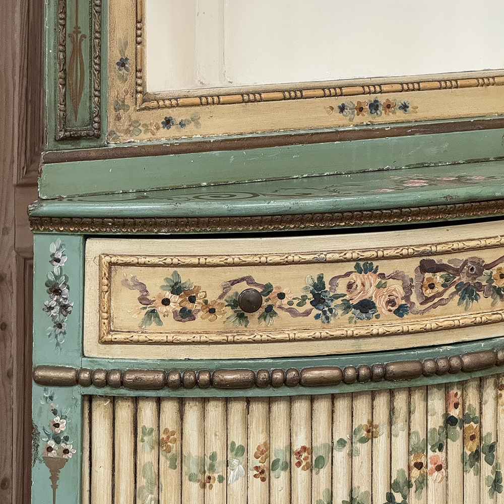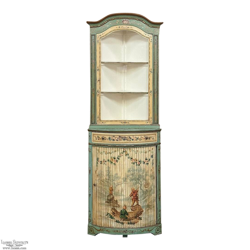 19th Century Italian Neoclassical Painted Corner Cabinet ~ Vitrine is a marvelous combination of artistic form & function! The tailored, classically inspired architecture includes a triangular upper tier topped with a boldly arched crown and glazed door for display, and a quarter-cylinder casework below that provides space for a cabinet and drawer for storage. Subtle molding detail is the rule, with the hand-painted embellishments intended to capture all the attention, which is admirably accomplished. a wide variety of natural-themed and classically executed stylings are lavished on the entire front facade, with an olive green background on the surrounding framework and a more dark almond background on the door and drawer frames. Upon those backgrounds are depictions of shells, flowers and foliates in a broad palette of luscious earth and jewel tones. On the top of the lower cabinet surface, which creates a demilune form, is a delightful basket bursting with roses, for example, with floral sprays all across the drawer underneath, which is fitted with a pair of brass knobs so it can be pulled straight out for access. The lower composition depicts fishermen with a chinoiserie style influence, topped with more floral garlands and sprays. Even the side corners and base board are lavished with artistic hand-painted adornment! Note the hand-hewn chamfered panels on the back side, and the painted interior above for making your displayed collection or heirlooms "pop".