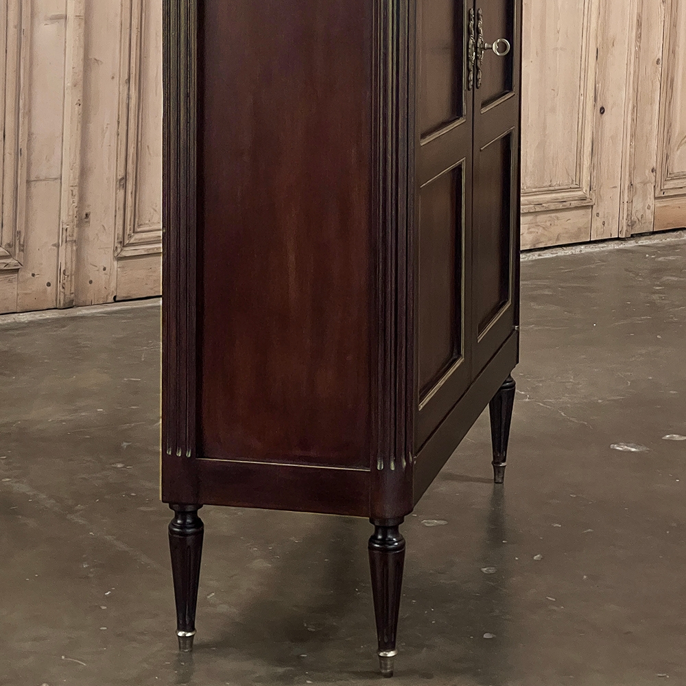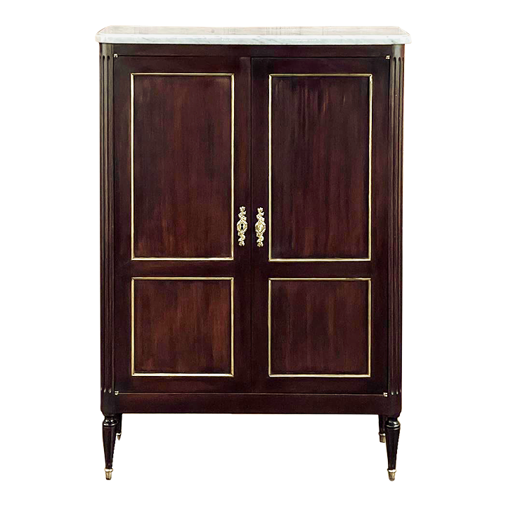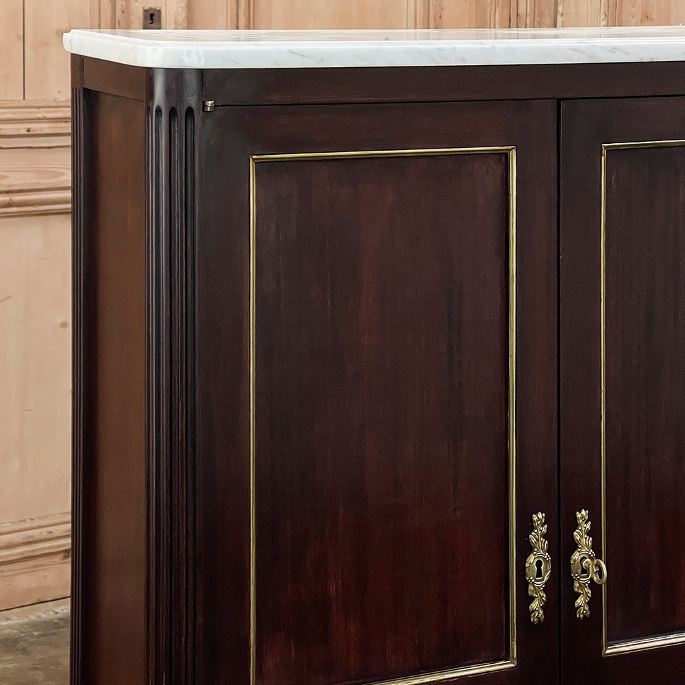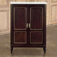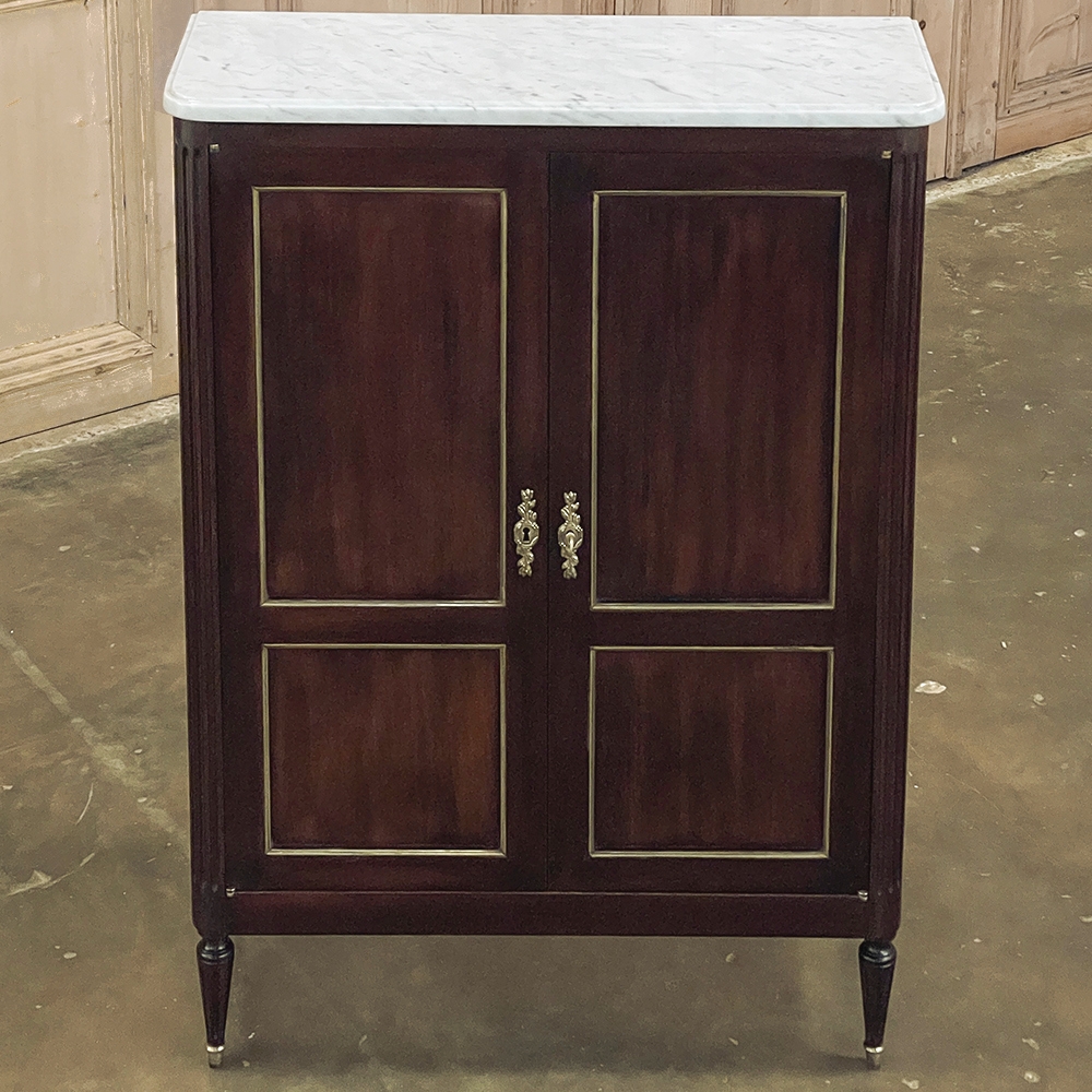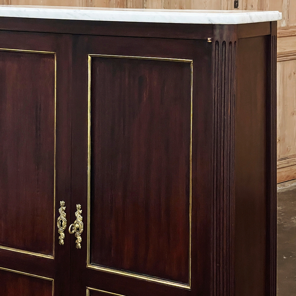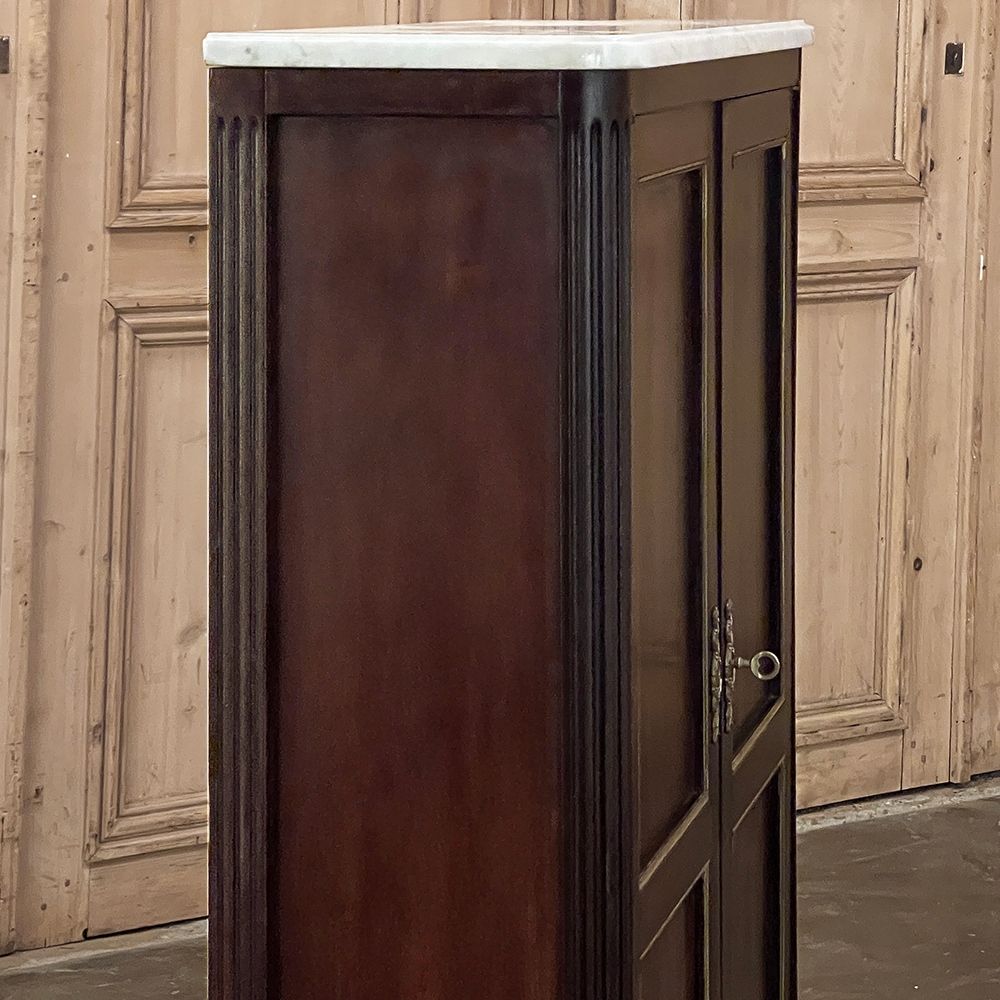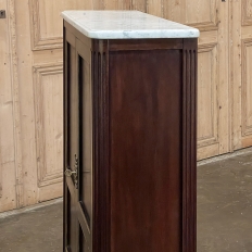 Antique French Directoire Mahogany Petite Cabinet with Carrara Marble Top is an unusual find due to its amazing quality executed on such a diminutive scale! Perfect for cozy niches, tight spots, passageways and other "traffic challenged" areas, it was designed to be less than a foot in depth to hug the wall. Crafted from sumptuous imported mahogany, it features the tailored architecture inherent in the style, with embellishments designed to maximize appreciation for the sheer natural beauty of the wood. Starting with the beveled Carrara marble top, the casework supports the top thanks to solid cornerposts, the front ones of which are rounded and fluted. Tailored recessed panels appear on each side, and four tapered and fluted legs with brass tips provide support. The primary style statement lies in the cabinet doors, defined by two panels each, with the panels outlined in brass molding trim. A pair of cast brass key guards in the neoclassical manner provide a focal point, and the doors open to reveal three surfaces within, including two adjustable shelves.