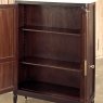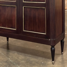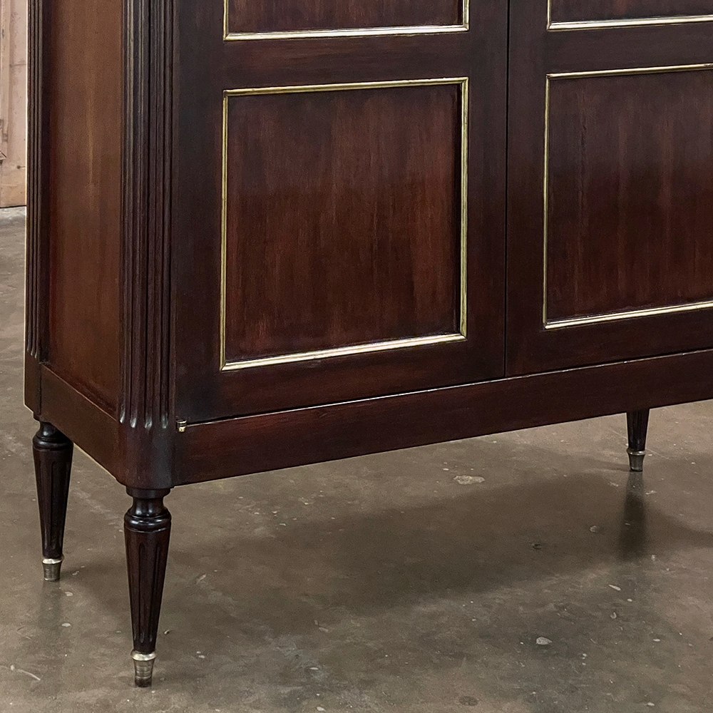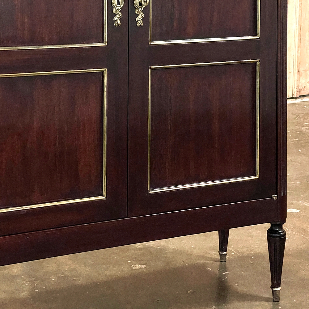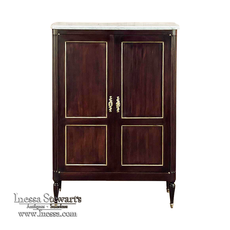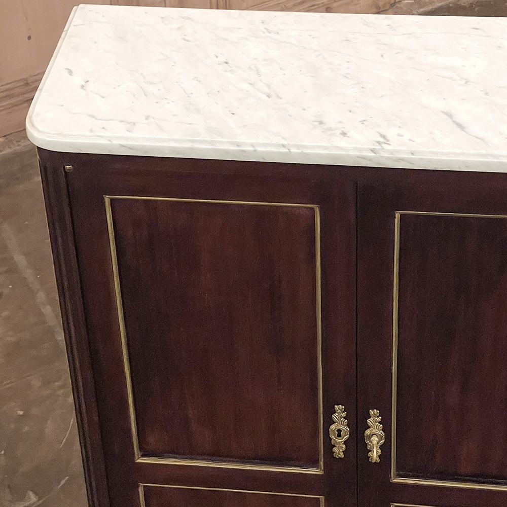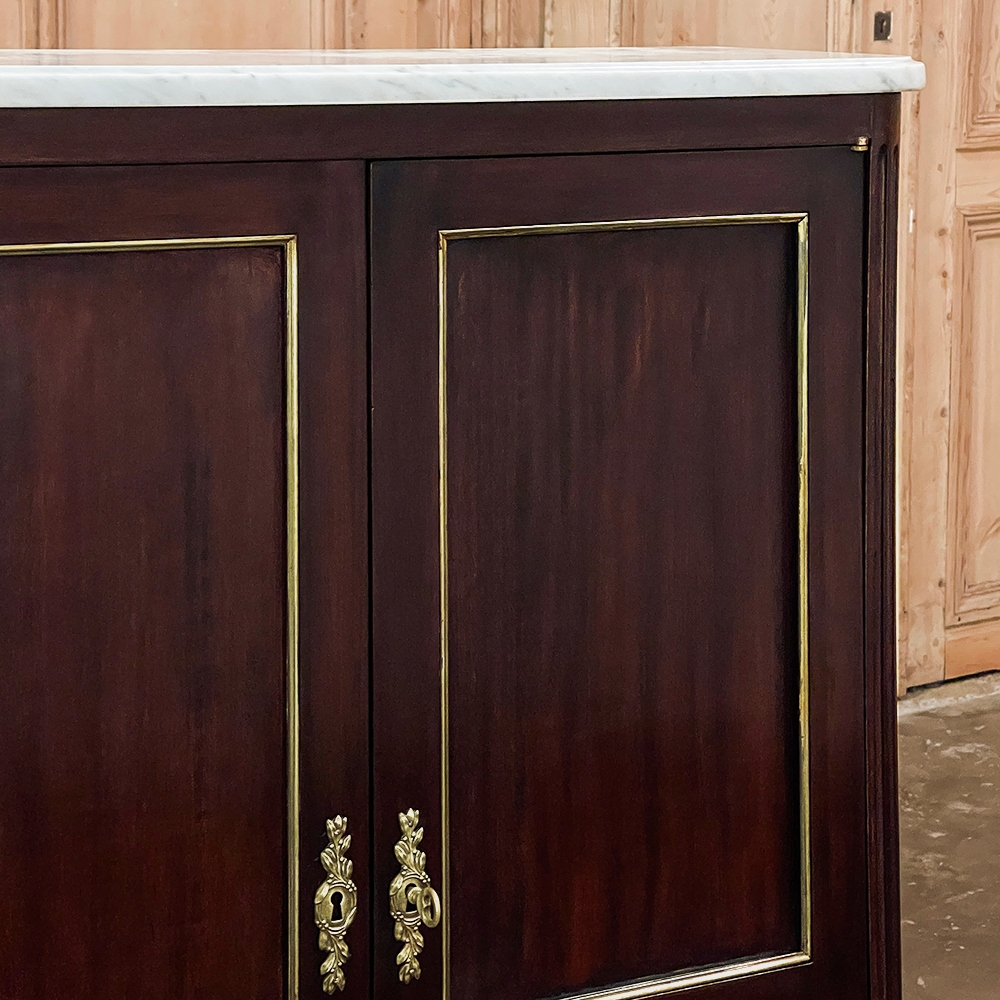 Antique French Directoire Mahogany Petite Cabinet with Carrara Marble Top is an unusual find due to its amazing quality executed on such a diminutive scale! Perfect for cozy niches, tight spots, passageways and other "traffic challenged" areas, it was designed to be less than a foot in depth to hug the wall. Crafted from sumptuous imported mahogany, it features the tailored architecture inherent in the style, with embellishments designed to maximize appreciation for the sheer natural beauty of the wood. Starting with the beveled Carrara marble top, the casework supports the top thanks to solid cornerposts, the front ones of which are rounded and fluted. Tailored recessed panels appear on each side, and four tapered and fluted legs with brass tips provide support. The primary style statement lies in the cabinet doors, defined by two panels each, with the panels outlined in brass molding trim. A pair of cast brass key guards in the neoclassical manner provide a focal point, and the doors open to reveal three surfaces within, including two adjustable shelves.