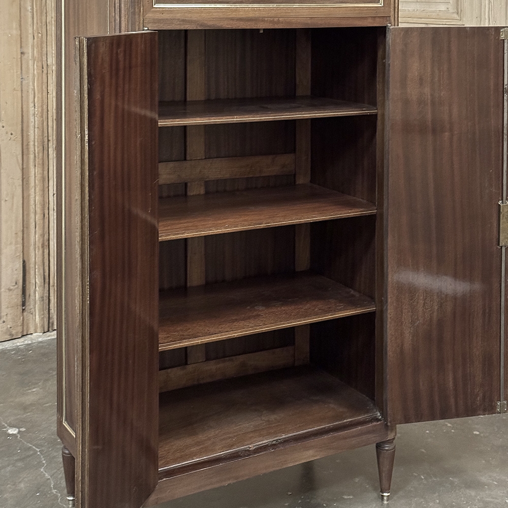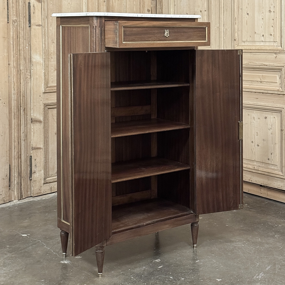 Antique French Directoire Style Mahogany Cabinet with Carrara Marble features a tailored, classic look that will never go out of style! Crafted from exotic imported mahogany, it features a design that includes a single full width drawer at top, but a cabinet with three shelves (four surfaces) below to provide much more storage than one would think possible from such a small footprint and impact on the space in the room. Topped with luxurious Carrara marble for the perfect display and what not surface, it is enhanced with rounded, fluted corners and brass trim that outlines the panels on the sides and in front. Cast brass key guards add a nice accent, as do the tapered legs with brass feet.