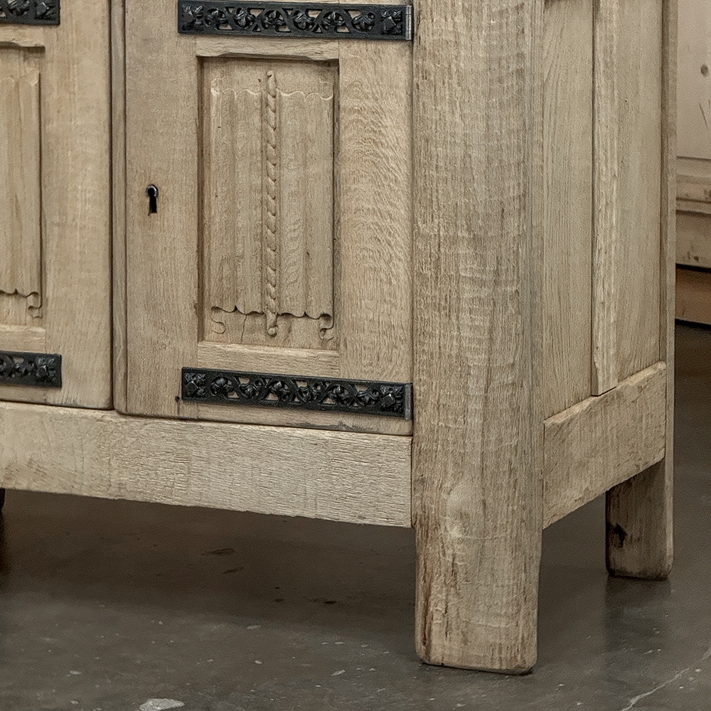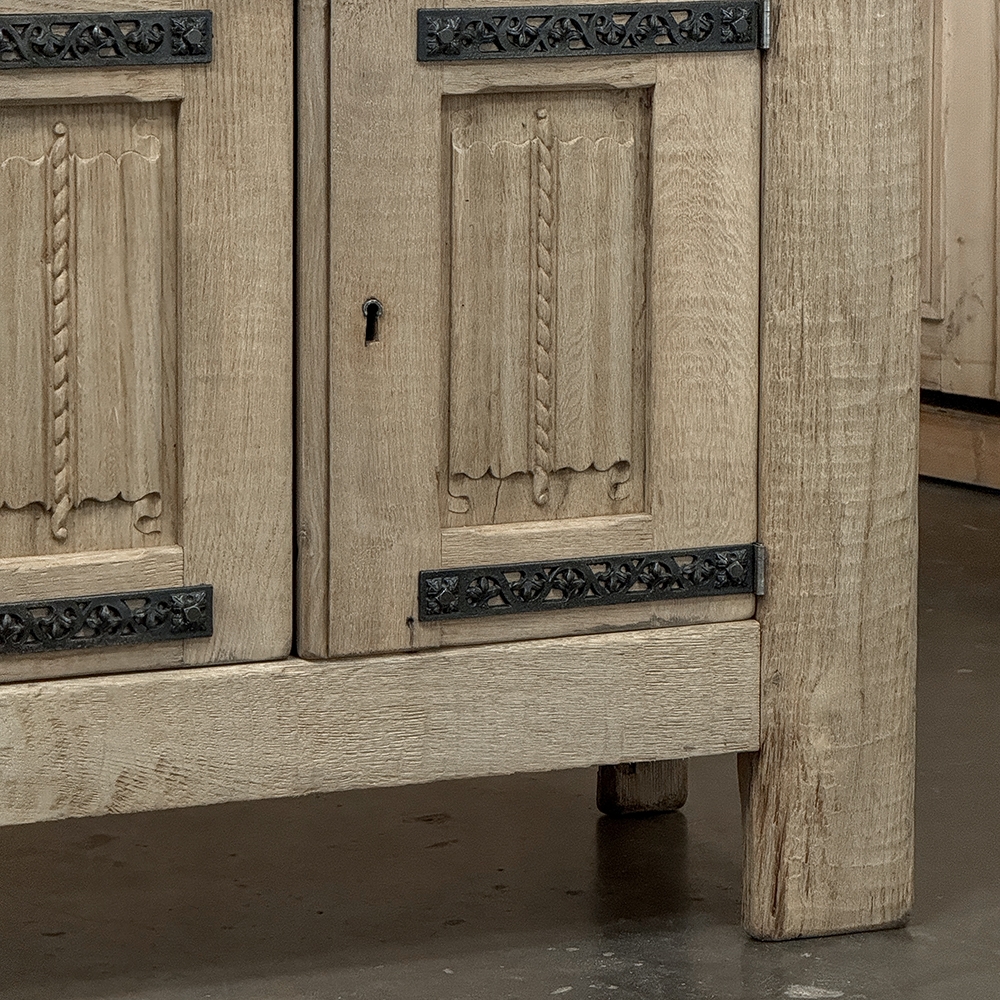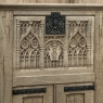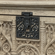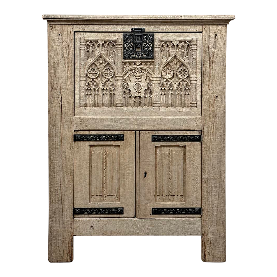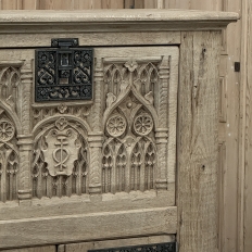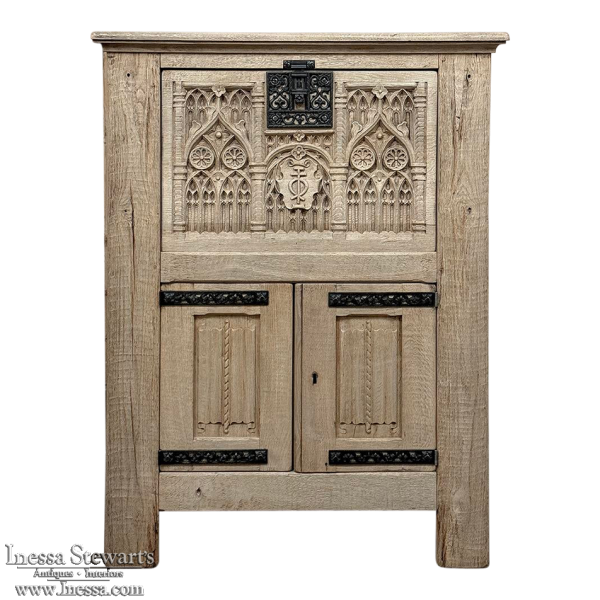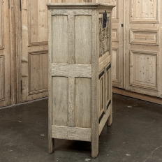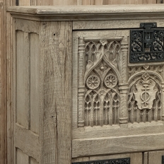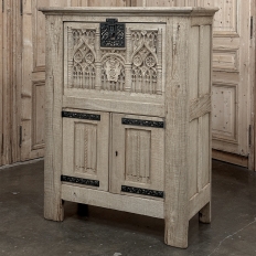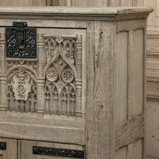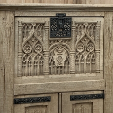 Antique French Gothic Revival Dry Bar ~ Raised Cabinet in Stripped Oak combines extraordinarily sturdy architecture with geometrically-inspired carved detail inspired by the Gothic style with origins in the 12th century! The design includes sturdy solid oak planks on top transitioning to the massive corner posts which flank the four recessed side panels on each side, and the front facade which consists of a bottom-hinged drop-down top cabinet door, and two conventional cabinet doors underneath that. Although the lower cabinets are adorned with interesting linen fold carving, the upper cabinet ha an amazing display of sculpture with all the hallmarks of the Gothic Revival in three segments framed by half-round carved columns. Additional embellishment is provided by the intricately cast strap hinges on the doors below, and the amazingly detailed lock plate on the upper cabinet. Both the upper and lower cabinets have a single shelf for two surfaces each, while the extra-stout upper door lowers to the horizontal position creating a serving surface supported by the hinges in back and two chains on either side. Painstakingly stripped using our proprietary process that retains the patina and sheer natural beauty of the old wood, all performed by our expert in-house staff.