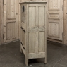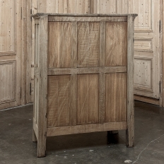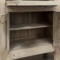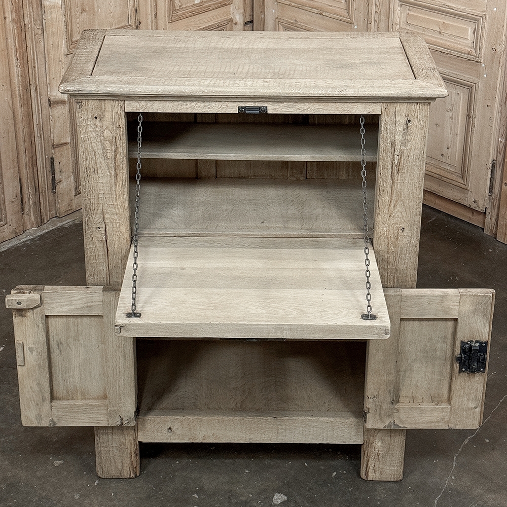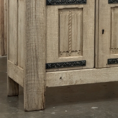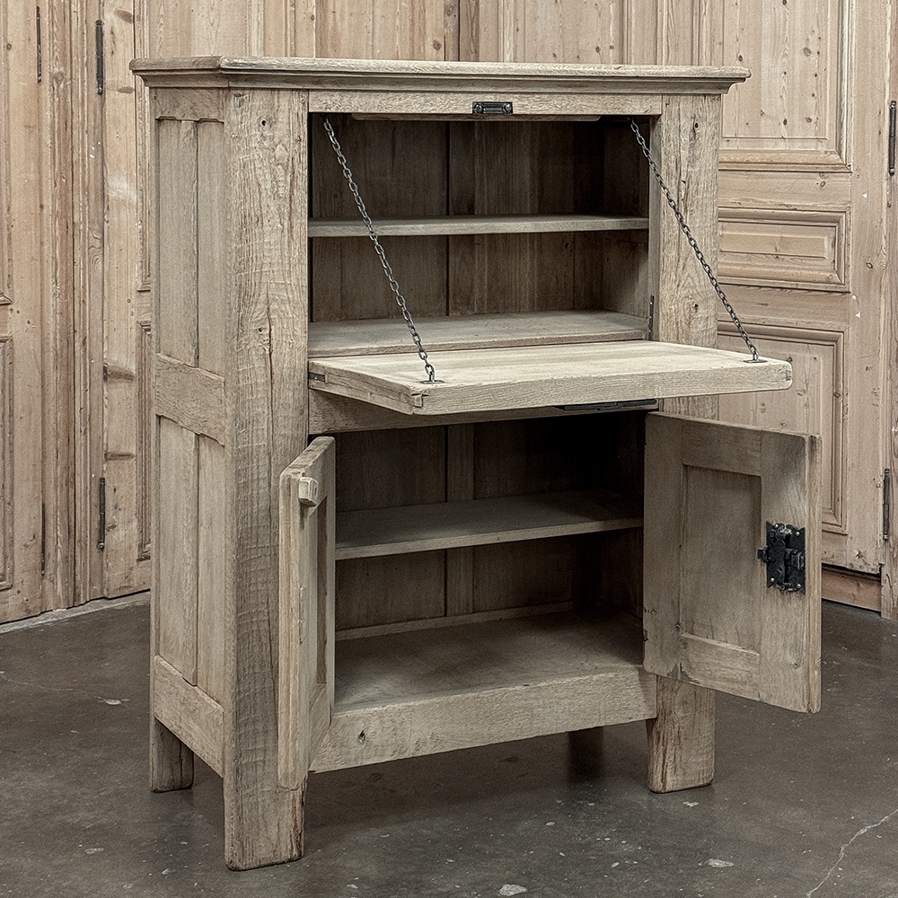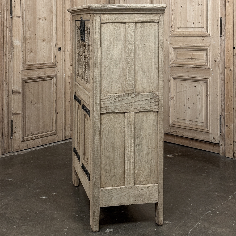 Antique French Gothic Revival Dry Bar ~ Raised Cabinet in Stripped Oak combines extraordinarily sturdy architecture with geometrically-inspired carved detail inspired by the Gothic style with origins in the 12th century! The design includes sturdy solid oak planks on top transitioning to the massive corner posts which flank the four recessed side panels on each side, and the front facade which consists of a bottom-hinged drop-down top cabinet door, and two conventional cabinet doors underneath that. Although the lower cabinets are adorned with interesting linen fold carving, the upper cabinet ha an amazing display of sculpture with all the hallmarks of the Gothic Revival in three segments framed by half-round carved columns. Additional embellishment is provided by the intricately cast strap hinges on the doors below, and the amazingly detailed lock plate on the upper cabinet. Both the upper and lower cabinets have a single shelf for two surfaces each, while the extra-stout upper door lowers to the horizontal position creating a serving surface supported by the hinges in back and two chains on either side. Painstakingly stripped using our proprietary process that retains the patina and sheer natural beauty of the old wood, all performed by our expert in-house staff.