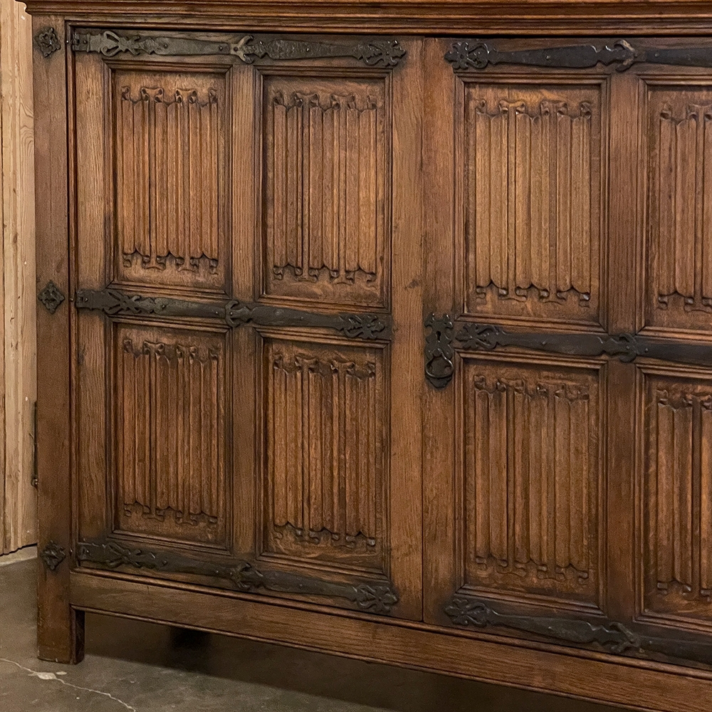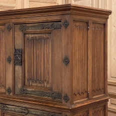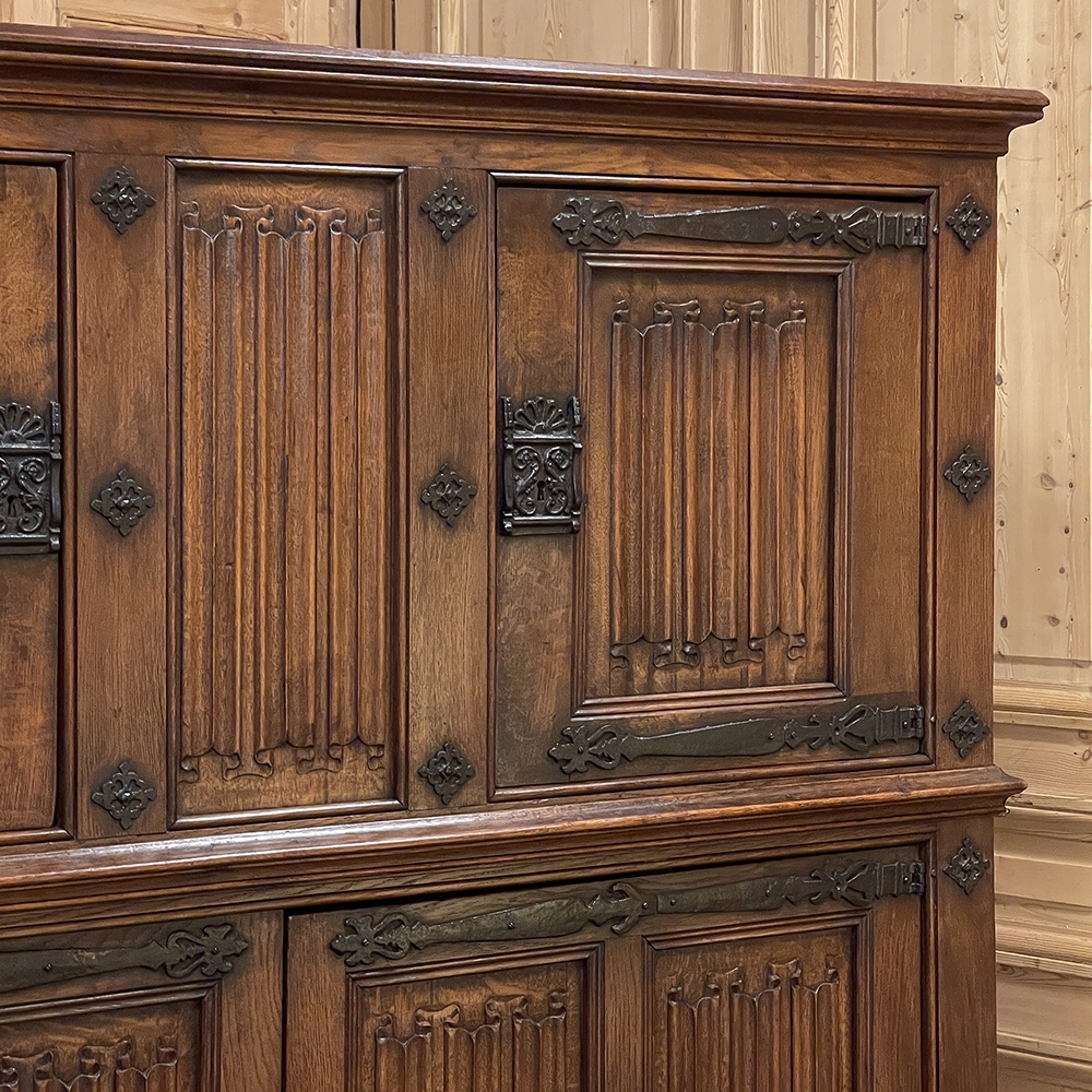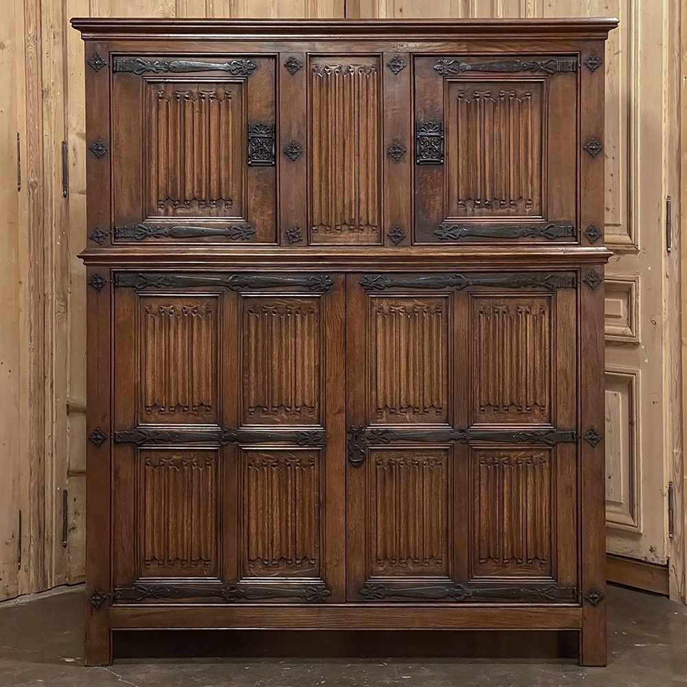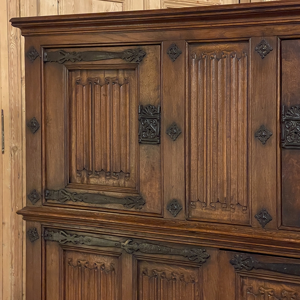 Antique French Gothic Wardrobe ~ Cabinet is an intriguing example of the style, with no less than 23 hand-carved linenfold panels combining with long, forged strap hinges, rosettes and lockworks to create a timeless Old World look! Hand-crafted from solid oak, the hinges are scaled to cover almost the entire width of the doors onto which they're mounted to create wonderful decorative accents. Rosettes appear in abundance to accent the pilasters and upper stile. Bold molding creates the crown and separates the upper from lower tiers. Doors open wide to reveal capacious storage with original shelving inside, making this piece ideal for organizing just about anything! The perfect choice for rooms with limited closet space.