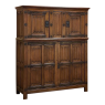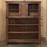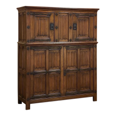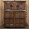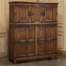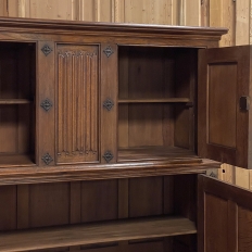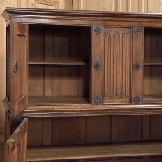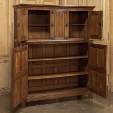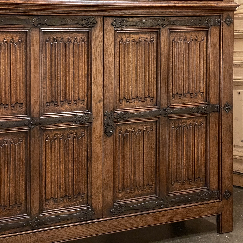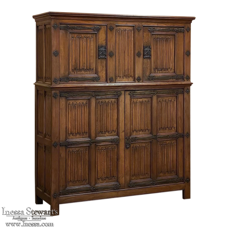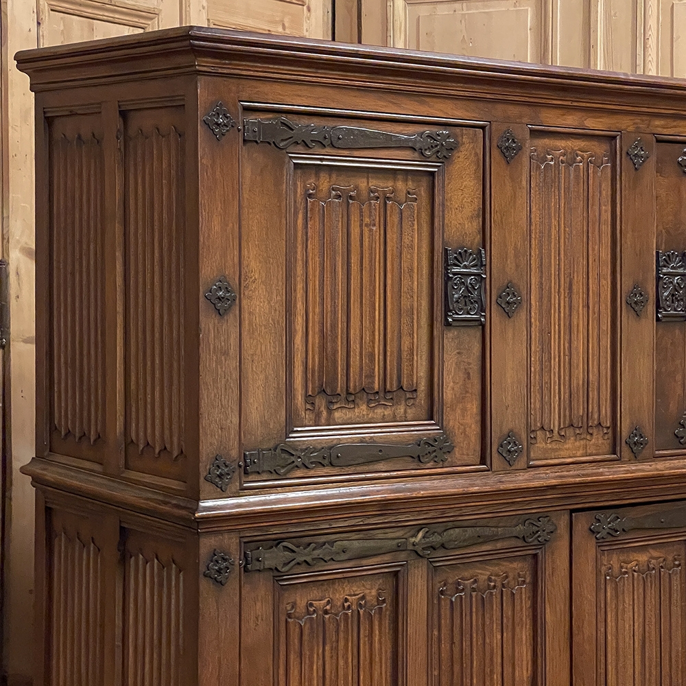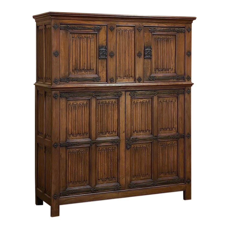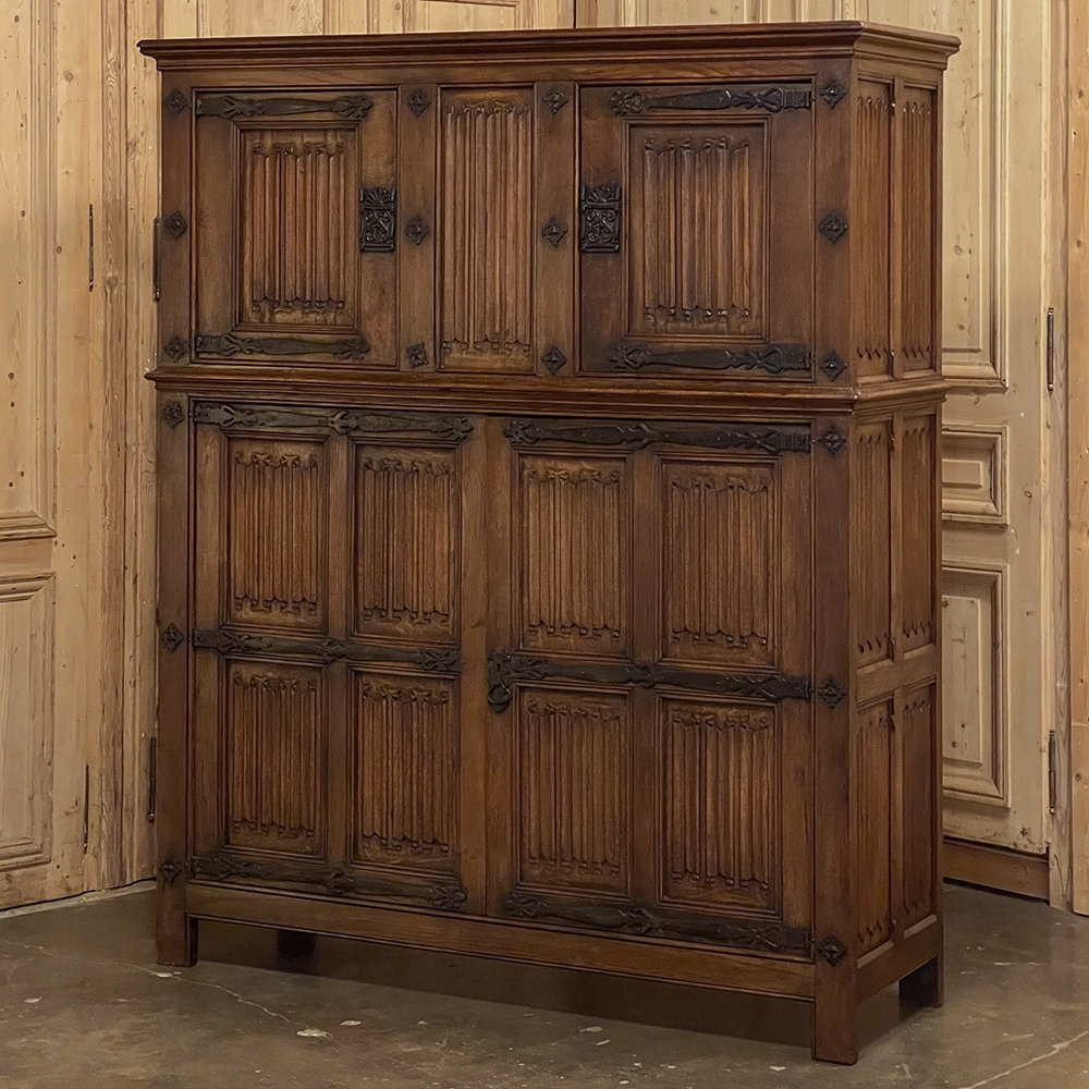 Antique French Gothic Wardrobe ~ Cabinet is an intriguing example of the style, with no less than 23 hand-carved linenfold panels combining with long, forged strap hinges, rosettes and lockworks to create a timeless Old World look! Hand-crafted from solid oak, the hinges are scaled to cover almost the entire width of the doors onto which they're mounted to create wonderful decorative accents. Rosettes appear in abundance to accent the pilasters and upper stile. Bold molding creates the crown and separates the upper from lower tiers. Doors open wide to reveal capacious storage with original shelving inside, making this piece ideal for organizing just about anything! The perfect choice for rooms with limited closet space.
