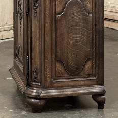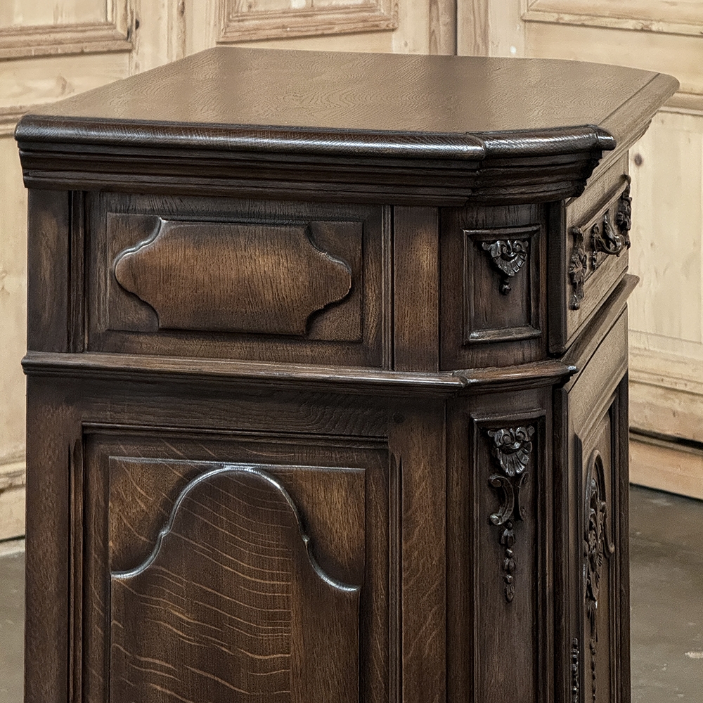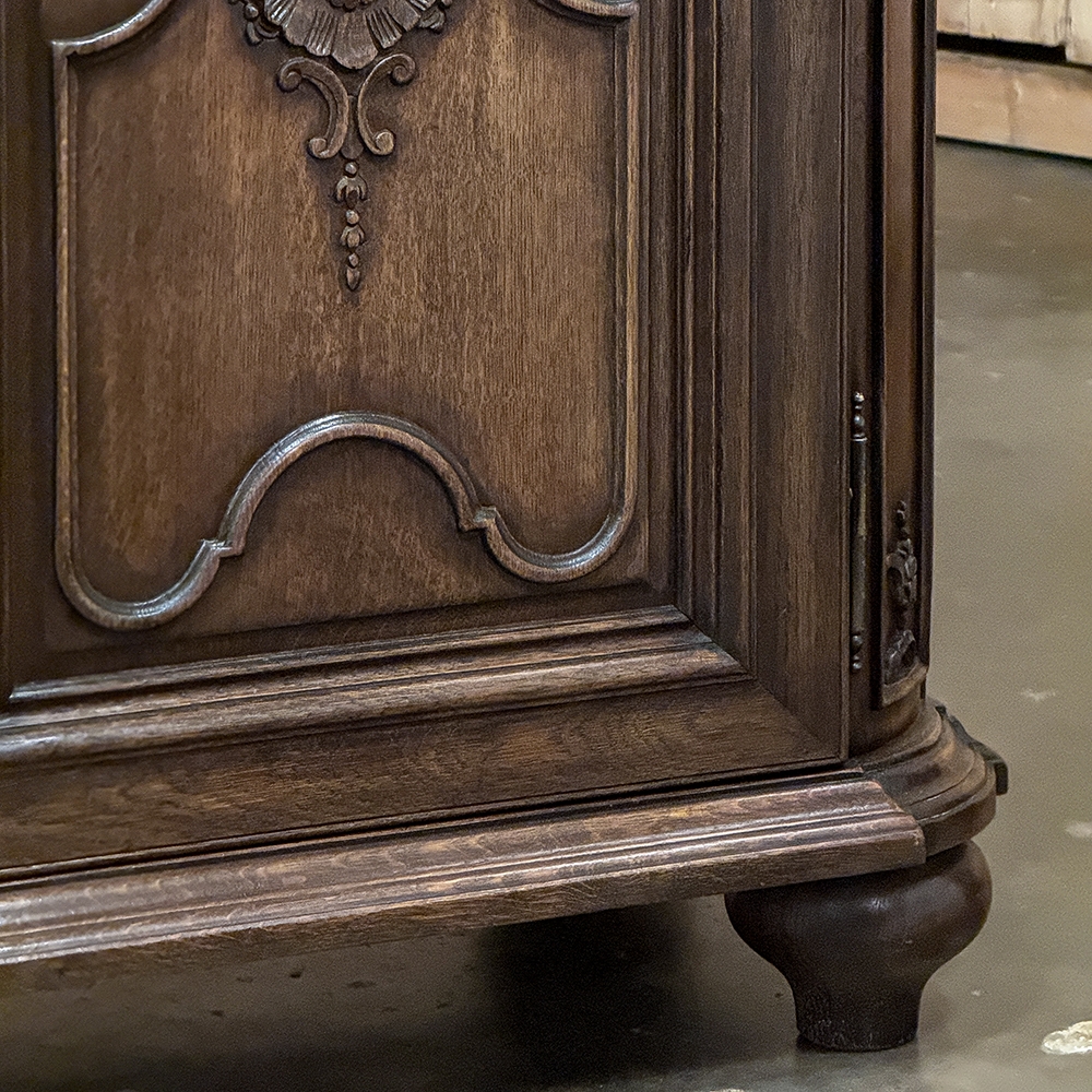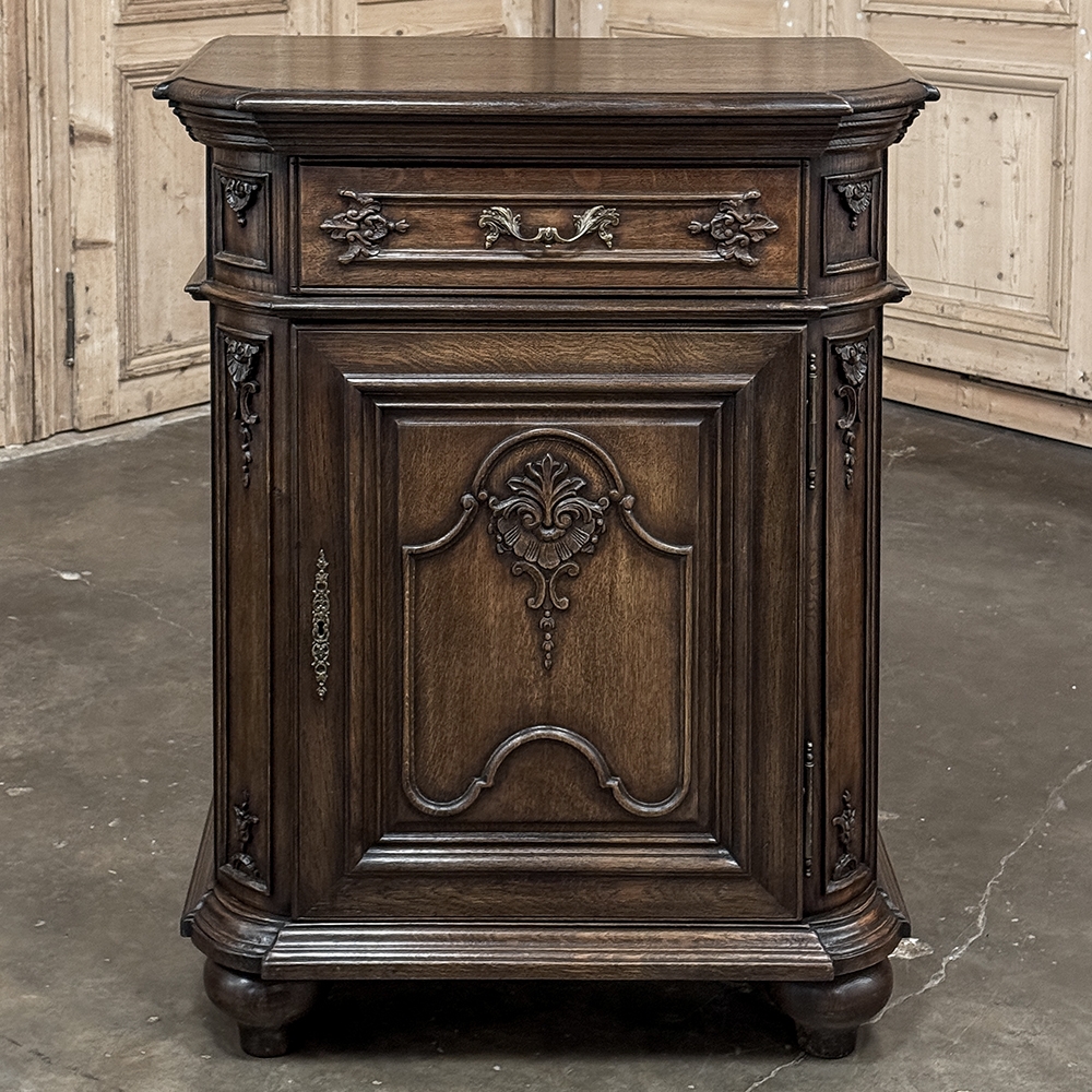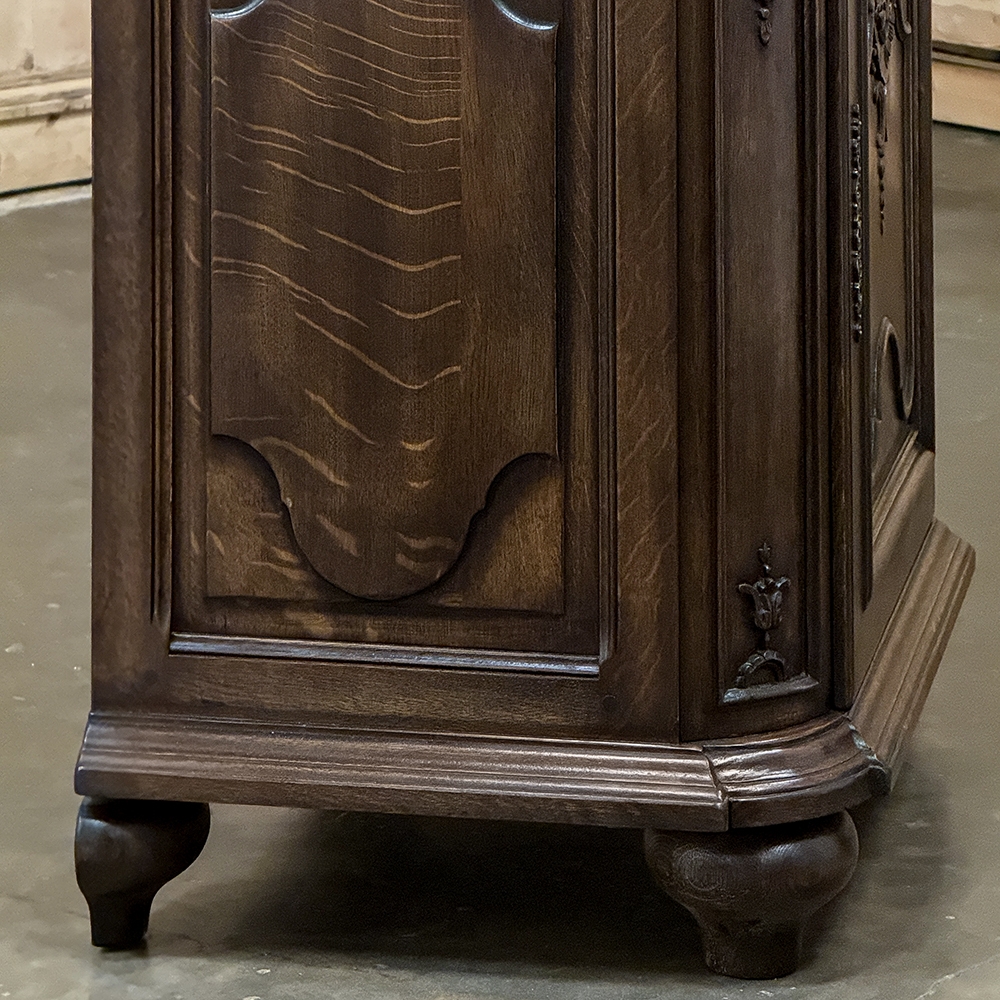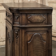 Antique French Louis XIV Confiturier ~ Cabinet is basically a one door buffet, and as such, the design is the perfect choice to make one-of-a-kind bathroom vanities, add a convenient storage and display surface to a cozy niche, or to fit in a special narrow place anywhere in the home or office! Hand-crafted from solid oak, it features a bold molding design from top to bottom with rounded corners that have carved detail, carvings on the door and drawer, and raised panels on each side making it visually appealing from any angle. Cast brass drawer pull and door key guard add a nice decorative touch. Raised on tulip-shaped bun feet, most of our clients choose to remove the feet to drop it down to more traditional heights when installing sinks. Such a sturdy cabinet is also a great choice for a youngster's room, and is a keepsake your child can enjoy their entire life!