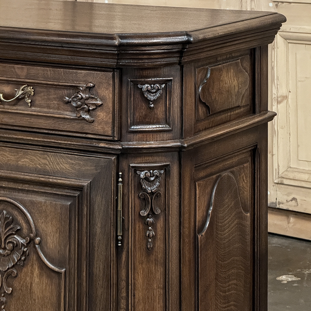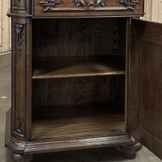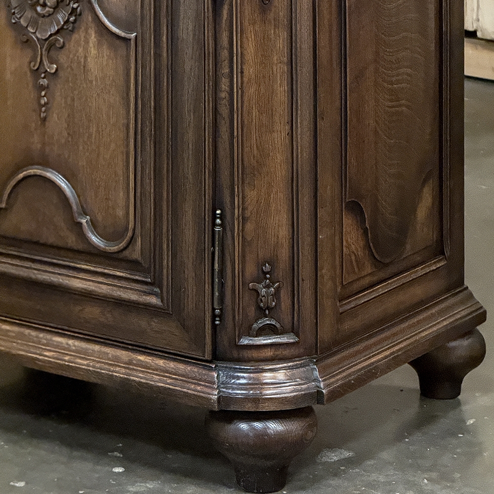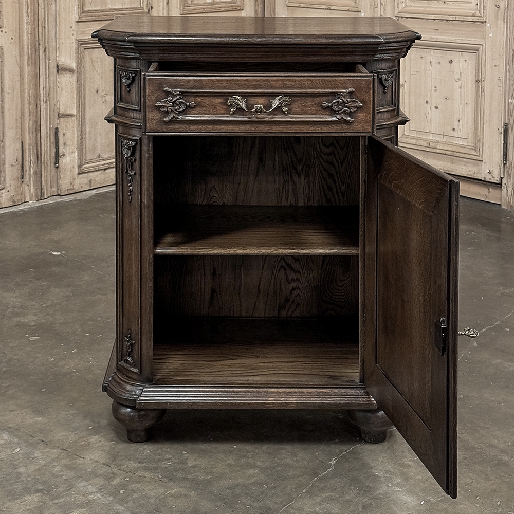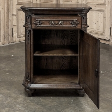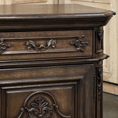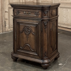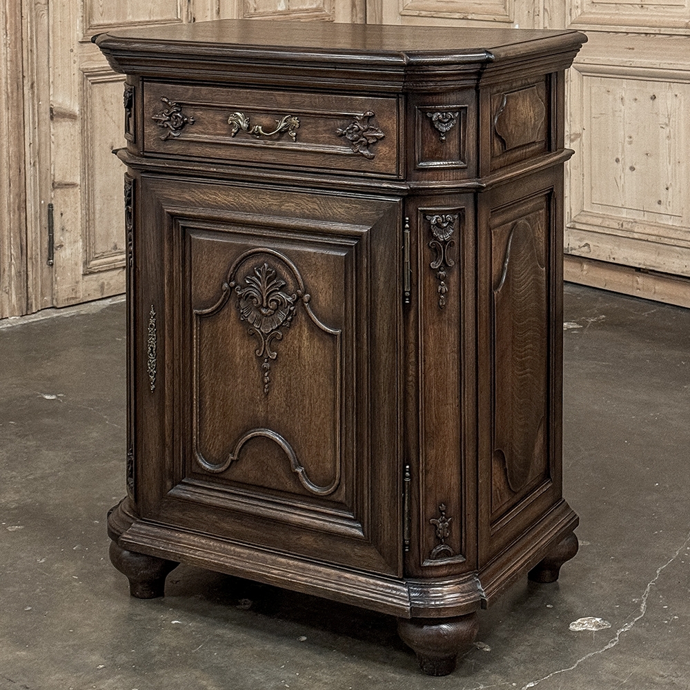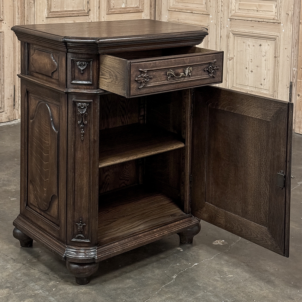Antique French Louis XIV Confiturier ~ Cabinet is basically a one door buffet, and as such, the design is the perfect choice to make one-of-a-kind bathroom vanities, add a convenient storage and display surface to a cozy niche, or to fit in a special narrow place anywhere in the home or office! Hand-crafted from solid oak, it features a bold molding design from top to bottom with rounded corners that have carved detail, carvings on the door and drawer, and raised panels on each side making it visually appealing from any angle. Cast brass drawer pull and door key guard add a nice decorative touch. Raised on tulip-shaped bun feet, most of our clients choose to remove the feet to drop it down to more traditional heights when installing sinks. Such a sturdy cabinet is also a great choice for a youngster's room, and is a keepsake your child can enjoy their entire life!