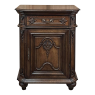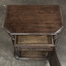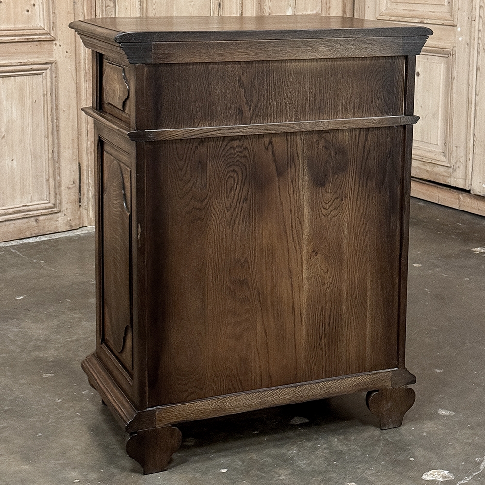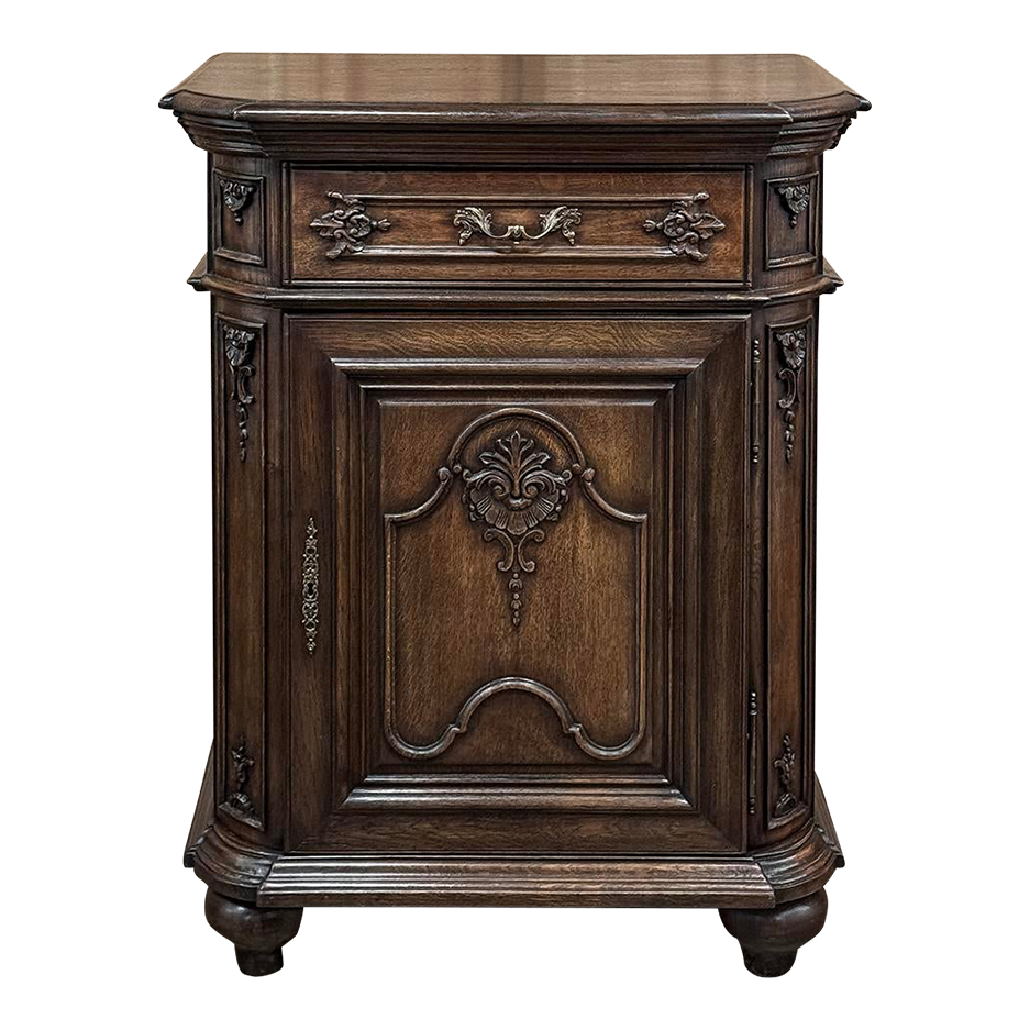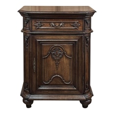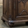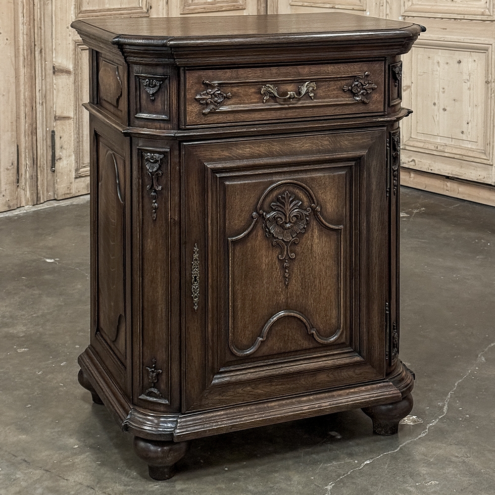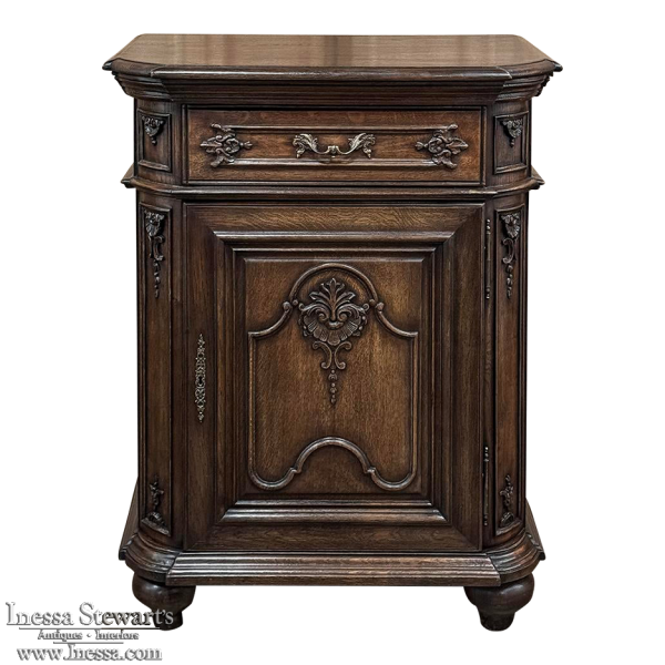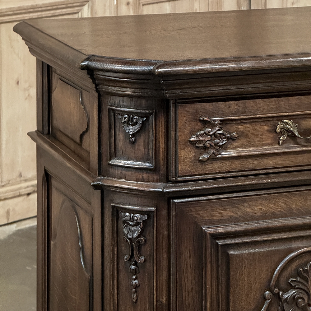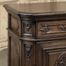 Antique French Louis XIV Confiturier ~ Cabinet is basically a one door buffet, and as such, the design is the perfect choice to make one-of-a-kind bathroom vanities, add a convenient storage and display surface to a cozy niche, or to fit in a special narrow place anywhere in the home or office! Hand-crafted from solid oak, it features a bold molding design from top to bottom with rounded corners that have carved detail, carvings on the door and drawer, and raised panels on each side making it visually appealing from any angle. Cast brass drawer pull and door key guard add a nice decorative touch. Raised on tulip-shaped bun feet, most of our clients choose to remove the feet to drop it down to more traditional heights when installing sinks. Such a sturdy cabinet is also a great choice for a youngster's room, and is a keepsake your child can enjoy their entire life!