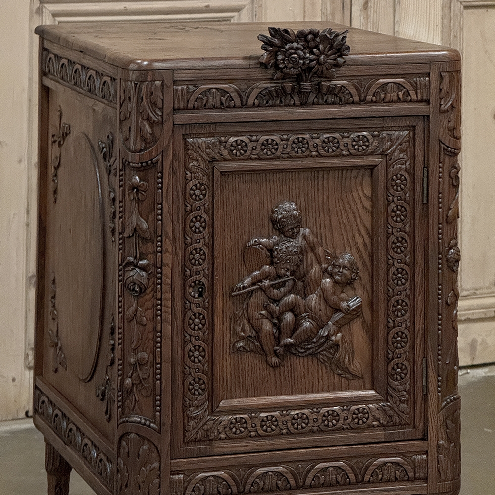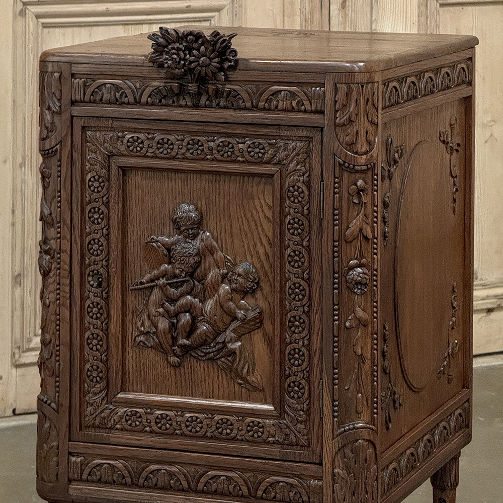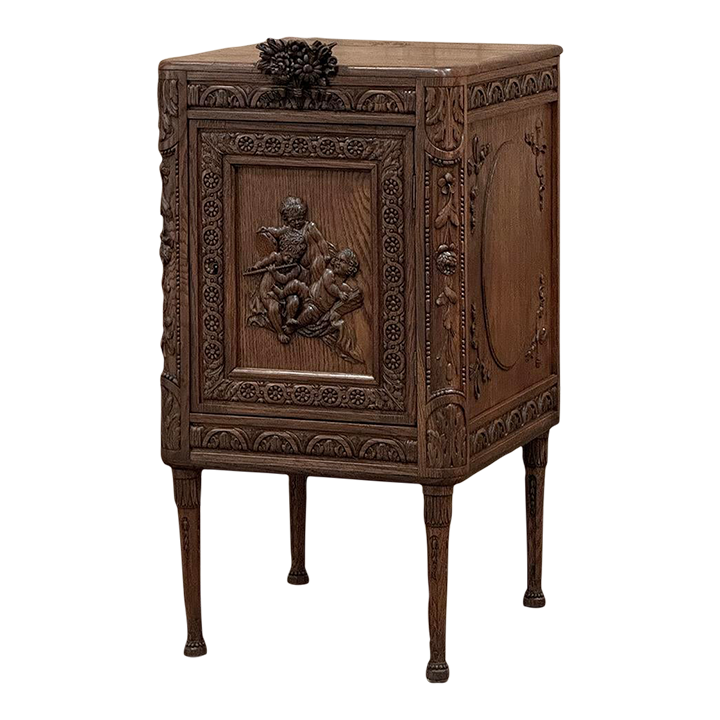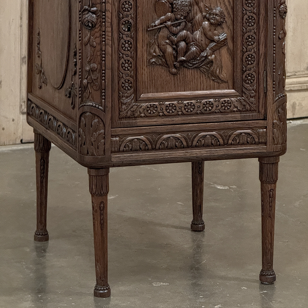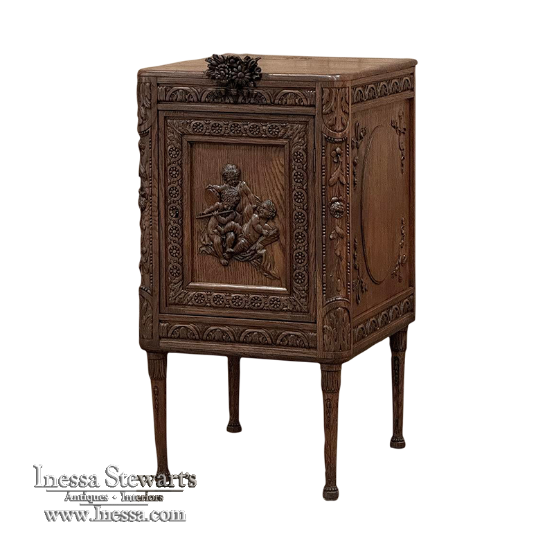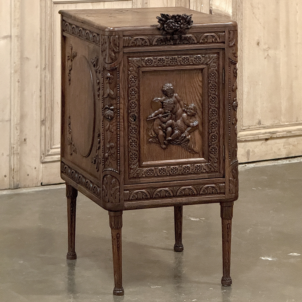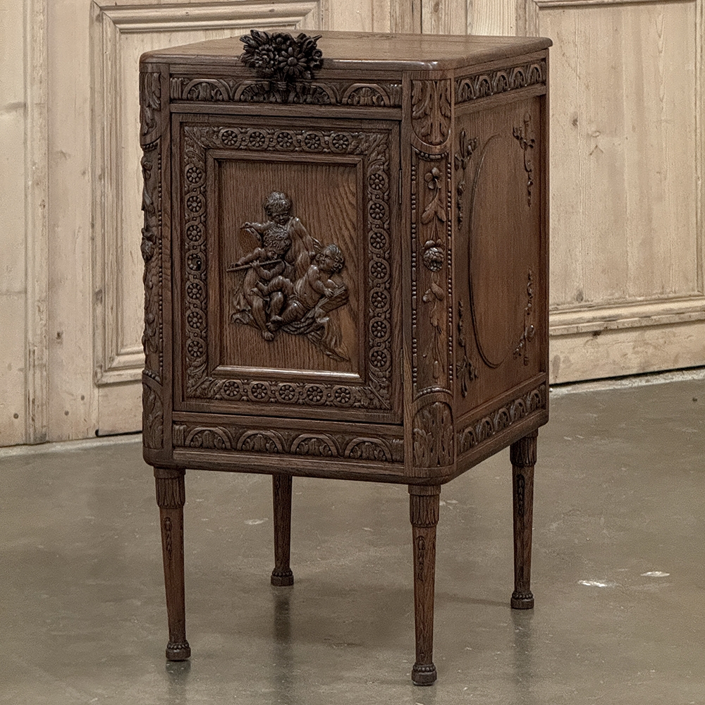 Antique French Louis XVI Neoclassical Argentier ~ Silver Cabinet ~ Nightstand is truly an unusual find ~ and a versatile one at that! Crafted on a diminutive scale similar to that of a larger nightstand, it features a rather spacious interior cabinet with no drawer that used to be lined in silver felt which has not survived. Carved with wonderful detail on all three sides, it makes an excellent choice for any room, and for most any purpose. The charming trio of cherub musicians in full relief on the door panel seem to be in the midst of a lively tune, and are framed by Greek coin rosettes all around. The framework around the door itself is carved with demilune rosettes, with florals down the rounded cornerposts. Four tapered legs with lotus motif provide support, but one of the most intriguing aspects of the design is a raised prominent floral bouquet in front that rises above the top surface.
