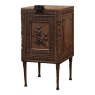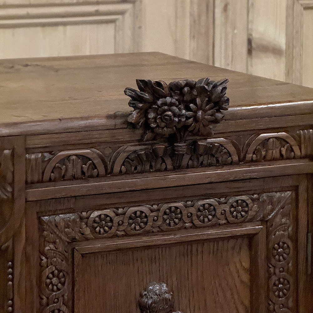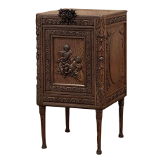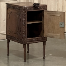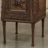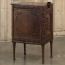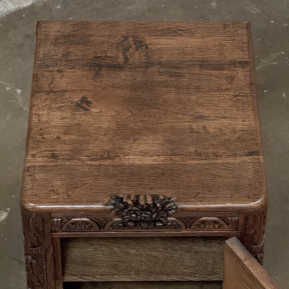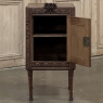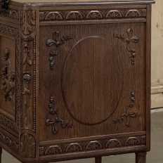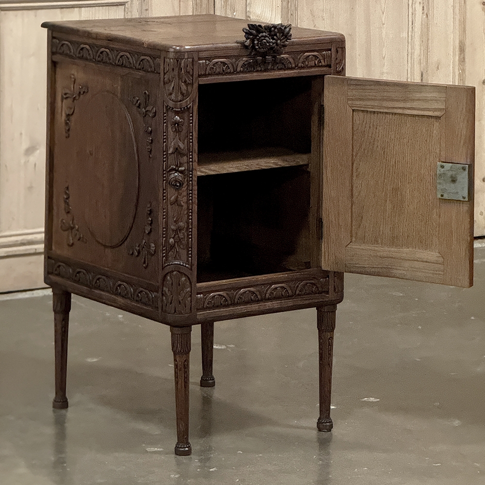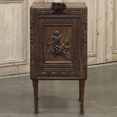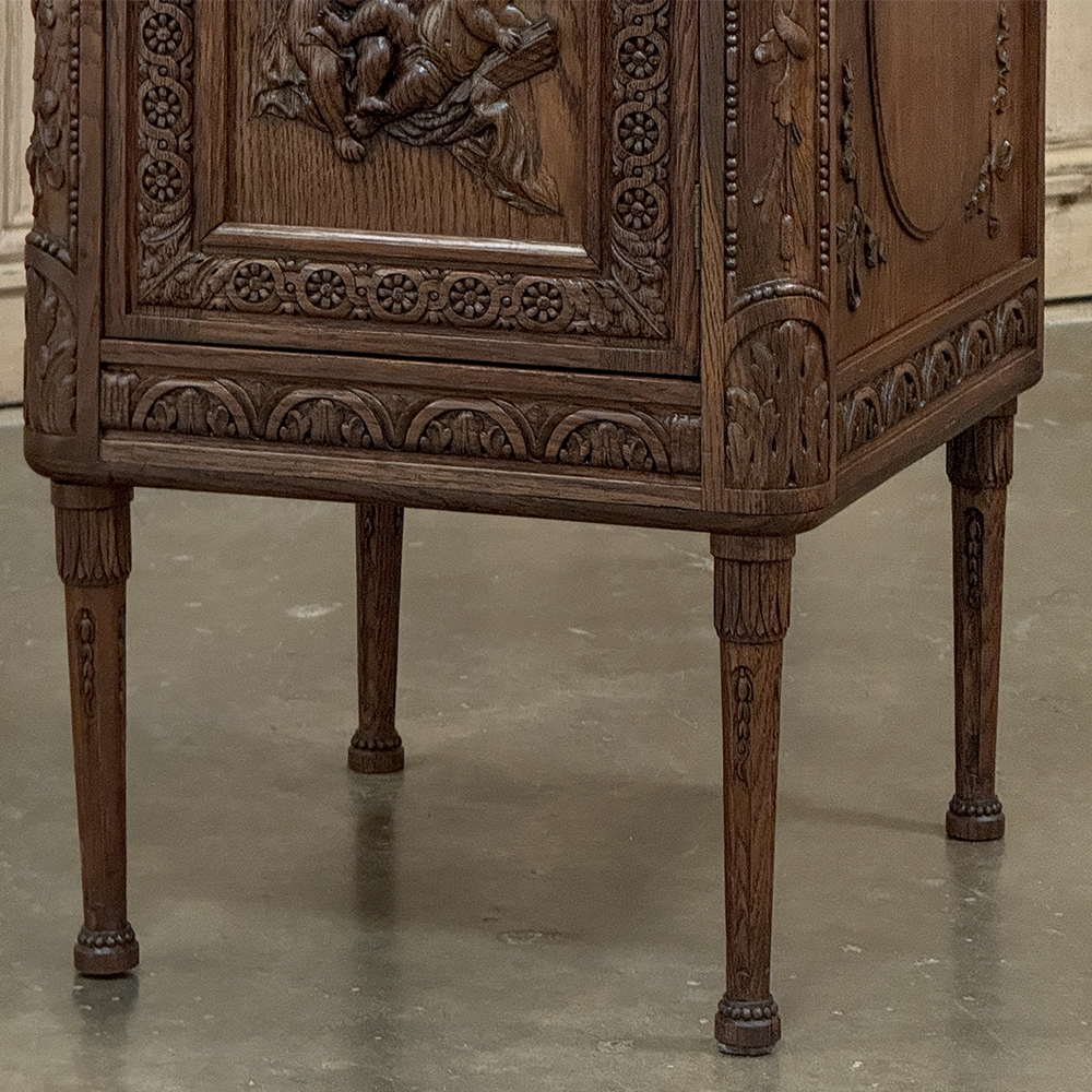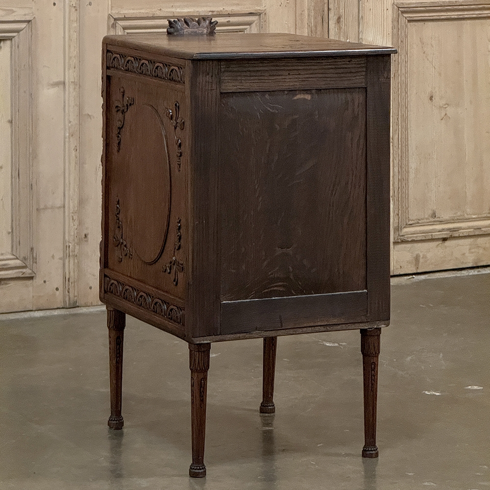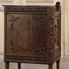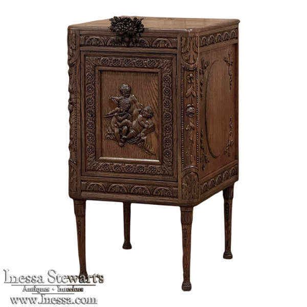 Antique French Louis XVI Neoclassical Argentier ~ Silver Cabinet ~ Nightstand is truly an unusual find ~ and a versatile one at that! Crafted on a diminutive scale similar to that of a larger nightstand, it features a rather spacious interior cabinet with no drawer that used to be lined in silver felt which has not survived. Carved with wonderful detail on all three sides, it makes an excellent choice for any room, and for most any purpose. The charming trio of cherub musicians in full relief on the door panel seem to be in the midst of a lively tune, and are framed by Greek coin rosettes all around. The framework around the door itself is carved with demilune rosettes, with florals down the rounded cornerposts. Four tapered legs with lotus motif provide support, but one of the most intriguing aspects of the design is a raised prominent floral bouquet in front that rises above the top surface.