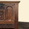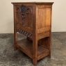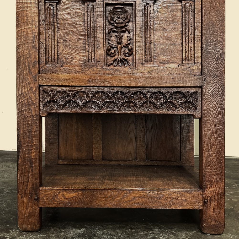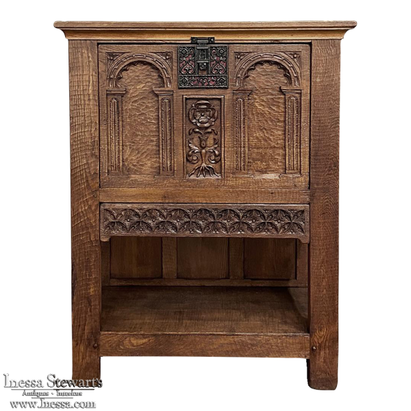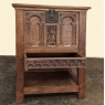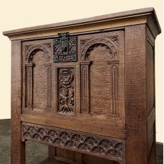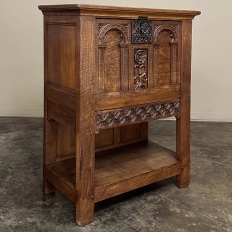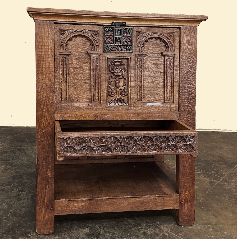 SaleAntique Gothic Revival Raised Cabinet ~ Dry Bar ~ Dry Bar will add an Old World yet charming rustic enhancement to any room. Designed as a dry bar, its drop down front reveals a cabinet that can be used for a wide variety of storage requirements. Crafted from solid oak all around, even on the top which is plenty sturdy enough for a heavy display item such as a bronze statue, it consists of four timbers serving as corner posts and a restrained panel design on each side, as well as below the cabinet overlooking the open shelf. The fine carved detail appears only on the full width drawer with a repeating coin design, and the drop down door itself with a pair of arched colonnades flanking a richly sculpted panel of stylized foliates at the center. A finely cast iron lockwork plate contains the latch lock, and a brace of chains support the door when fully opened greatly increasing the work/preparation area, even though the entire piece including molding is only 19" deep from the wall!