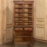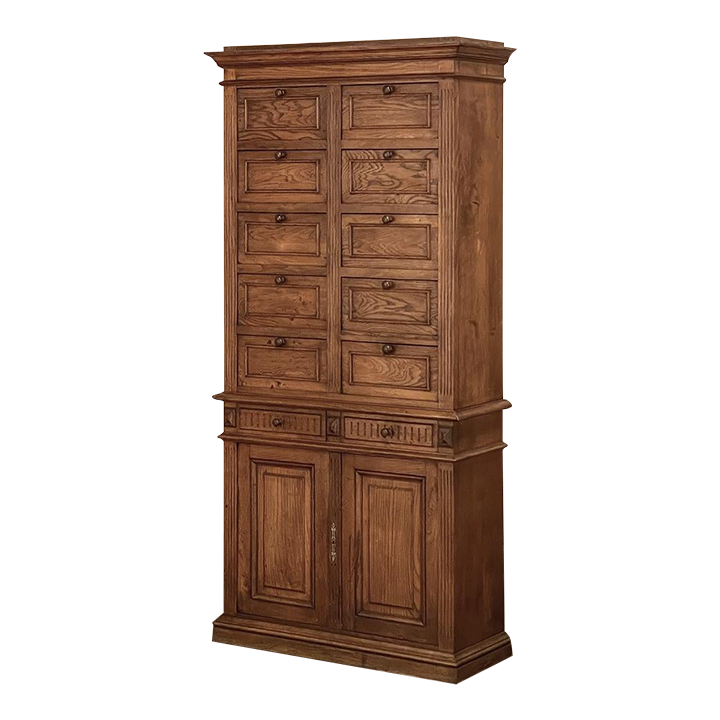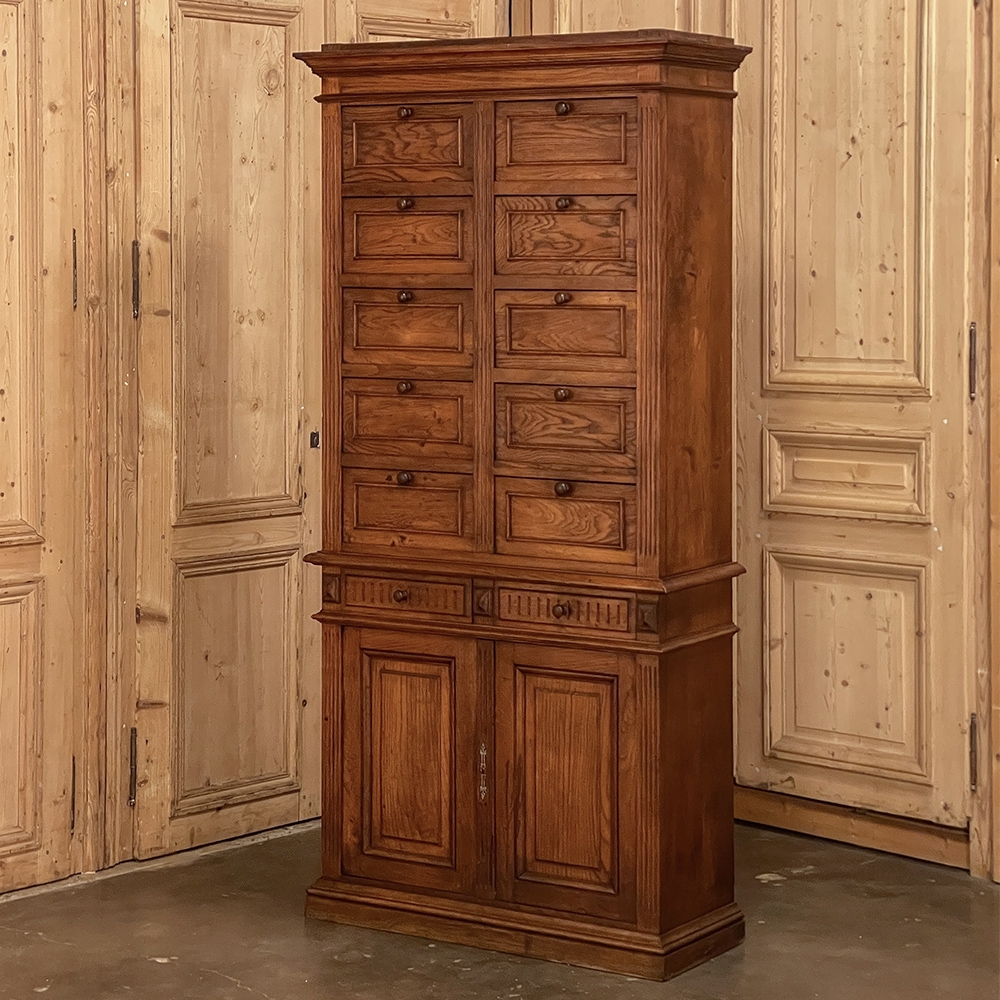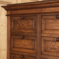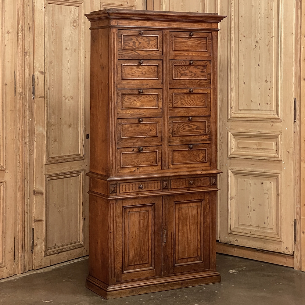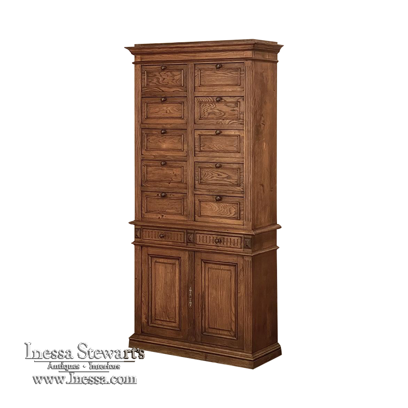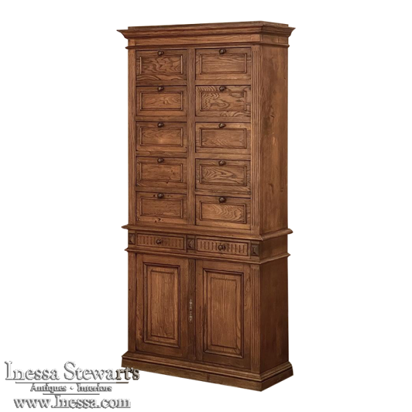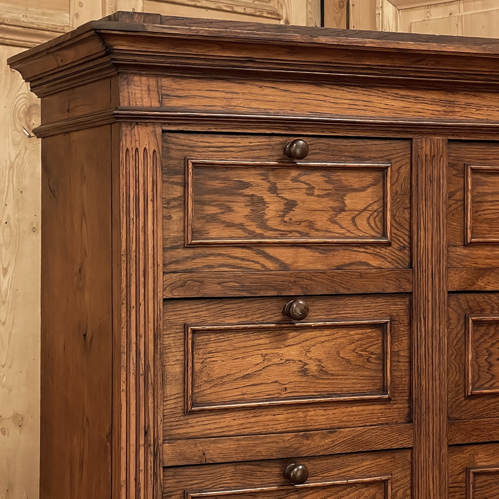 Antique Neoclassical Pharmacy File Cabinet was used to store & organize medicines but could easily be adapted to organize any small items placing them at your fingertips! Taking up an incredibly small footprint, its space efficiency cannot be denied, and utility is of a unique sort, with no less than ten drop down cabinet doors revealing cubby hole spaces, two traditional drawers with fluted facades, and two full size cabinet doors below that open without a center divider to provide storage for larger items. Crafted entirely from oak, it uses steel knobs for access to all these amazing storage places. The cabinet doors are tailored frames devoid of any carved embellishment, but the corners and center stile are fluted, with the latter fitted with a handsome pierced steel key guard. The fluted pilasters and stile continue upwards all the way to the multi-tiered crown molding for a clean, stately look. As handsome as it is versatile!