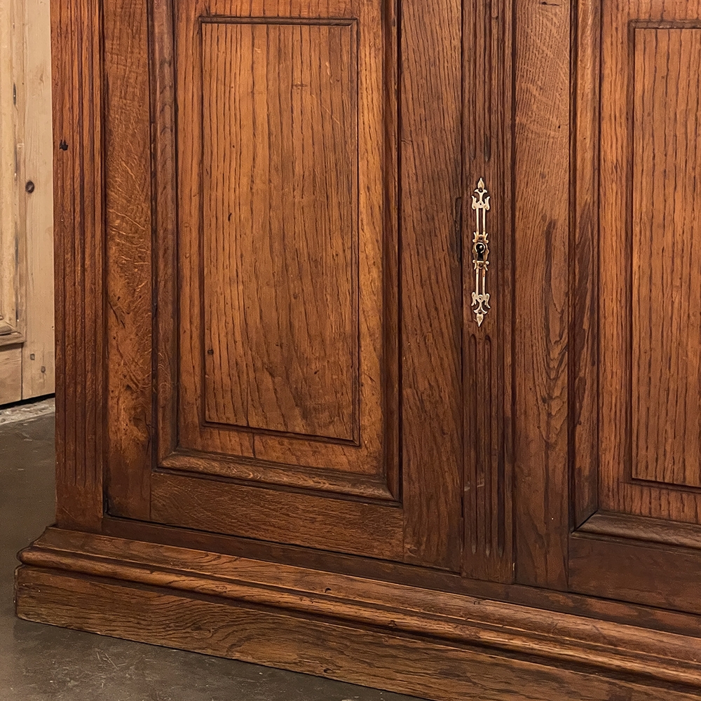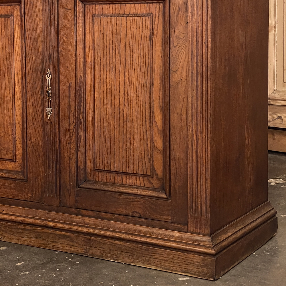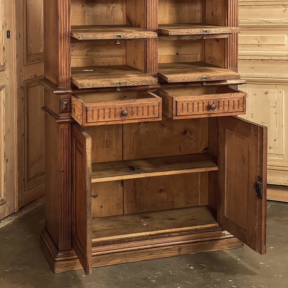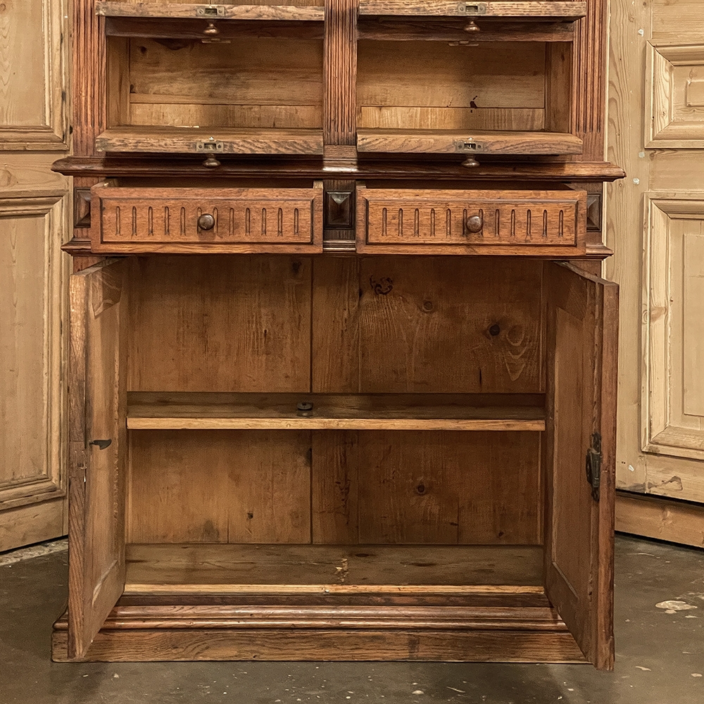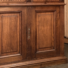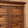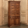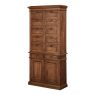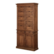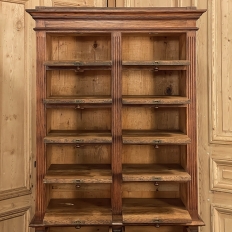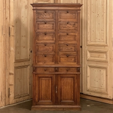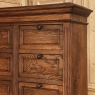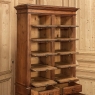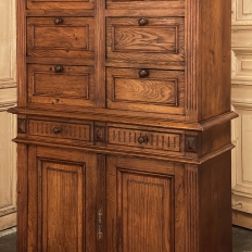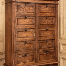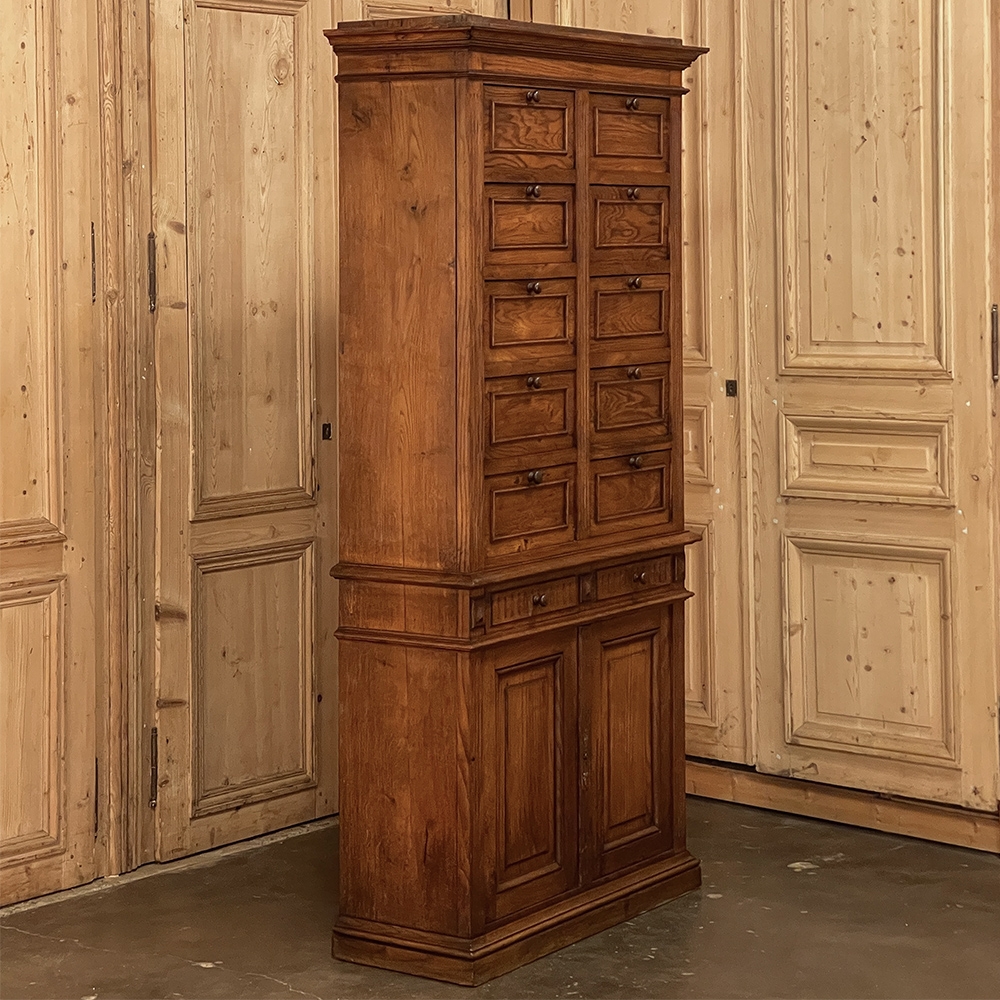 Antique Neoclassical Pharmacy File Cabinet was used to store & organize medicines but could easily be adapted to organize any small items placing them at your fingertips! Taking up an incredibly small footprint, its space efficiency cannot be denied, and utility is of a unique sort, with no less than ten drop down cabinet doors revealing cubby hole spaces, two traditional drawers with fluted facades, and two full size cabinet doors below that open without a center divider to provide storage for larger items. Crafted entirely from oak, it uses steel knobs for access to all these amazing storage places. The cabinet doors are tailored frames devoid of any carved embellishment, but the corners and center stile are fluted, with the latter fitted with a handsome pierced steel key guard. The fluted pilasters and stile continue upwards all the way to the multi-tiered crown molding for a clean, stately look. As handsome as it is versatile!
