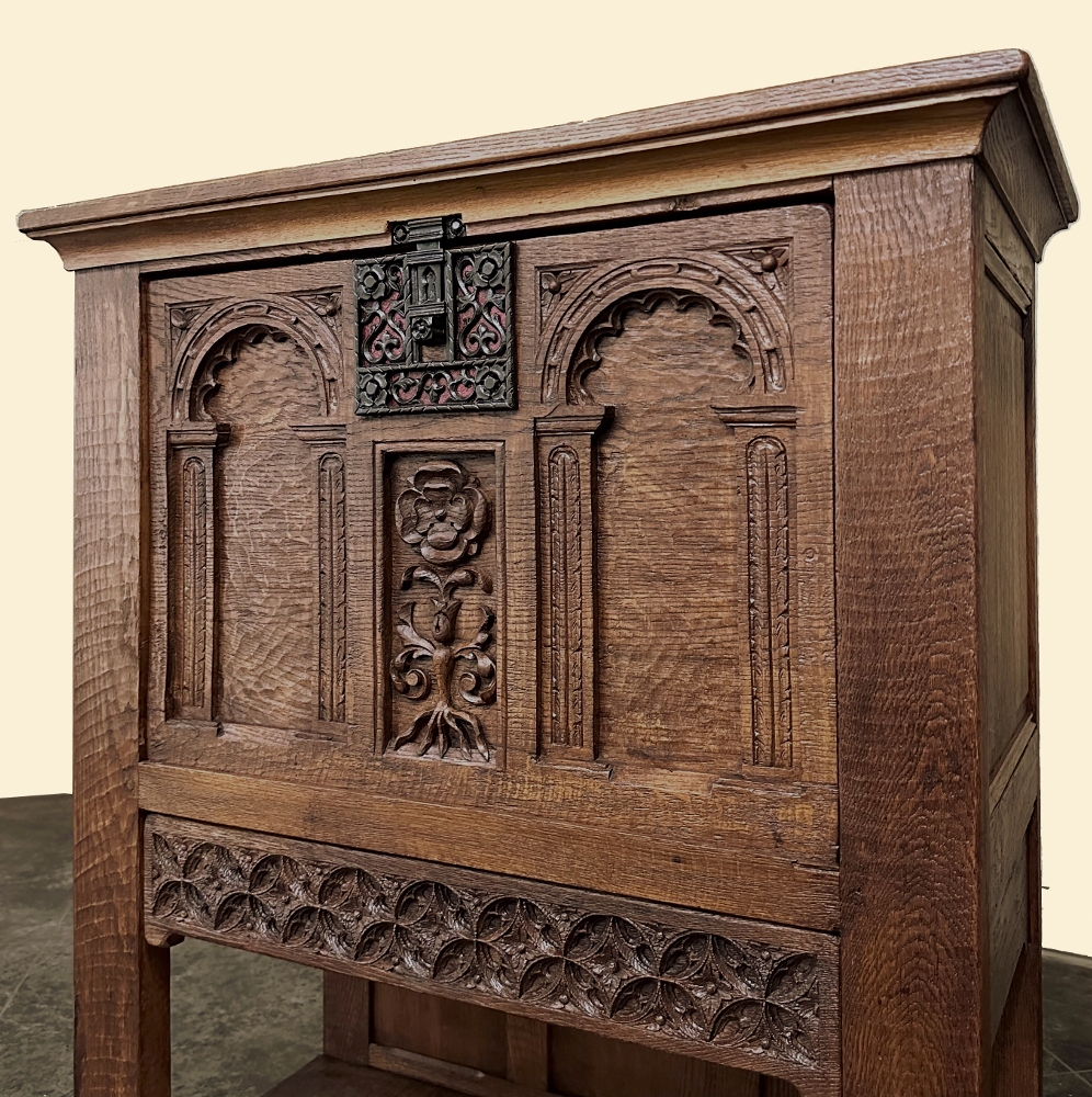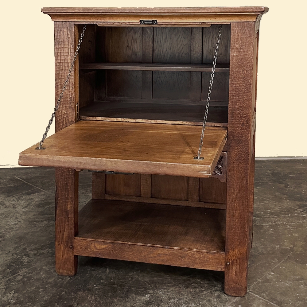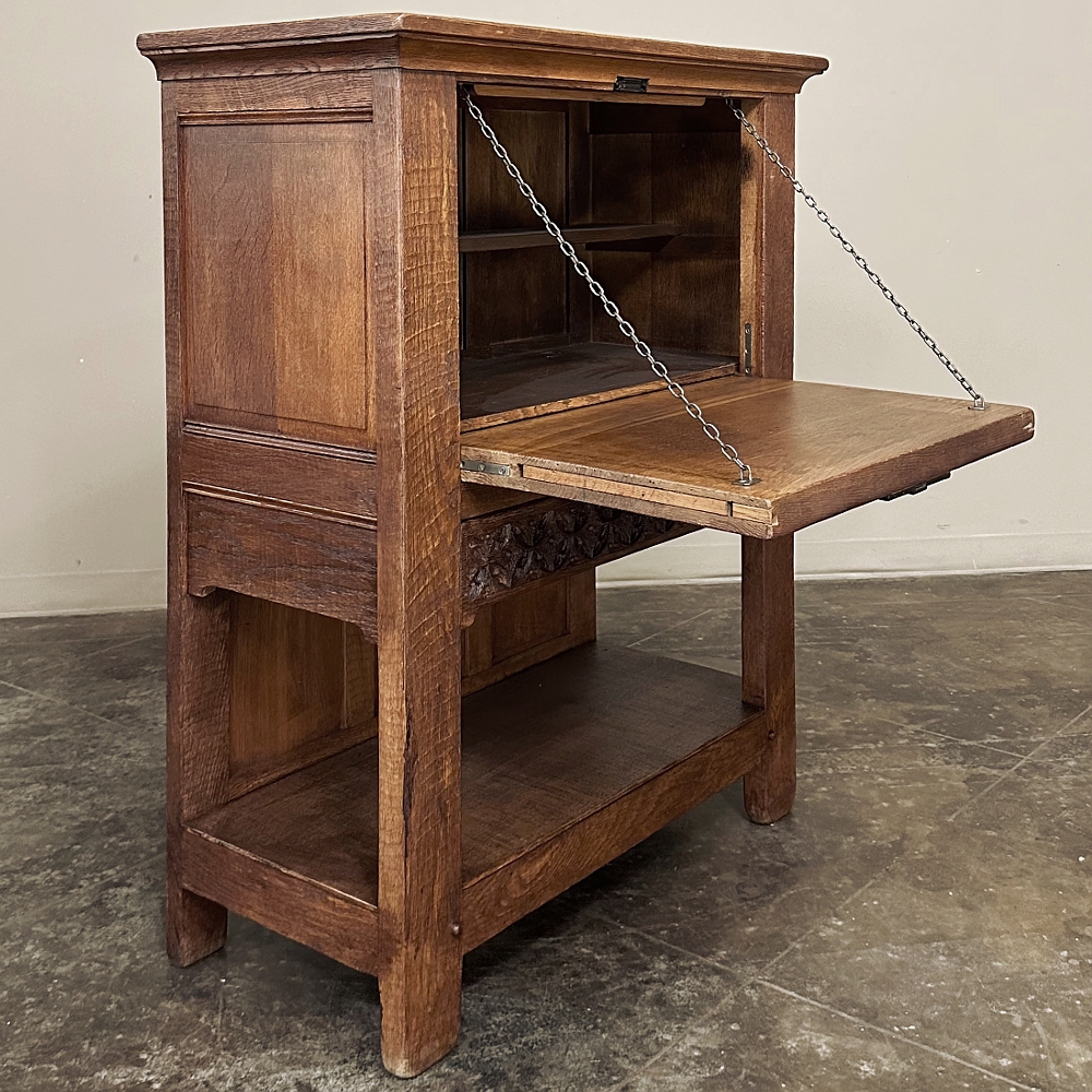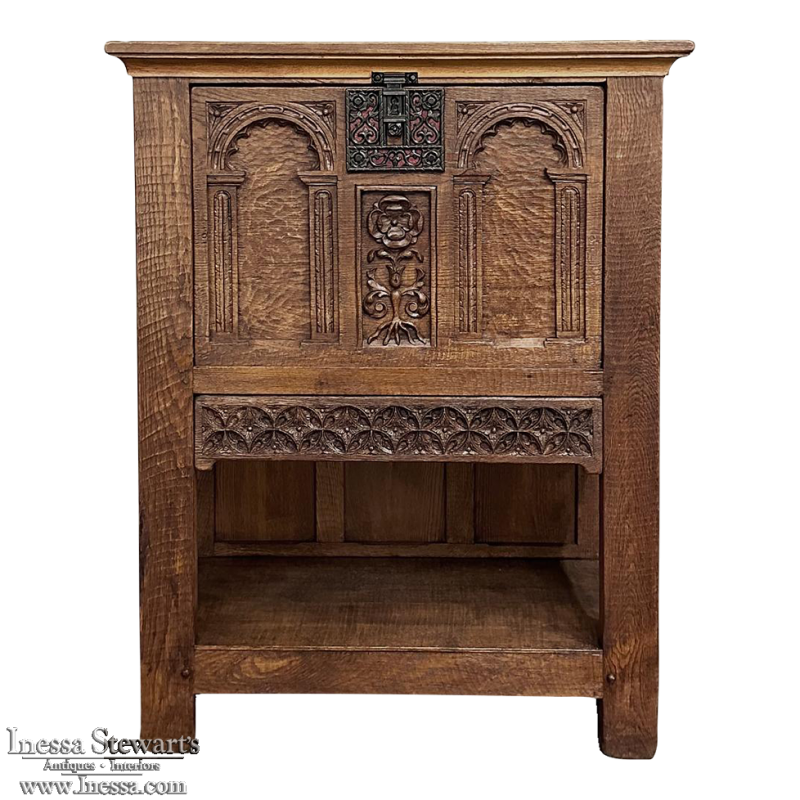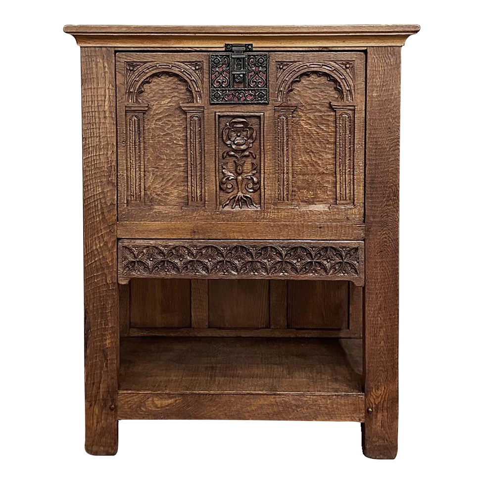 SaleAntique Gothic Revival Raised Cabinet ~ Dry Bar ~ Dry Bar will add an Old World yet charming rustic enhancement to any room. Designed as a dry bar, its drop down front reveals a cabinet that can be used for a wide variety of storage requirements. Crafted from solid oak all around, even on the top which is plenty sturdy enough for a heavy display item such as a bronze statue, it consists of four timbers serving as corner posts and a restrained panel design on each side, as well as below the cabinet overlooking the open shelf. The fine carved detail appears only on the full width drawer with a repeating coin design, and the drop down door itself with a pair of arched colonnades flanking a richly sculpted panel of stylized foliates at the center. A finely cast iron lockwork plate contains the latch lock, and a brace of chains support the door when fully opened greatly increasing the work/preparation area, even though the entire piece including molding is only 19" deep from the wall!