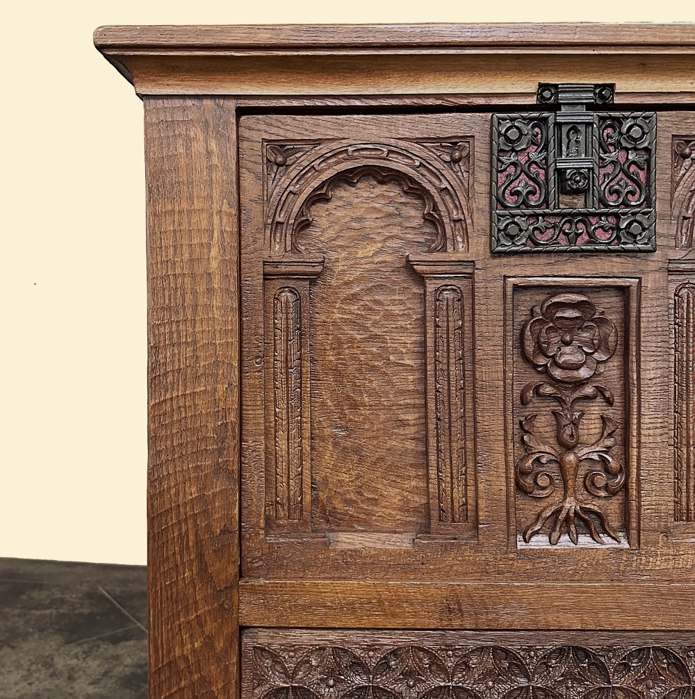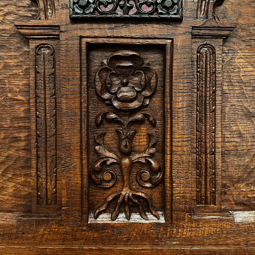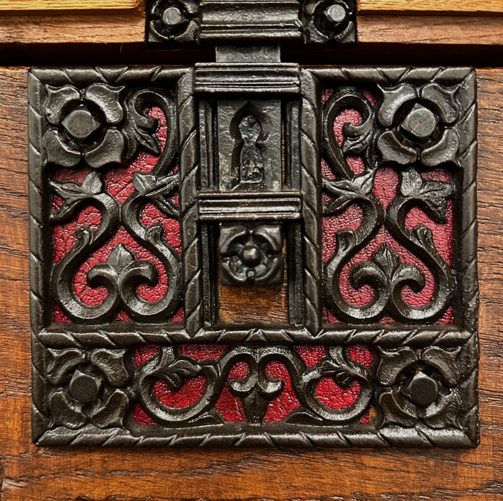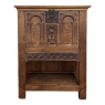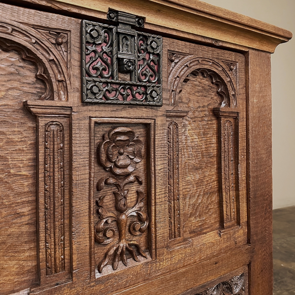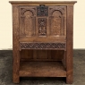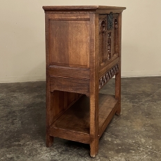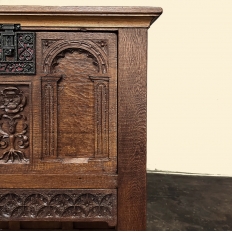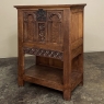 SaleAntique Gothic Revival Raised Cabinet ~ Dry Bar ~ Dry Bar will add an Old World yet charming rustic enhancement to any room. Designed as a dry bar, its drop down front reveals a cabinet that can be used for a wide variety of storage requirements. Crafted from solid oak all around, even on the top which is plenty sturdy enough for a heavy display item such as a bronze statue, it consists of four timbers serving as corner posts and a restrained panel design on each side, as well as below the cabinet overlooking the open shelf. The fine carved detail appears only on the full width drawer with a repeating coin design, and the drop down door itself with a pair of arched colonnades flanking a richly sculpted panel of stylized foliates at the center. A finely cast iron lockwork plate contains the latch lock, and a brace of chains support the door when fully opened greatly increasing the work/preparation area, even though the entire piece including molding is only 19" deep from the wall!