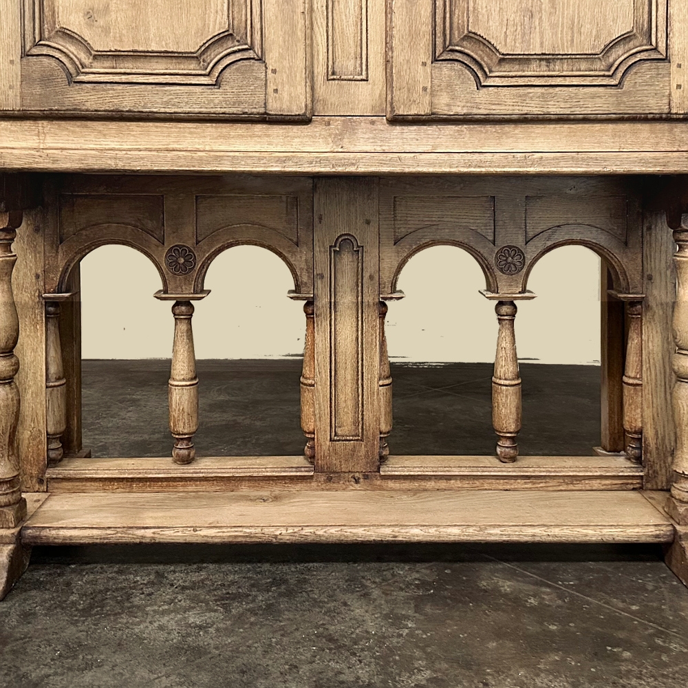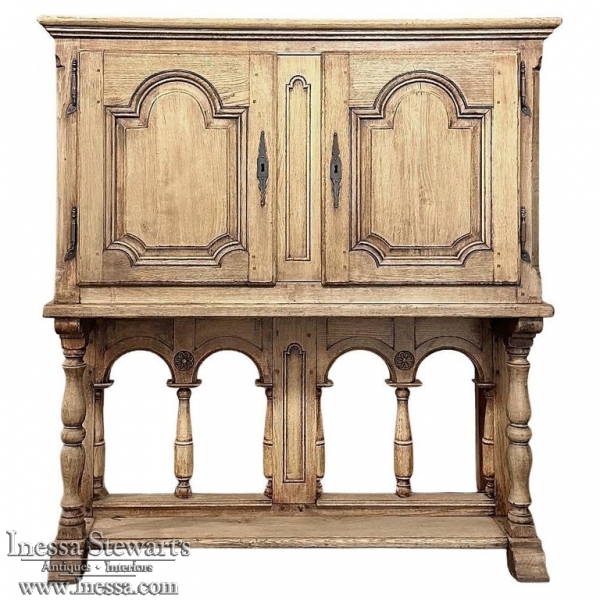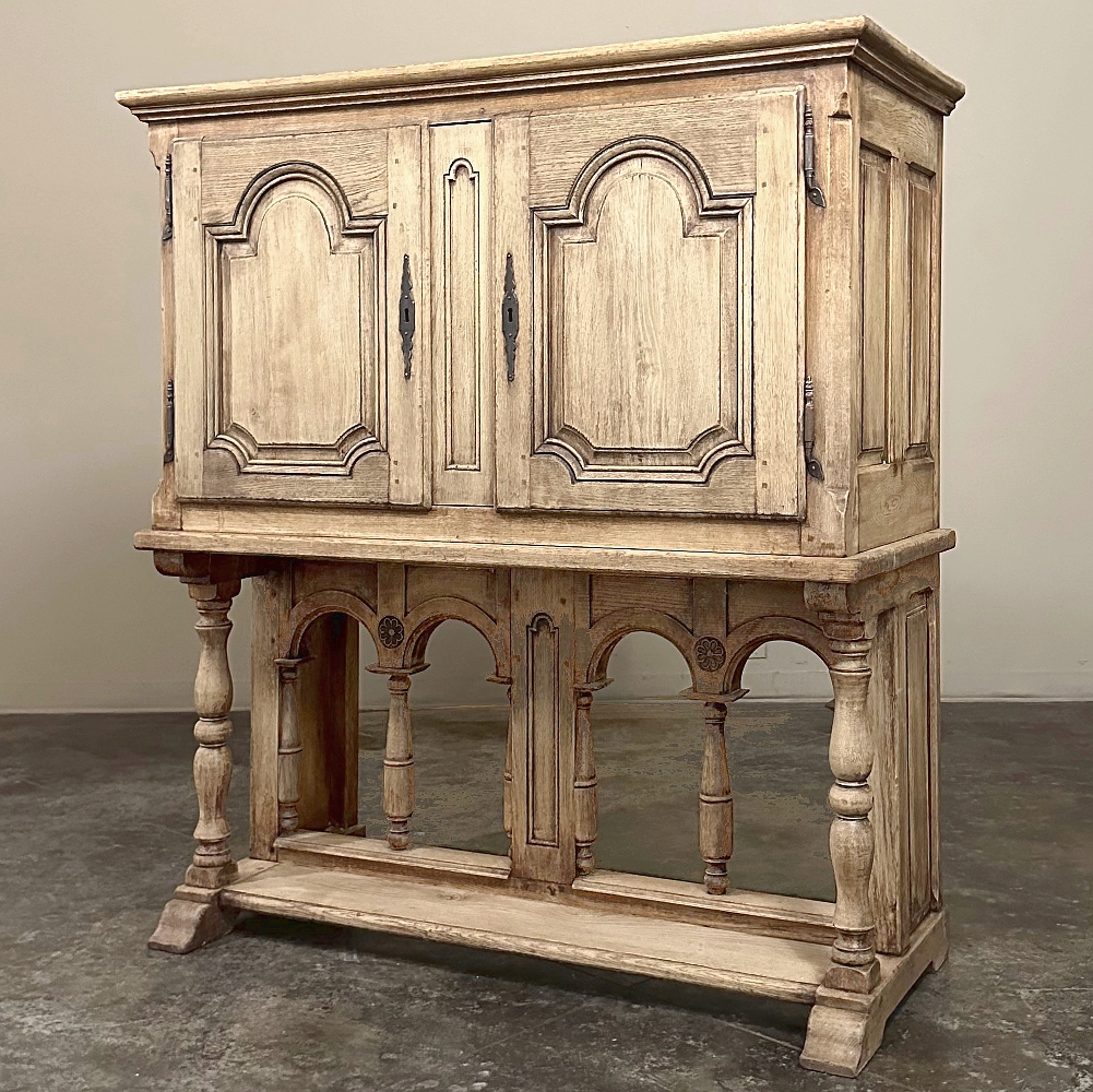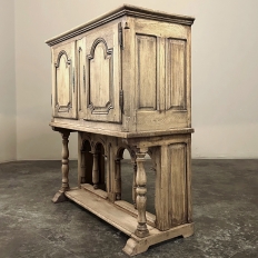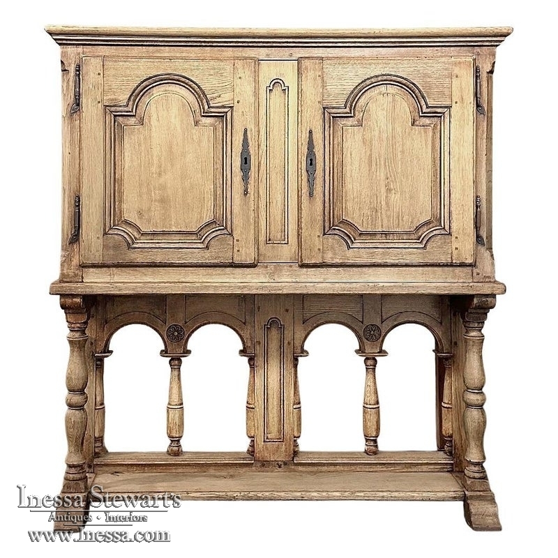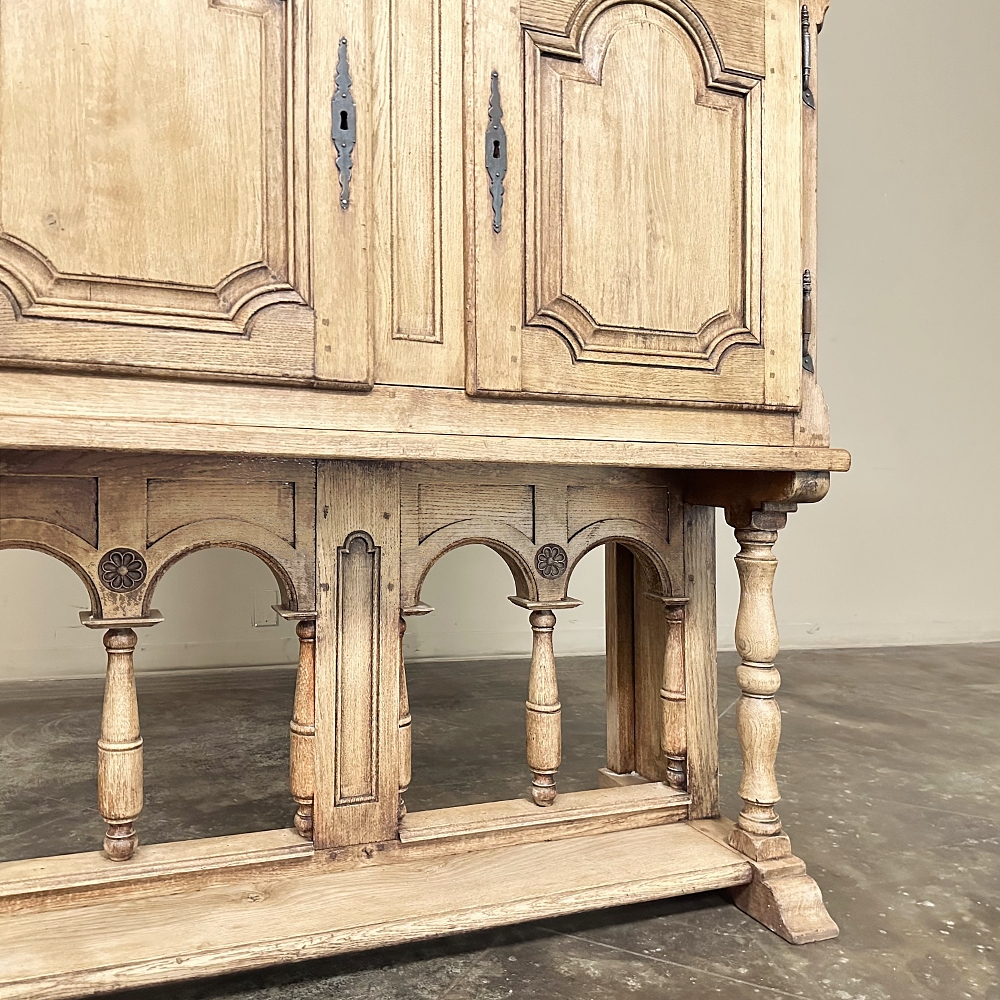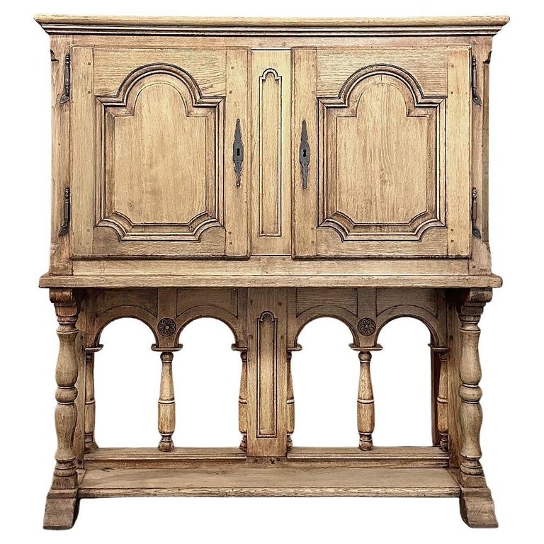 Sale19th Century Rustic Country French Raised Cabinet represents a centuries-old design that harks back to an era when specialized storage cabinets were in high demand by the affluent. This example, rendered from solid old-growth oak, features pegged mortise & tenon joinery, chamfered plank panels across the back, and a cabinet that is raised up for easy access upon a pediment of colonnades with turned columns. Such pieces would appear in libraries, studies, and hallways, and provide safe storage for items particular to the usage for that part of the manoir. Forged steel hinges, lockworks and key guards add a nice touch, as do the notched brackets on the interior that allow one to adjust the shelf to whatever height needed. Subtle yet artistic cabinetry is apparent in the door panels, side panels, and touches such as the rosettes on the arches below. Opening measures 25 high x 47 wide and shelf is removable in case you wish to put a flat panel TV inside. Painstakingly stripped using our proprietary process that retains the patina and sheer natural beauty of the old wood, all performed by our expert in-house staff.