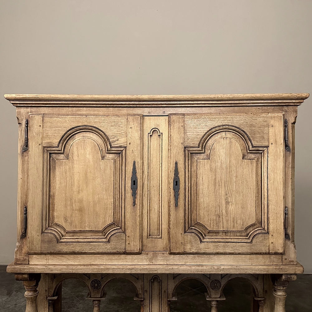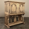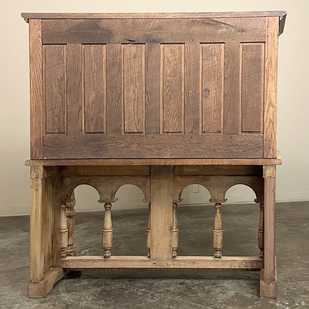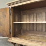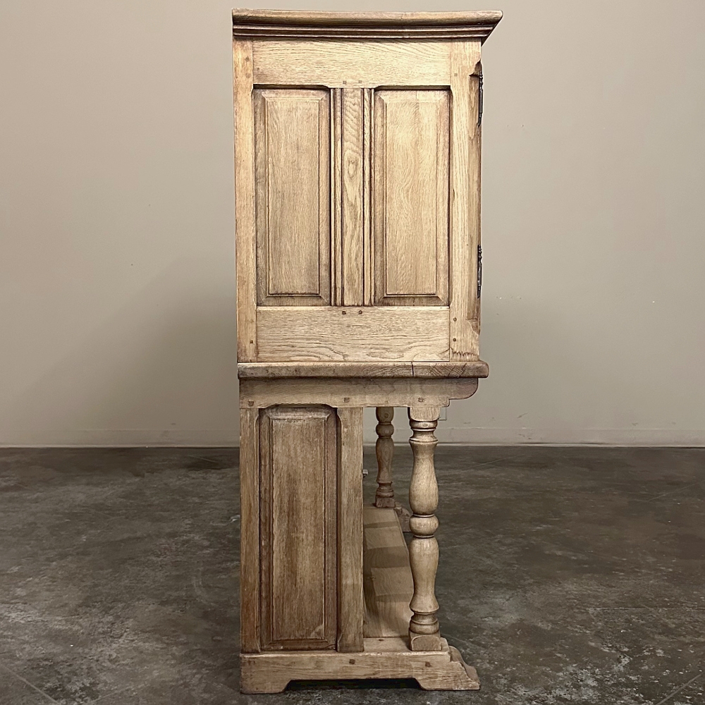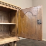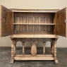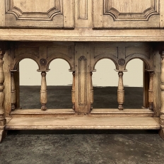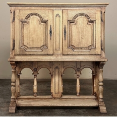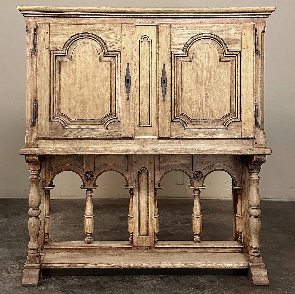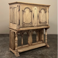 Sale19th Century Rustic Country French Raised Cabinet represents a centuries-old design that harks back to an era when specialized storage cabinets were in high demand by the affluent. This example, rendered from solid old-growth oak, features pegged mortise & tenon joinery, chamfered plank panels across the back, and a cabinet that is raised up for easy access upon a pediment of colonnades with turned columns. Such pieces would appear in libraries, studies, and hallways, and provide safe storage for items particular to the usage for that part of the manoir. Forged steel hinges, lockworks and key guards add a nice touch, as do the notched brackets on the interior that allow one to adjust the shelf to whatever height needed. Subtle yet artistic cabinetry is apparent in the door panels, side panels, and touches such as the rosettes on the arches below. Opening measures 25 high x 47 wide and shelf is removable in case you wish to put a flat panel TV inside. Painstakingly stripped using our proprietary process that retains the patina and sheer natural beauty of the old wood, all performed by our expert in-house staff.