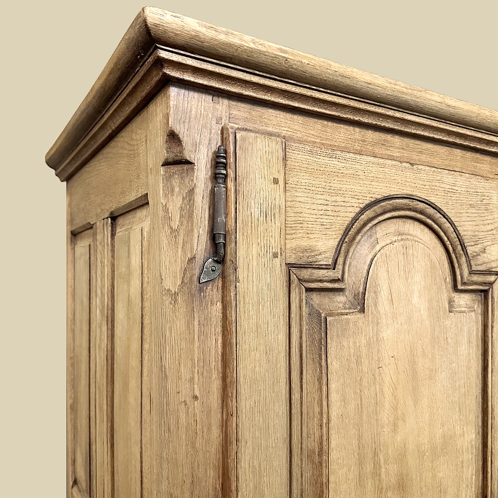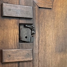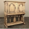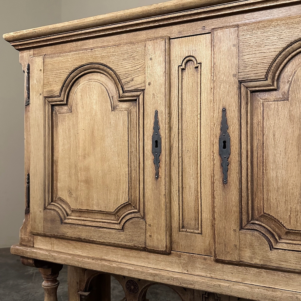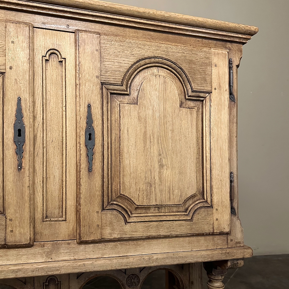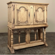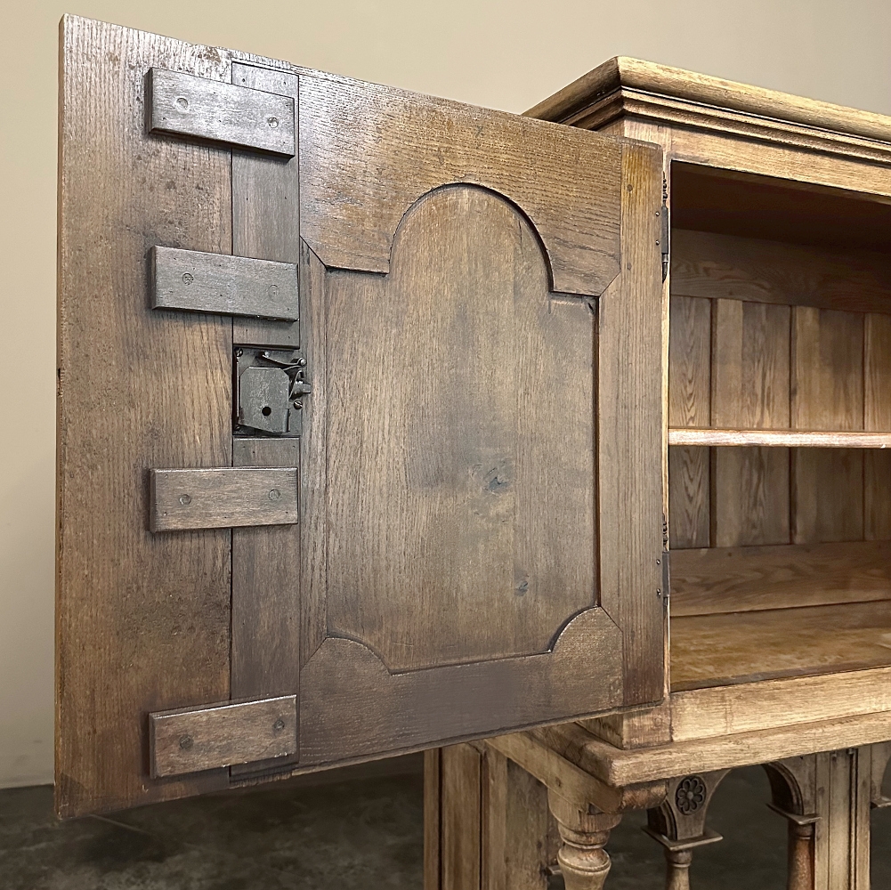Sale19th Century Rustic Country French Raised Cabinet represents a centuries-old design that harks back to an era when specialized storage cabinets were in high demand by the affluent. This example, rendered from solid old-growth oak, features pegged mortise & tenon joinery, chamfered plank panels across the back, and a cabinet that is raised up for easy access upon a pediment of colonnades with turned columns. Such pieces would appear in libraries, studies, and hallways, and provide safe storage for items particular to the usage for that part of the manoir. Forged steel hinges, lockworks and key guards add a nice touch, as do the notched brackets on the interior that allow one to adjust the shelf to whatever height needed. Subtle yet artistic cabinetry is apparent in the door panels, side panels, and touches such as the rosettes on the arches below. Opening measures 25 high x 47 wide and shelf is removable in case you wish to put a flat panel TV inside. Painstakingly stripped using our proprietary process that retains the patina and sheer natural beauty of the old wood, all performed by our expert in-house staff.