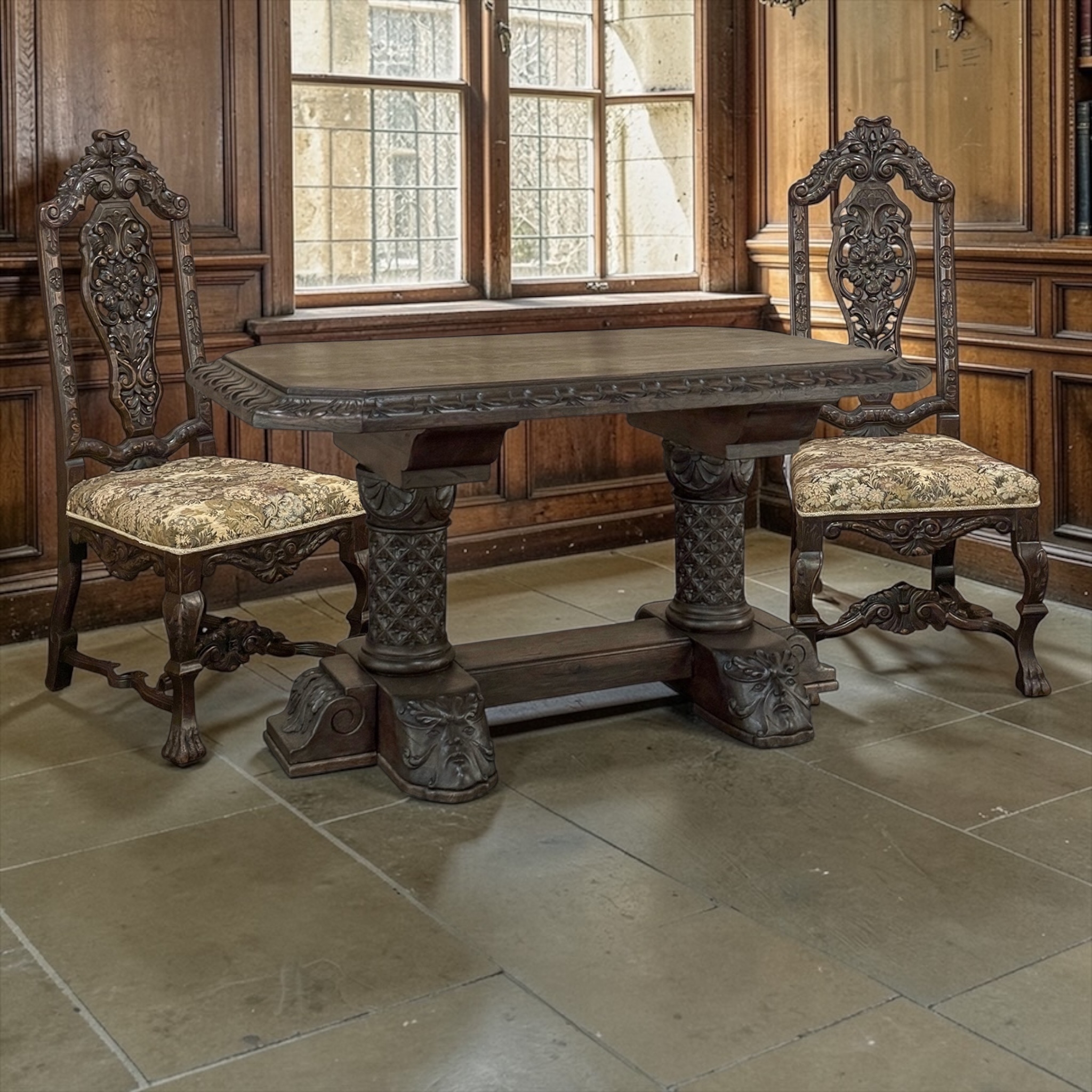19th Century French Gothic Revival Library Table was fashioned from thick planks and beams of solid maple to literally last for centuries! The heavy top which features generously mitered corners to create a traffic friendly design, has been richly carved with an egg & dart pattern all around. Two huge cross beams supply support underneath, and are in turn supported by massive columns with acanthus plume crowns and continuous floral rosettes in a diamond pattern all around the entirety of the columns. Continuing the Gothic esthetic, the lower base is an enlarged version of the aforementioned cross beams, with acanthus leaf carvings on the ends creating a corbel effect, while on the transverse supports fanciful anthropomorphic lions' heads have been carved into the solid wood. Celebrating a style that is over a millennium in age, it is ready to carry the genre into the 22nd century!