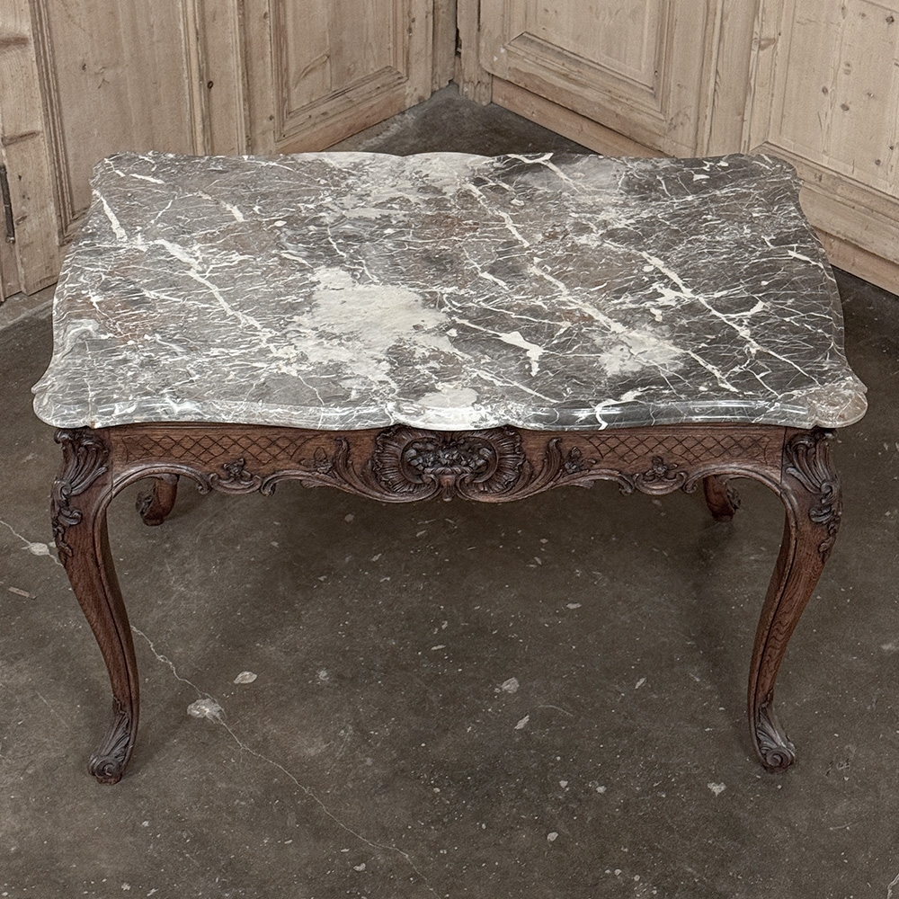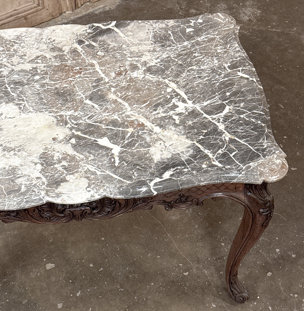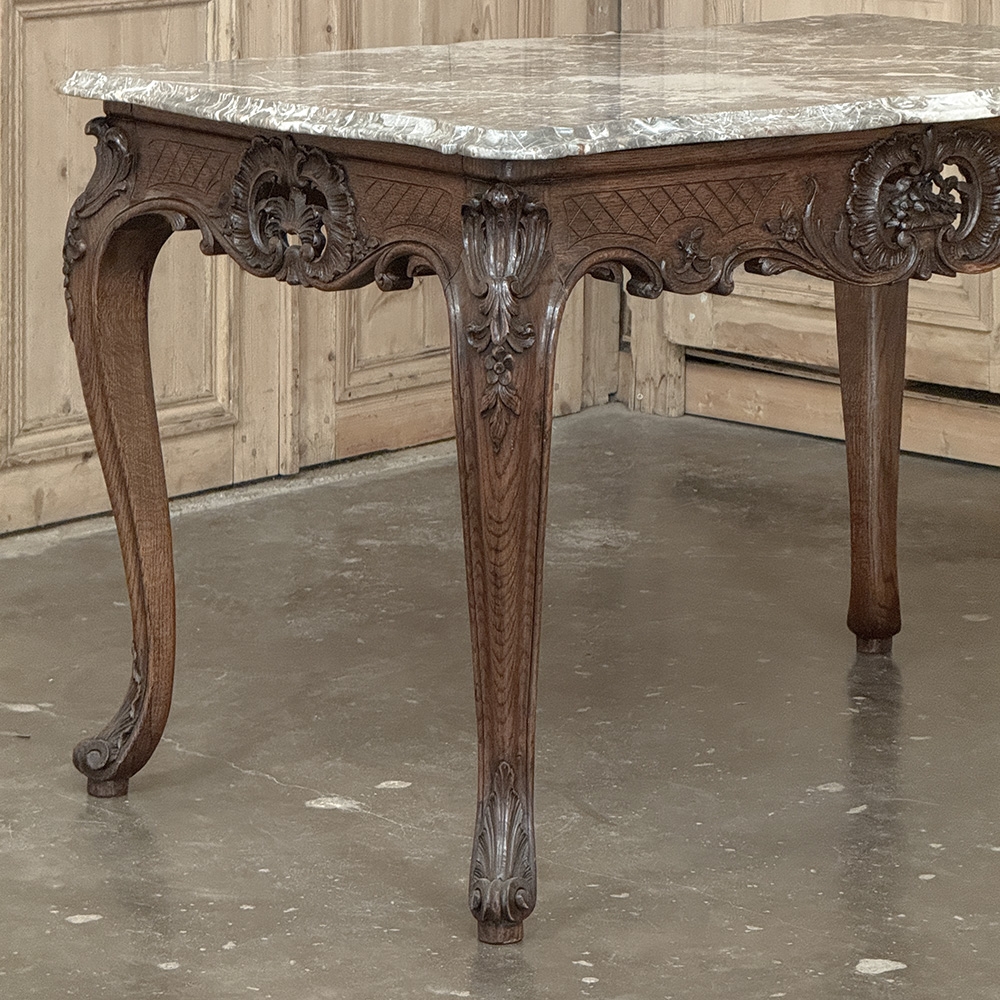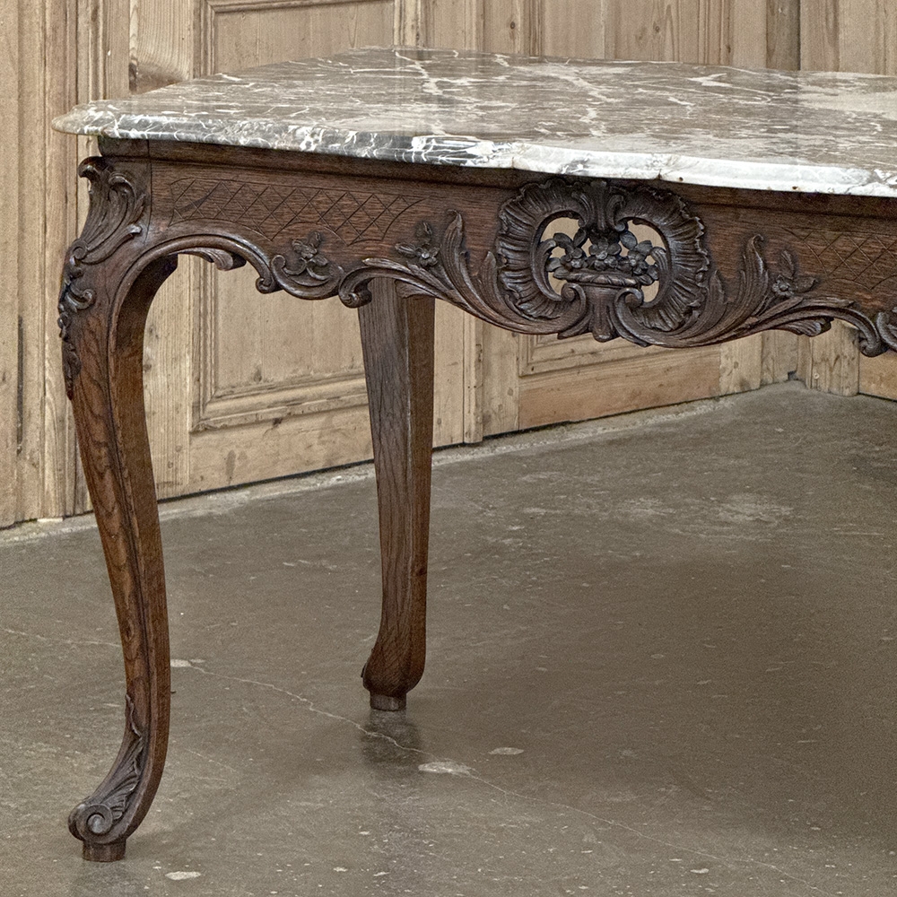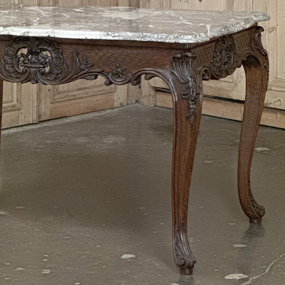 An exceptional 19th century antique Régence marble-top center table, representing the finest traditions of Liègeois craftsmanship, this handsome table was hand-carved from solid oak and reflects the disciplined artistry and structural integrity for which this region is so well known.