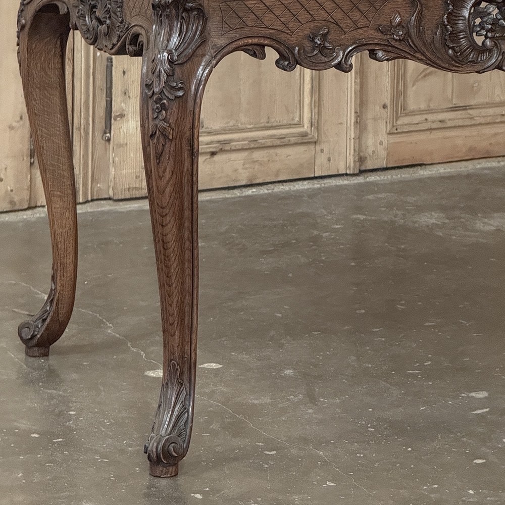 The pierced apron is richly detailed with lattice carving and fluid scrollwork, centered by a bold cartouche framed in foliate ornament. Every element is hand-carved, cut deeply and confidently from solid wood, showcasing both technical mastery and decorative refinement. The legs are strong and sculpted, echoing the movement of the apron while maintaining a grounded, architectural stance.