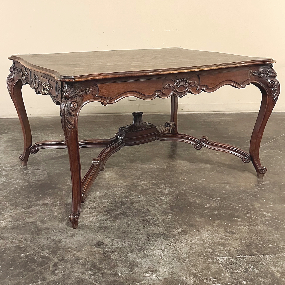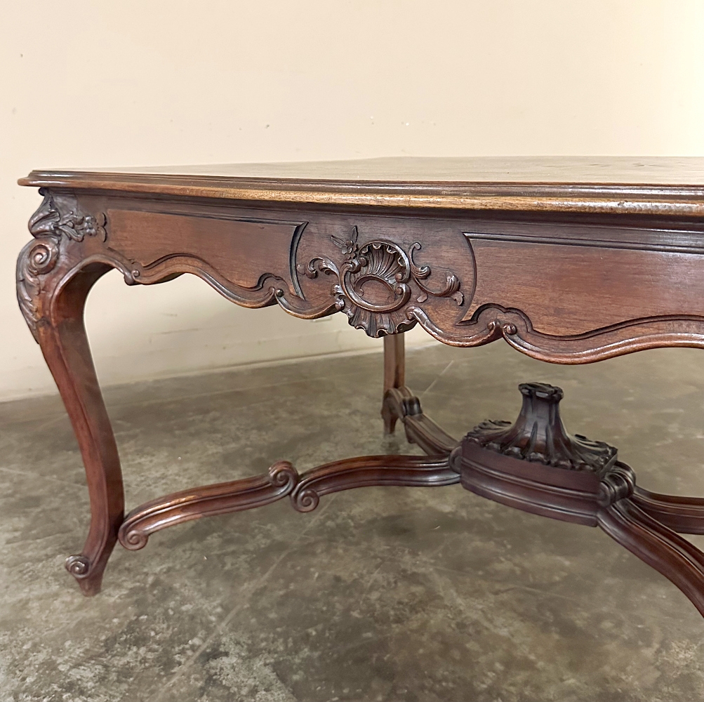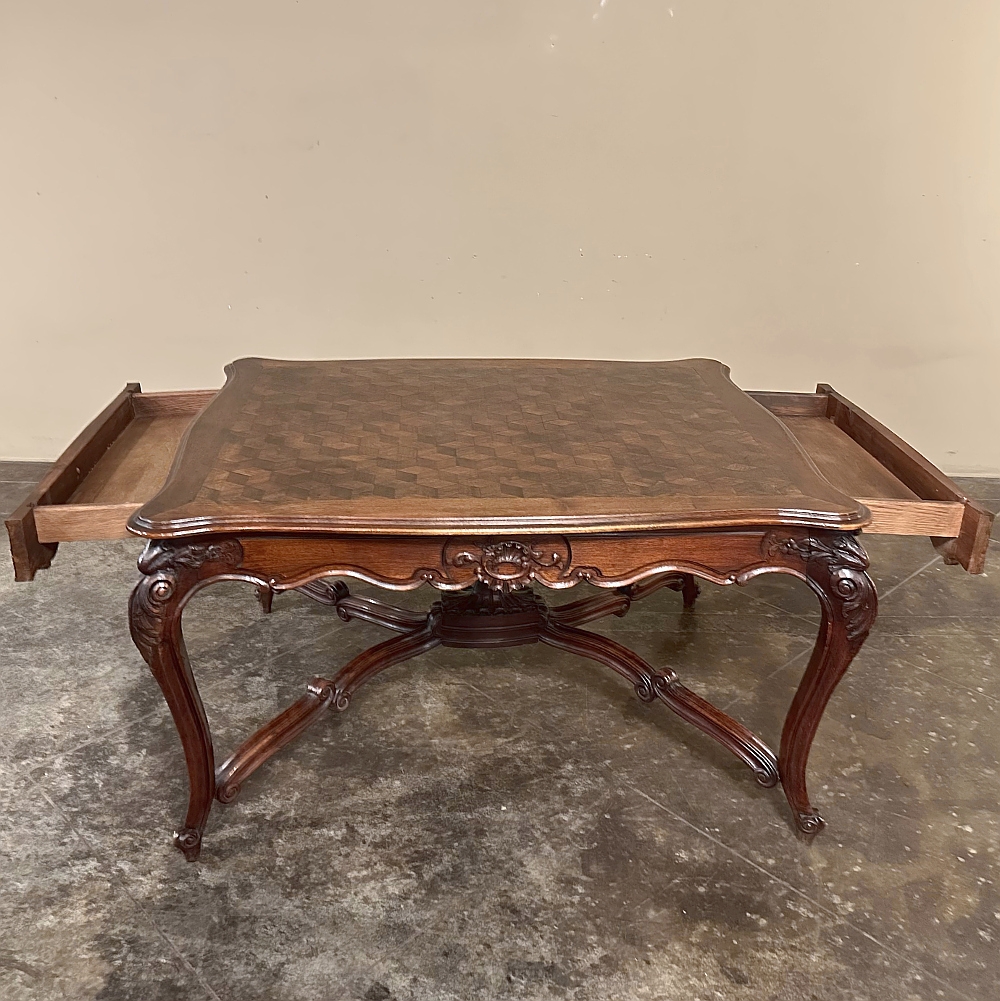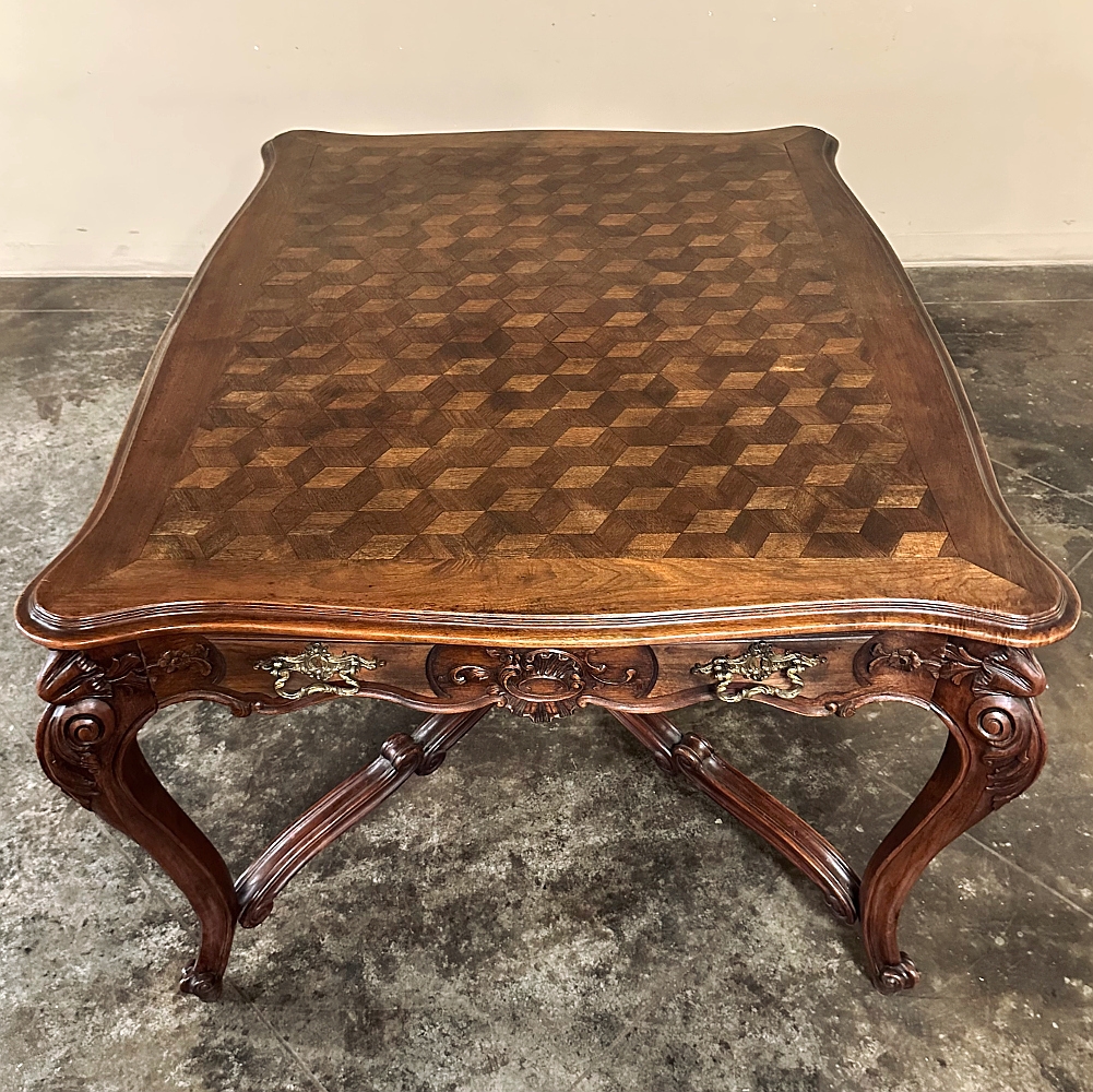 Antique French Louis XV Parquet Walnut Library Table ~ Center Table will add grace and elegance to any room! Featuring an impressively contoured and beveled parquet top, it is supported by four boldly scrolled and carved cabriole legs, all connected with scrolled stretchers below centered with a carved finial. All four aprons are beautifully carved as well, depicting stylized shell and foliate motifs. A surprise feature is the two aprons on each end, which are actually concealed full width drawers, adding a level of convenience one doesn't normally enjoy with such a table. Crafted from luxurious French walnut to provide enjoyment for generations to come.