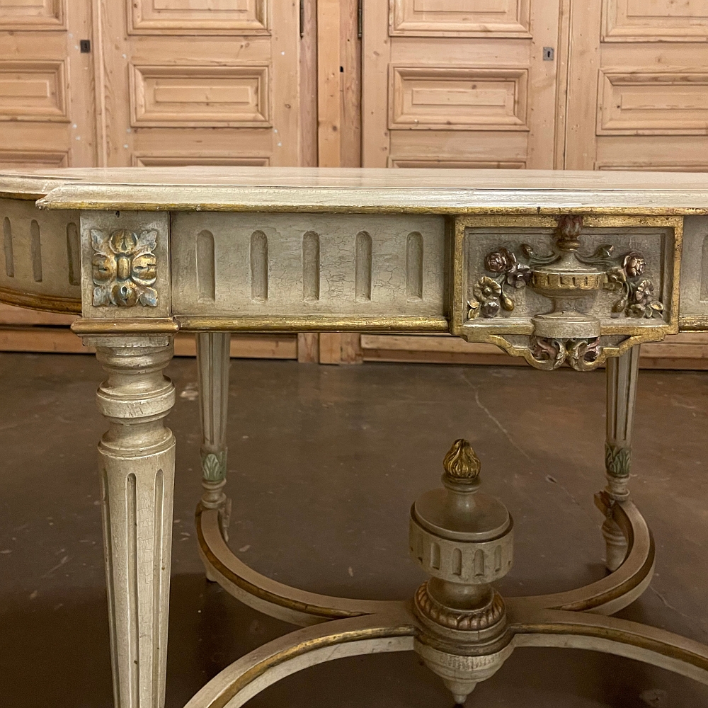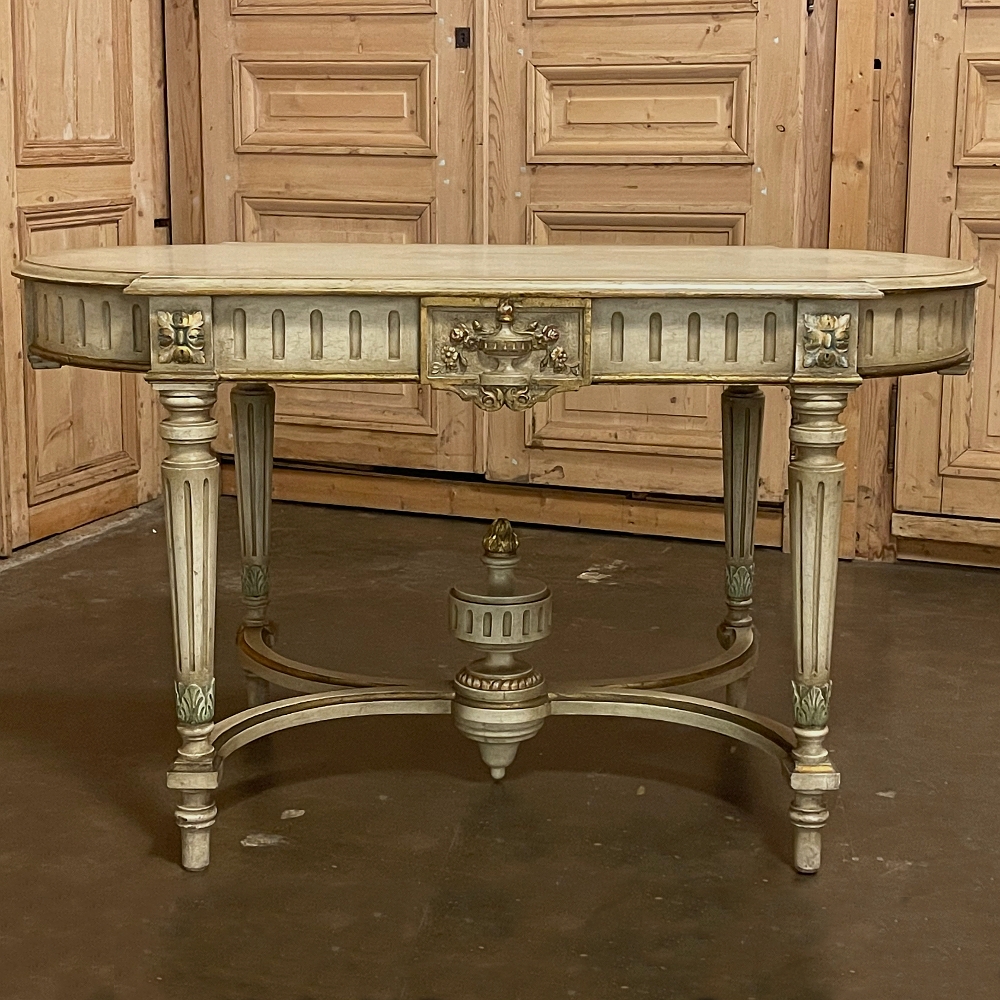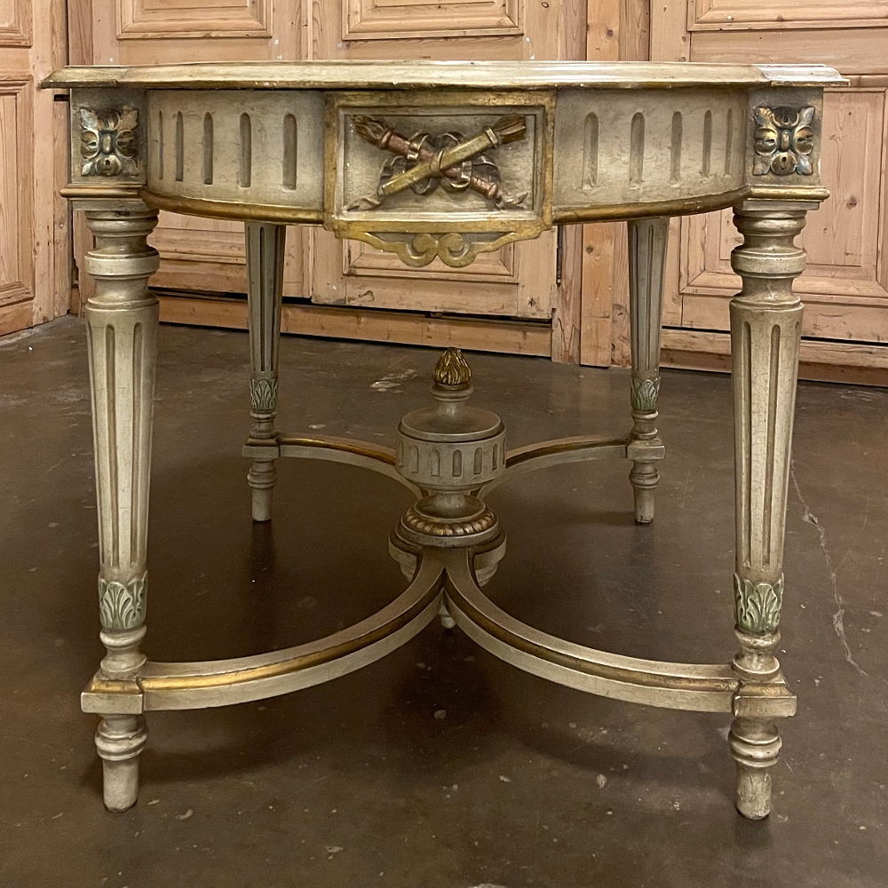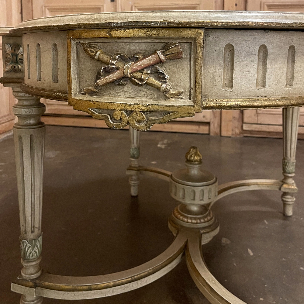 Antique French Louis XVI Painted Center Table is a magnificent example of the genre! Classic architecture inspired by ancient Greece and Rome pervades the entire design, which features rounded ends that present a very traffic-friendly footprint for the room. Designed to welcome newly arrived guests, or to serve in the library or other suitable venue, this example boasts a fluted apron embellished with a Greek urn with floral sprays on the long flat sides, and on the rounded ends the torchere and carquois de fleche symbolizing the power of the monarchy, with all renderings in glorious full relief accentuated by the painted finish and gold highlighting. Each cornerpost sports a brace of rosettes, similarly highlighted, that appear over the tapered and fluted legs. Just above where the legs meet the bowed stretchers appear upright foliate plumes. The stretchers converge at the center with a massive urn with golden flame that intriguingly features a turned pendant finial that contacts the floor to prevent sagging over the centuries, which is an ingenious touch. The original patinaed painted finish only adds the allure, with natural crackling evident on the spacious top.