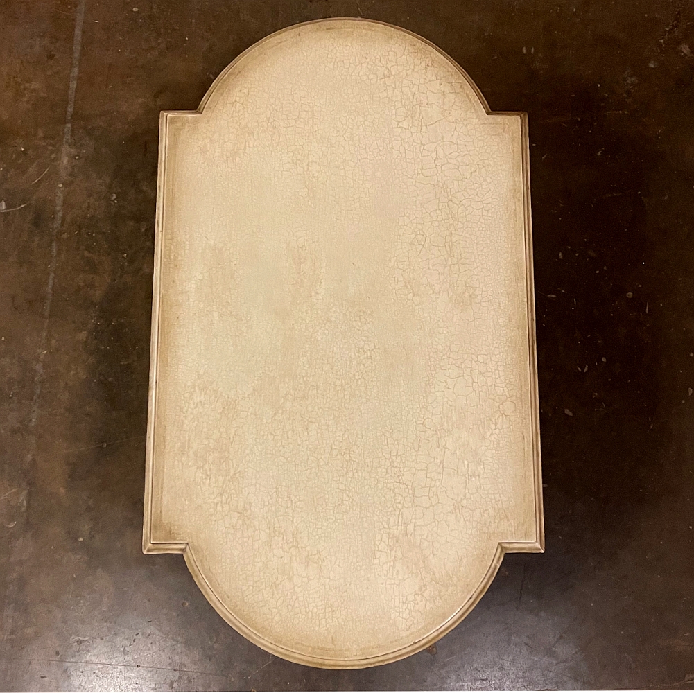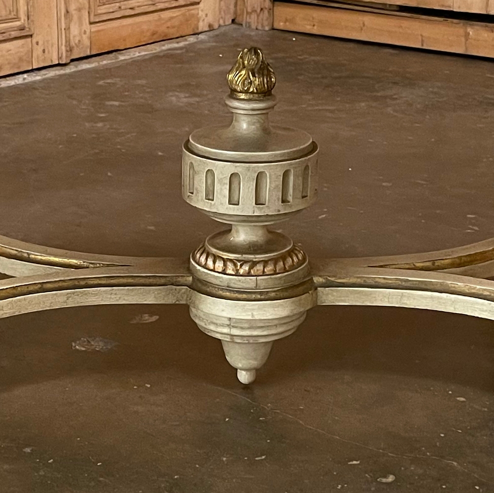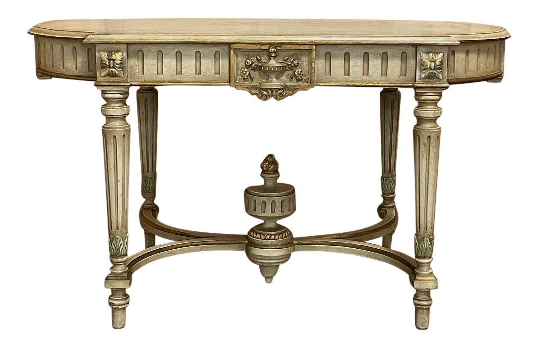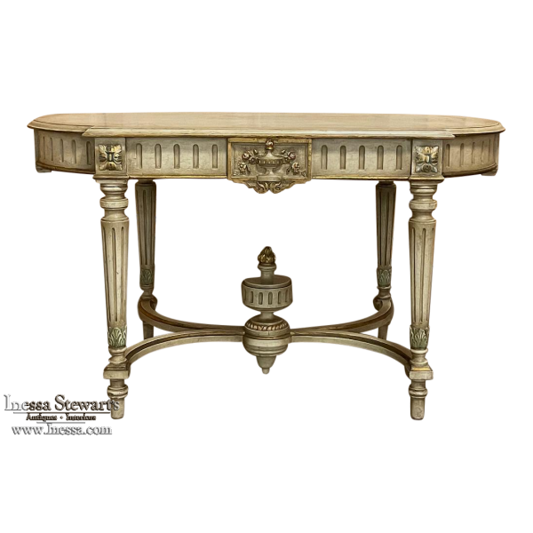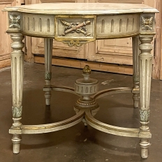 Antique French Louis XVI Painted Center Table is a magnificent example of the genre! Classic architecture inspired by ancient Greece and Rome pervades the entire design, which features rounded ends that present a very traffic-friendly footprint for the room. Designed to welcome newly arrived guests, or to serve in the library or other suitable venue, this example boasts a fluted apron embellished with a Greek urn with floral sprays on the long flat sides, and on the rounded ends the torchere and carquois de fleche symbolizing the power of the monarchy, with all renderings in glorious full relief accentuated by the painted finish and gold highlighting. Each cornerpost sports a brace of rosettes, similarly highlighted, that appear over the tapered and fluted legs. Just above where the legs meet the bowed stretchers appear upright foliate plumes. The stretchers converge at the center with a massive urn with golden flame that intriguingly features a turned pendant finial that contacts the floor to prevent sagging over the centuries, which is an ingenious touch. The original patinaed painted finish only adds the allure, with natural crackling evident on the spacious top.