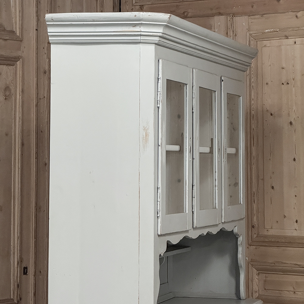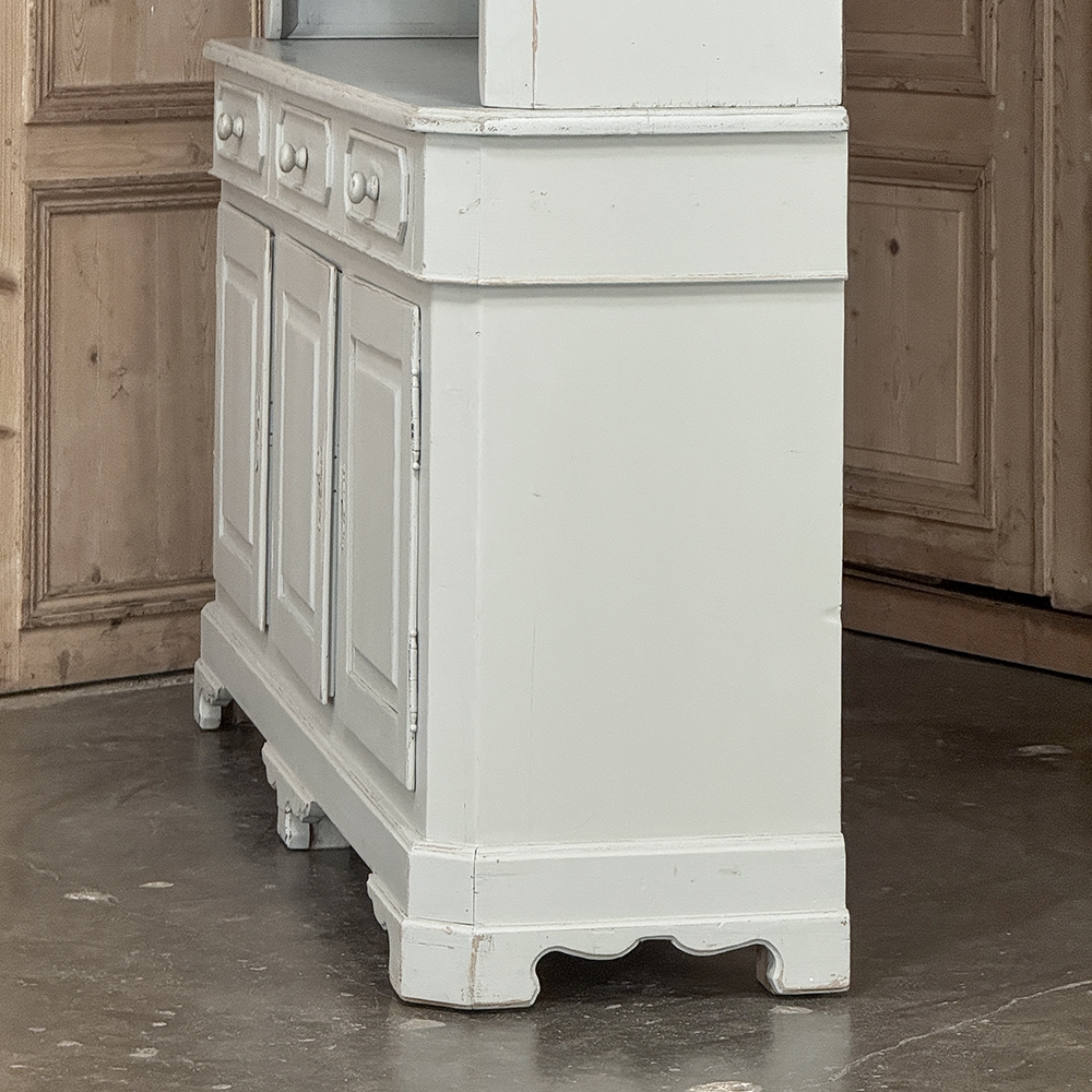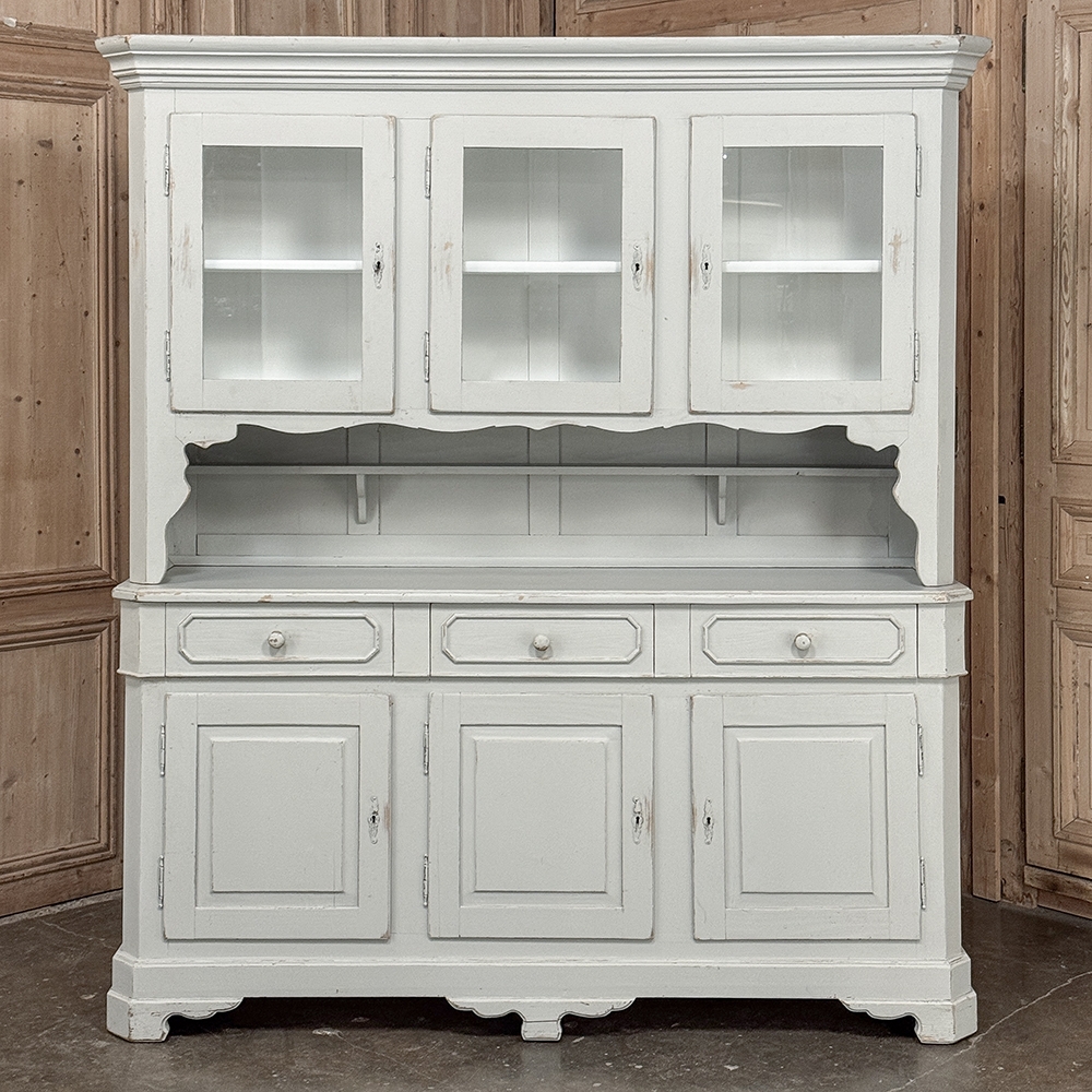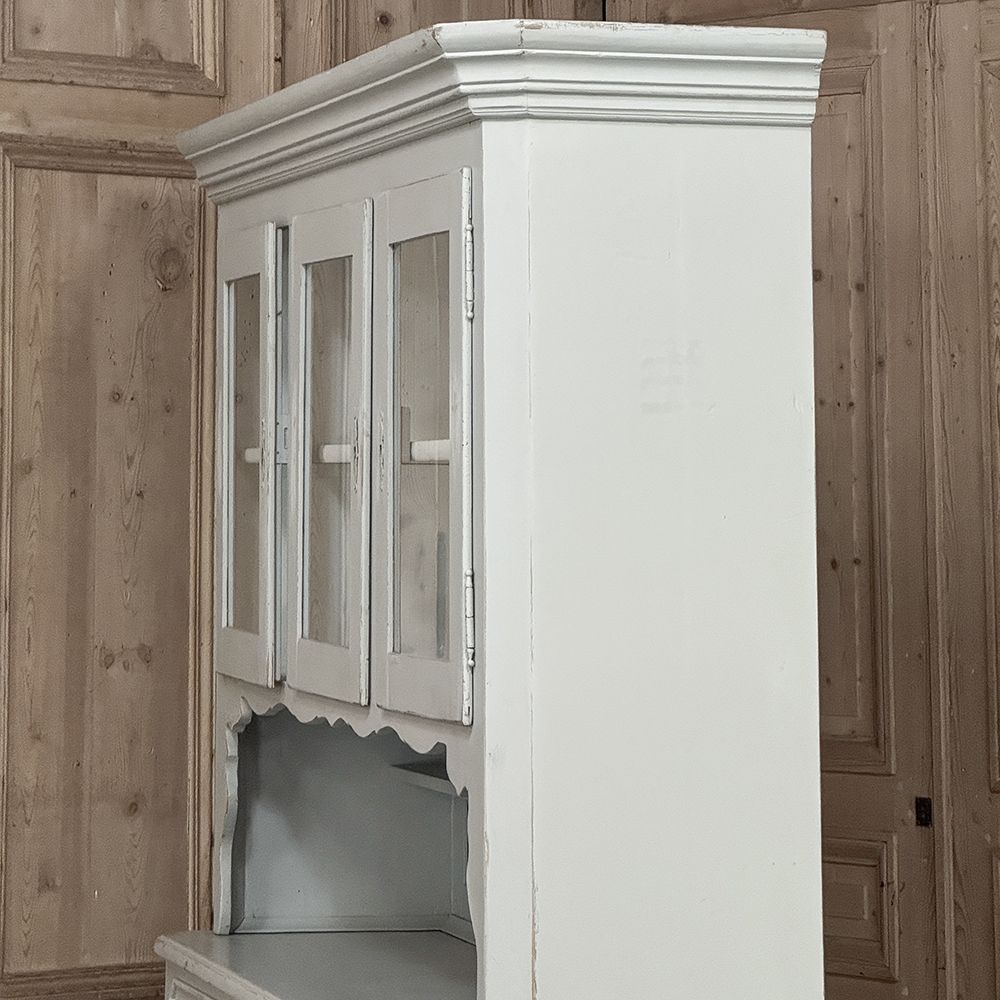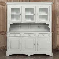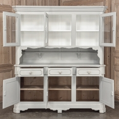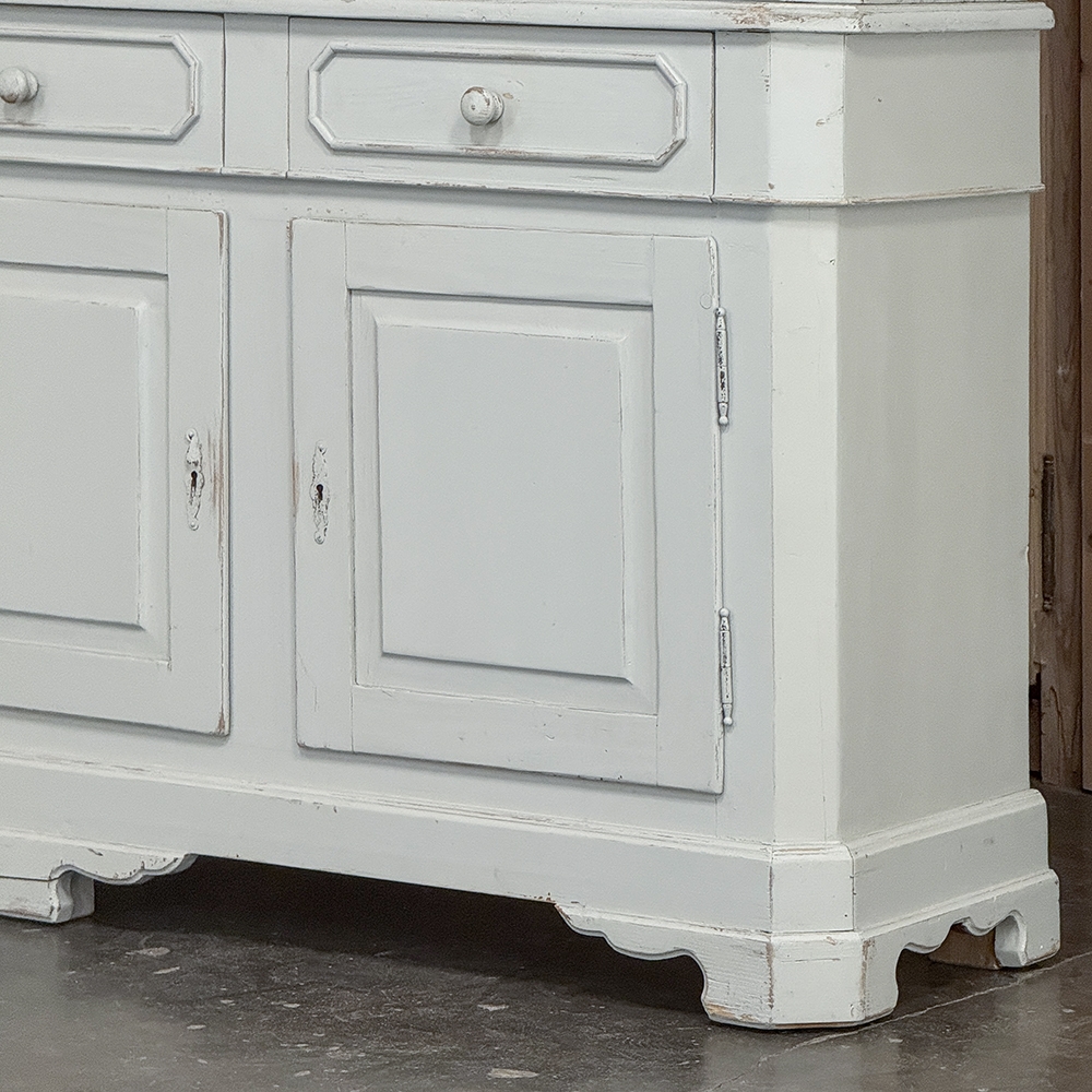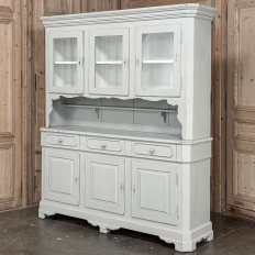 Sale19th Century French Louis Philippe Painted China Buffet represents the epitome of form melded with functionality! The tailored architecture is enhanced by bold molding on the crown and a classic pediment-style base below. In between, we have a three door glazed display case above, an open area suitable for serving with a shallow shelf for cups or display, and a three door/three drawer buffet below that provides copious storage! The entire piece features an antique white painted finish that shows a little distressed wear that only adds character. Even the interior of the upper tier has been painted the same white to make whatever you choose to display really "pop"! Use of barrel hinges on all doors ensures easy access. An excellent all-in-one choice for any room!