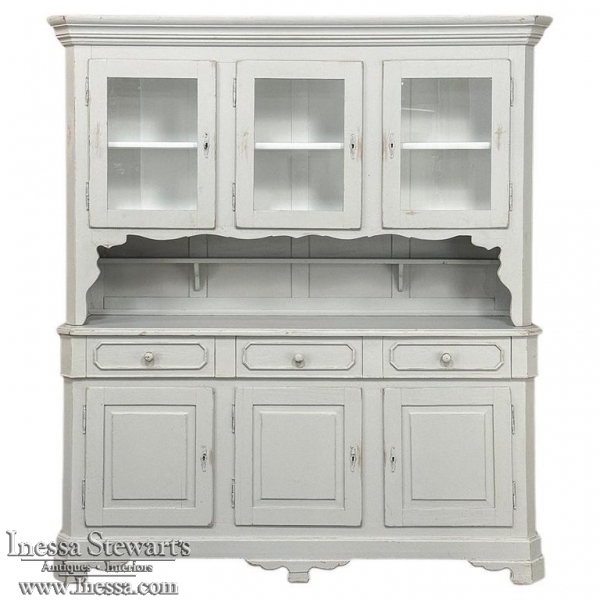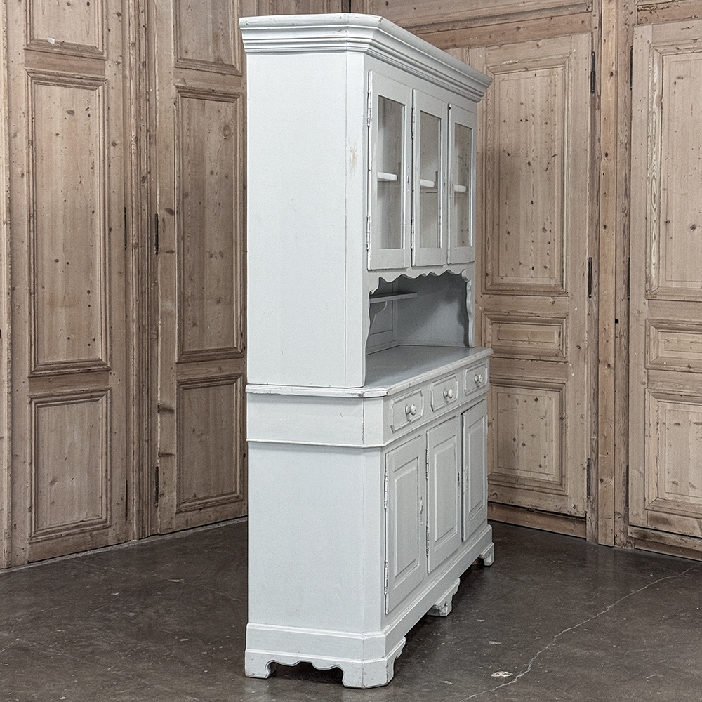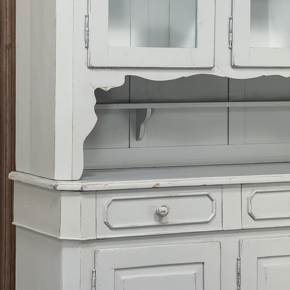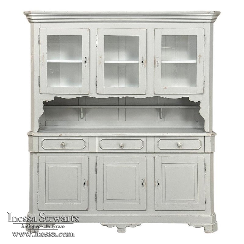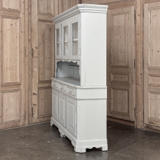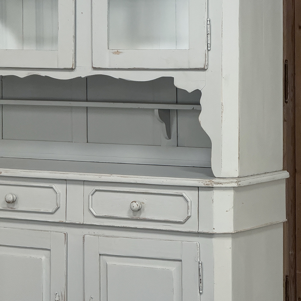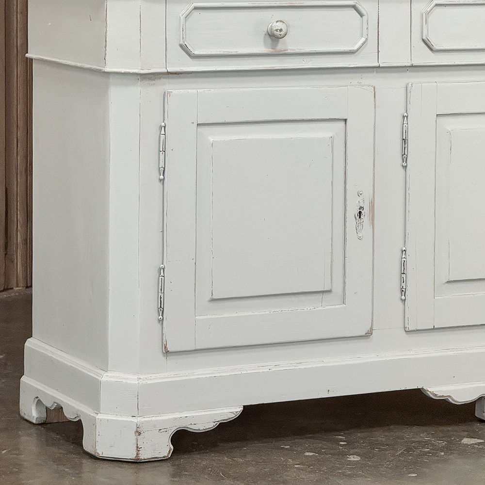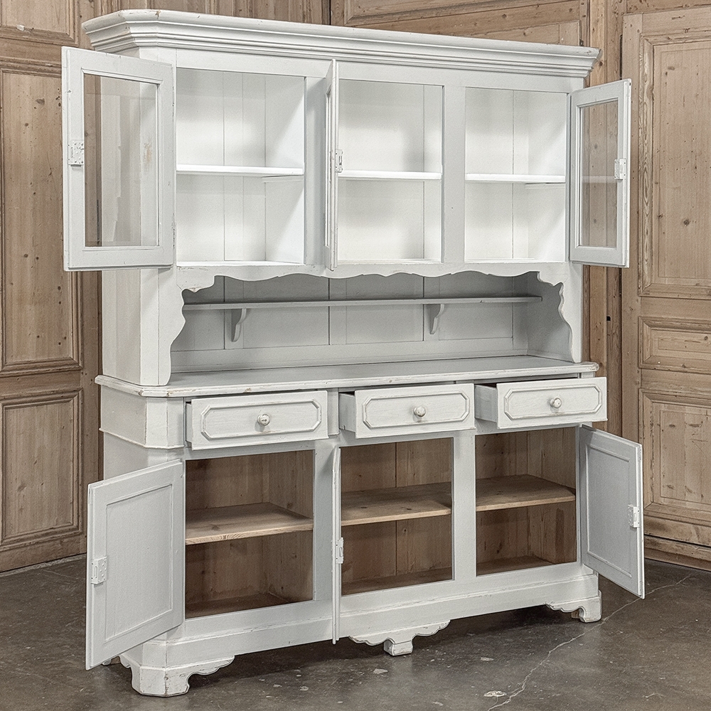 Sale19th Century French Louis Philippe Painted China Buffet represents the epitome of form melded with functionality! The tailored architecture is enhanced by bold molding on the crown and a classic pediment-style base below. In between, we have a three door glazed display case above, an open area suitable for serving with a shallow shelf for cups or display, and a three door/three drawer buffet below that provides copious storage! The entire piece features an antique white painted finish that shows a little distressed wear that only adds character. Even the interior of the upper tier has been painted the same white to make whatever you choose to display really "pop"! Use of barrel hinges on all doors ensures easy access. An excellent all-in-one choice for any room!