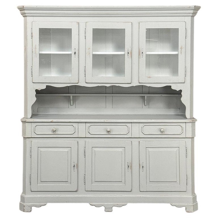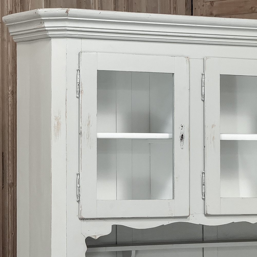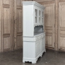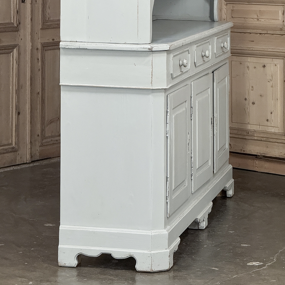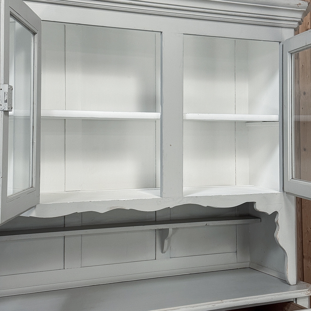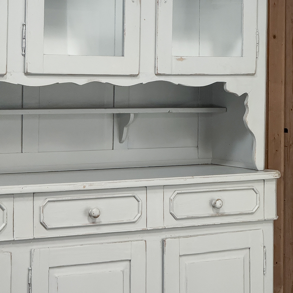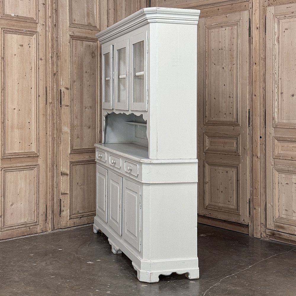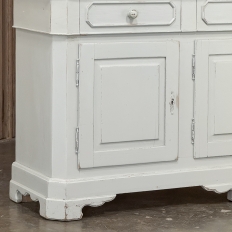 Sale19th Century French Louis Philippe Painted China Buffet represents the epitome of form melded with functionality! The tailored architecture is enhanced by bold molding on the crown and a classic pediment-style base below. In between, we have a three door glazed display case above, an open area suitable for serving with a shallow shelf for cups or display, and a three door/three drawer buffet below that provides copious storage! The entire piece features an antique white painted finish that shows a little distressed wear that only adds character. Even the interior of the upper tier has been painted the same white to make whatever you choose to display really "pop"! Use of barrel hinges on all doors ensures easy access. An excellent all-in-one choice for any room!