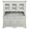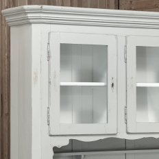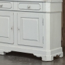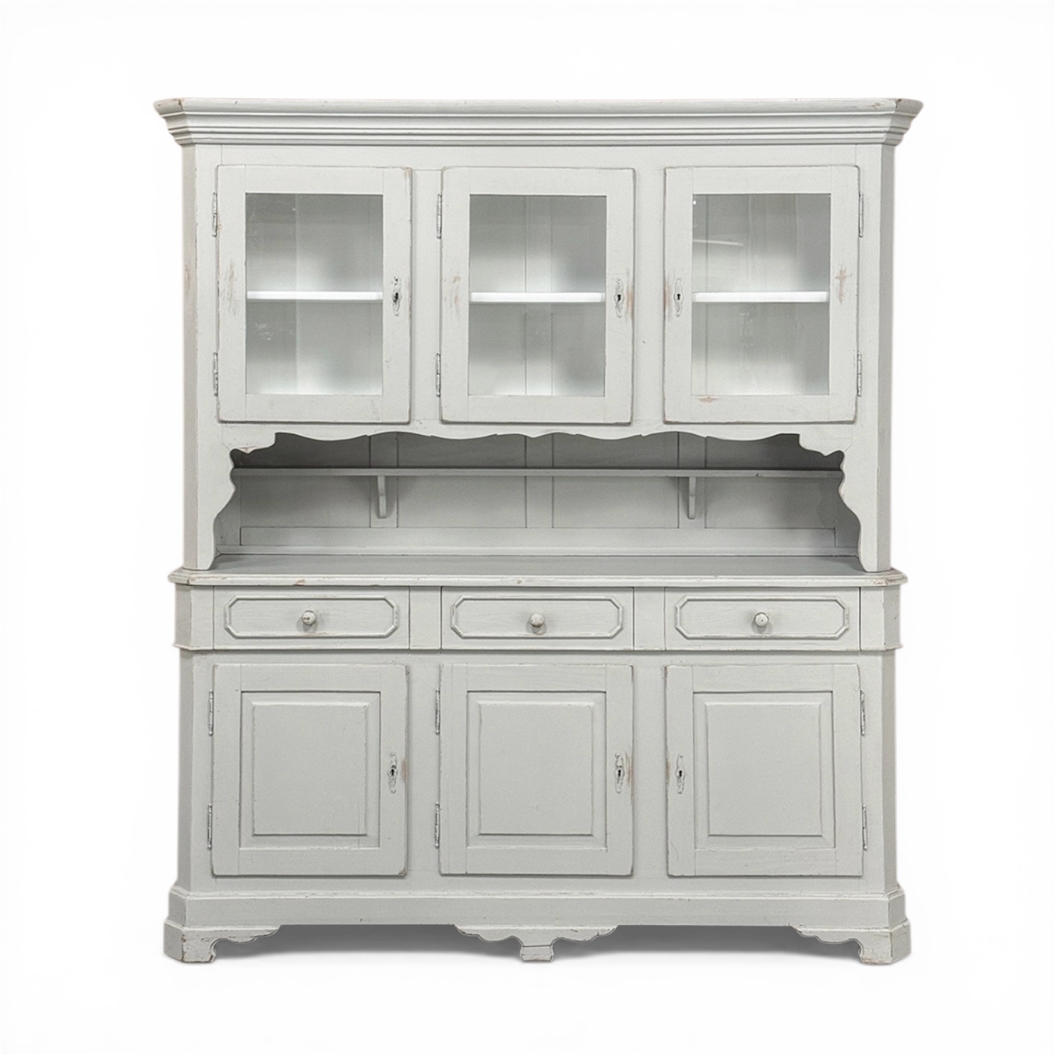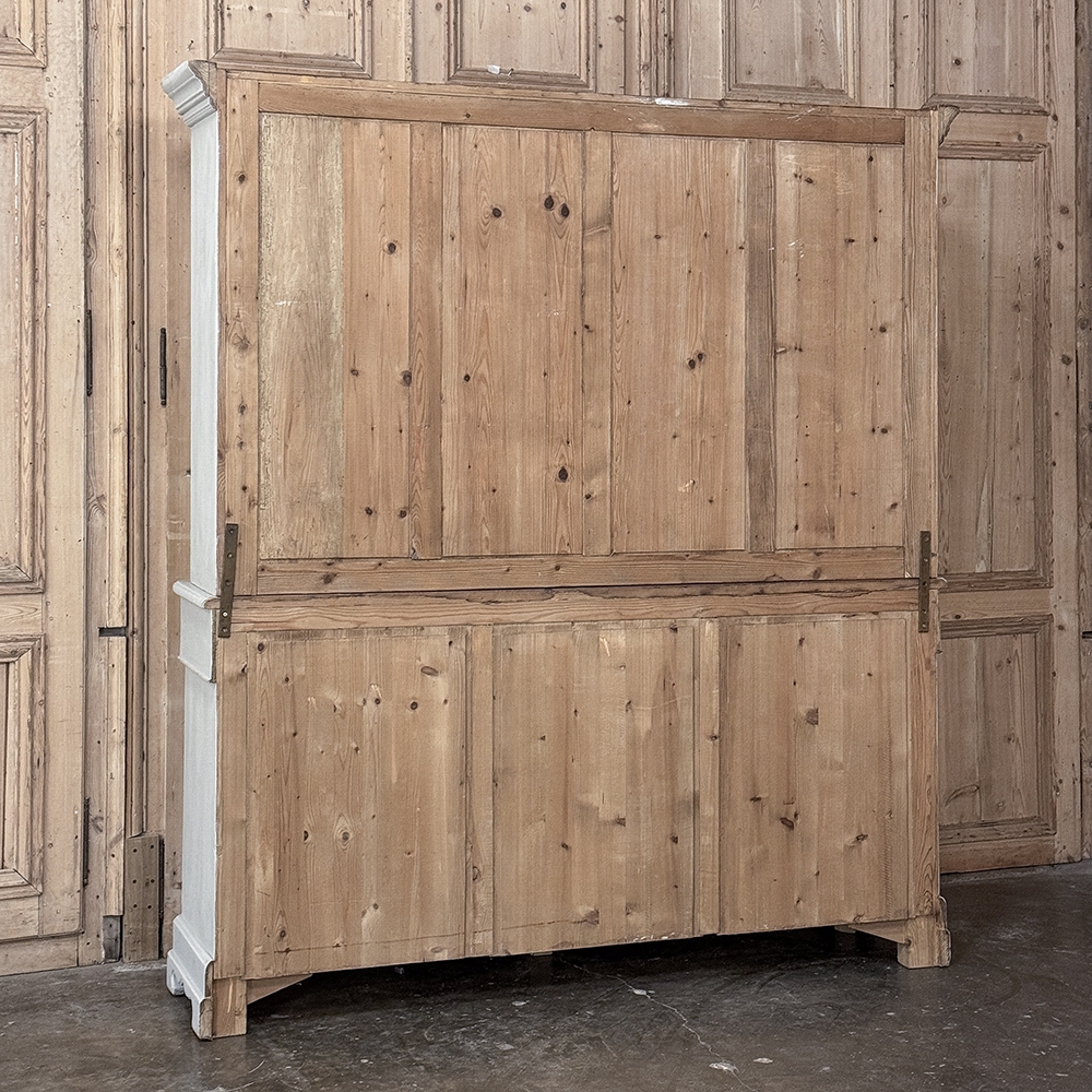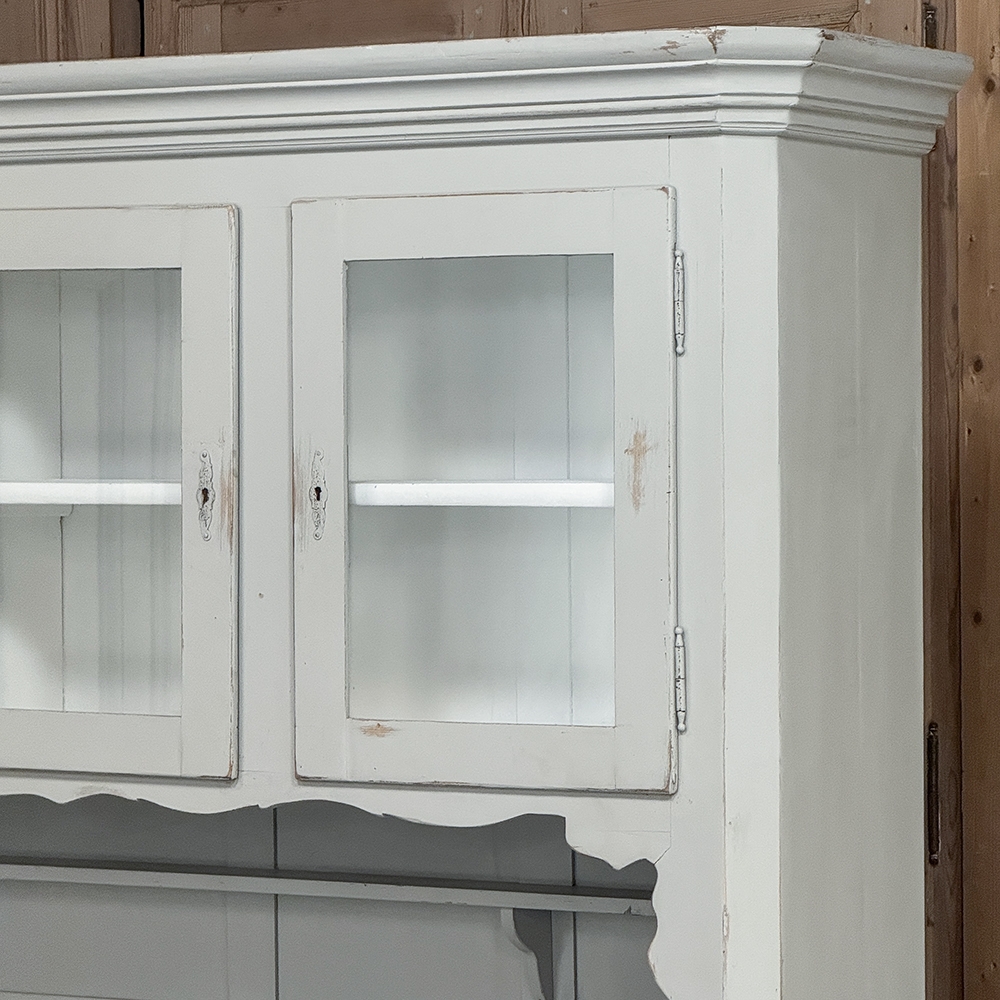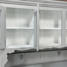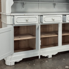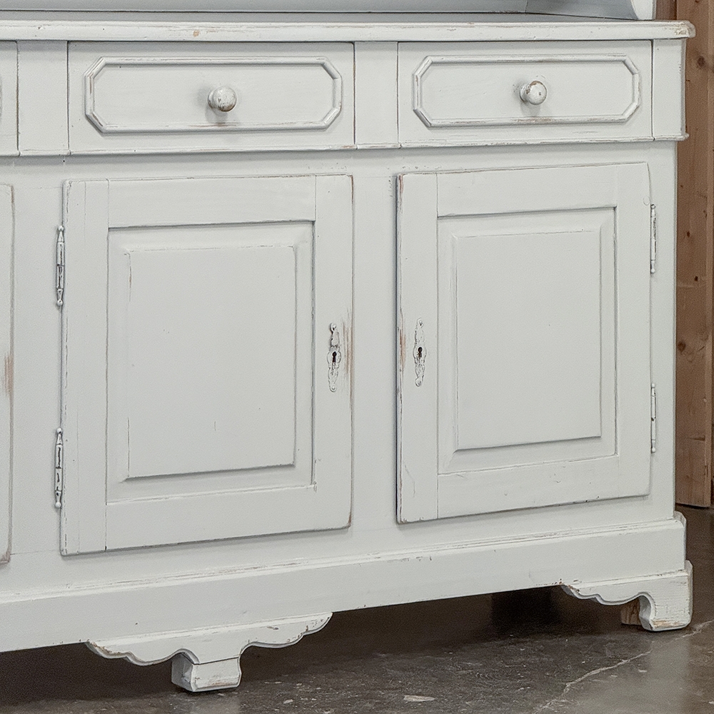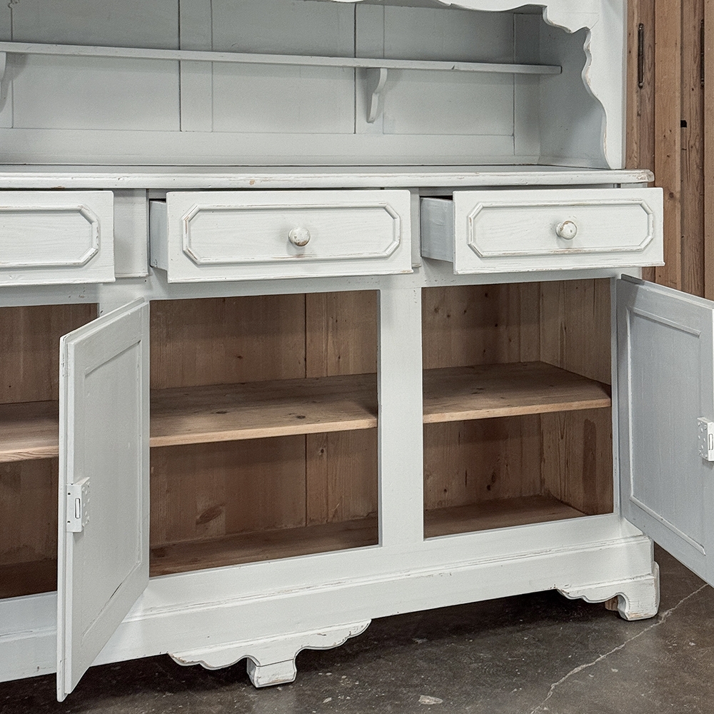 Sale19th Century French Louis Philippe Painted China Buffet represents the epitome of form melded with functionality! The tailored architecture is enhanced by bold molding on the crown and a classic pediment-style base below. In between, we have a three door glazed display case above, an open area suitable for serving with a shallow shelf for cups or display, and a three door/three drawer buffet below that provides copious storage! The entire piece features an antique white painted finish that shows a little distressed wear that only adds character. Even the interior of the upper tier has been painted the same white to make whatever you choose to display really "pop"! Use of barrel hinges on all doors ensures easy access. An excellent all-in-one choice for any room!