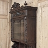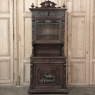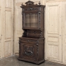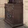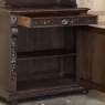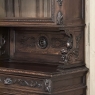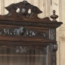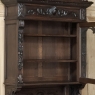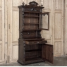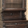 Sale19th Century French Renaissance Revival Hunt Buffet is an incredible example of the grandeur of the Renaissance Revival that captivated Europe during the last quarter of the 1800s. Utilizing select old-growth oak, the craftsmen created an impressive design that provides visual impact, yet is relatively narrow! An heraldic crest adorns the crown, flanked by arches undulating outwards towards the corners fitted with large turned finials. Bold crown molding with carving appears over the bonnet, also carved with a full relief heraldic crest flanked by foliates and framed by large rosettes on the corners. Below that is the glazed upper door, framed by carved molding and accented with carved overlay, providing a clear view into the display tier above which is fitted with two original adjustable shelves for three surfaces total. The glazed door is flanked by della robia style carving in relief on the corner pilasters, enhanced with corbels at the top and upturned acanthus flourishes at the base. The top display tier rests on the intermediate middle section, which consists of a finely carved backsplash and two supports luxuriously carved with more della robia carvings in bold relief. The carvings flank a modest display surface. Under that is the main cabinet, which duplicates the surrounding adornment of the upper tier with the exception of a lion's head at the center that also doubles as the drawer pull. The door opens wide to provide storage below with two surfaces, and the door itself is a work of the sculptor's art! Celebrating nature once again, the artists sculpted a game bird in the wild in glorious full relief for a splendid ode to the blessings of the Creator. Bold molding and bun feet complete the look.