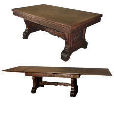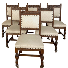 Pair Antique Italian Renaissance Side Chairs are elaborate expressions of the style, celebrating the beauty and majesty of earthly wonders in sculpted wood. The high, arched seatbacks are contoured for comfort, and feature foliates, scrollwork, rosettes and more, all with a pierce-carved seatback splat. Fine tapestry upholstery with a complementary...
