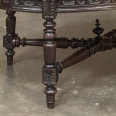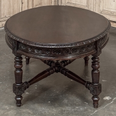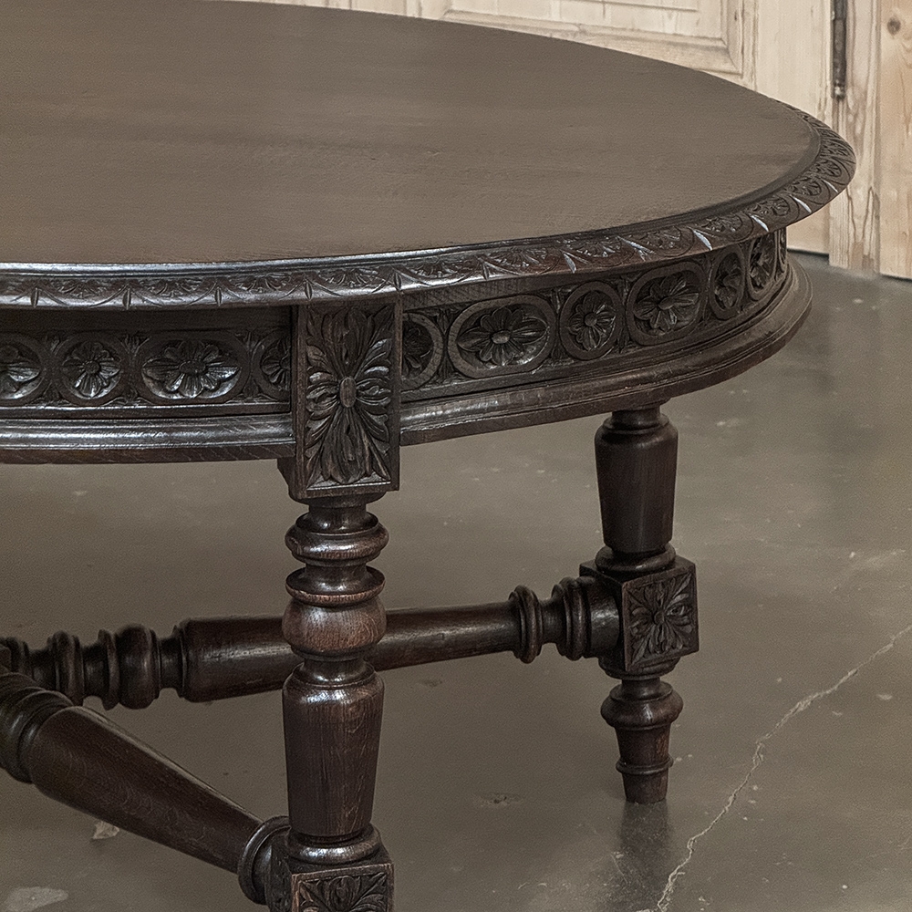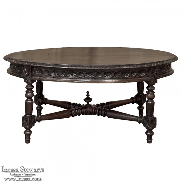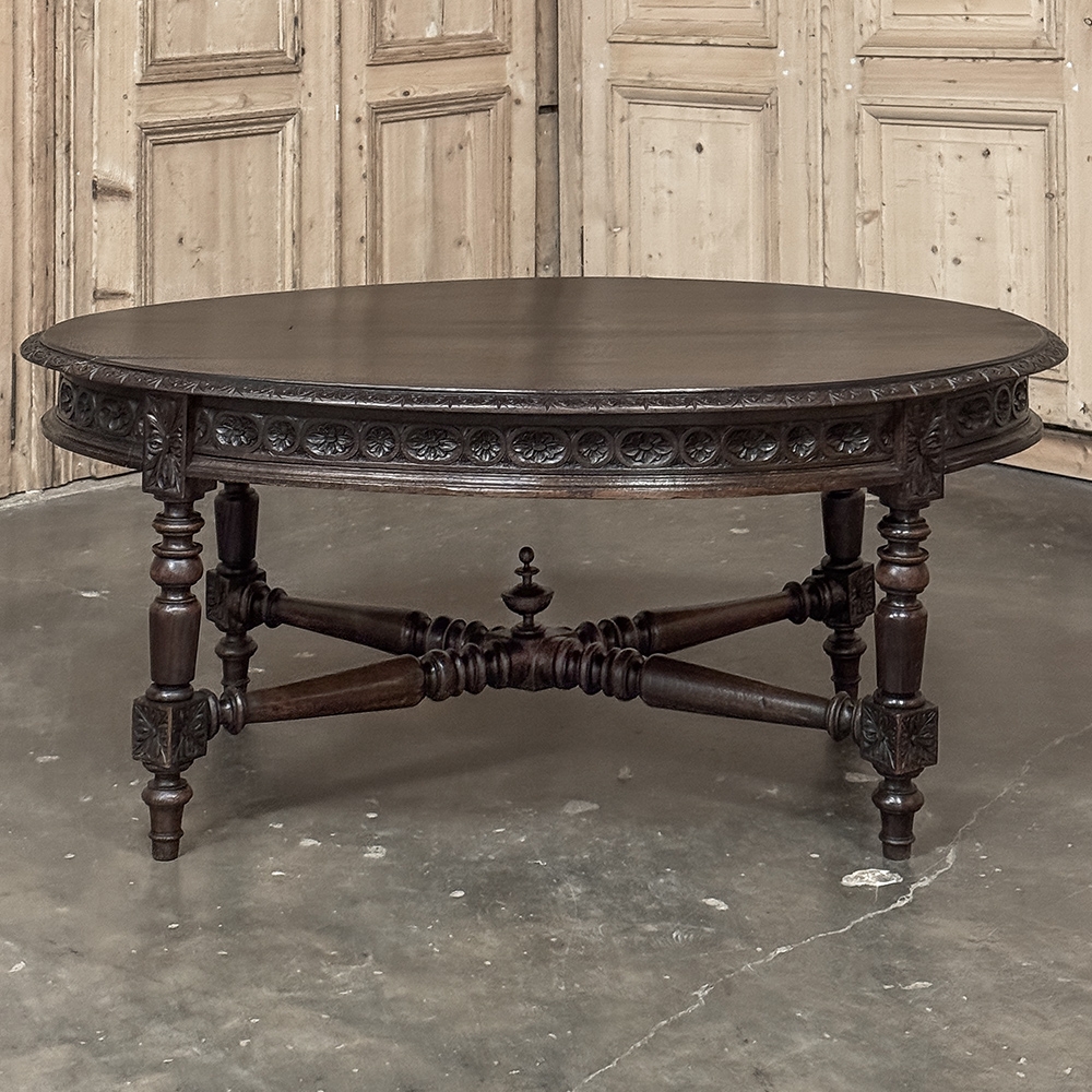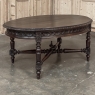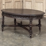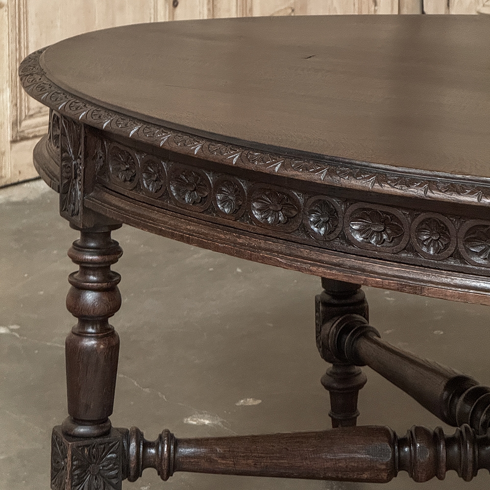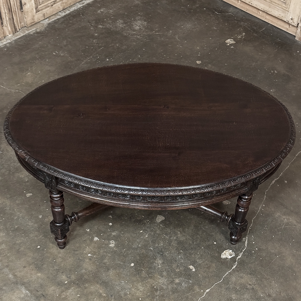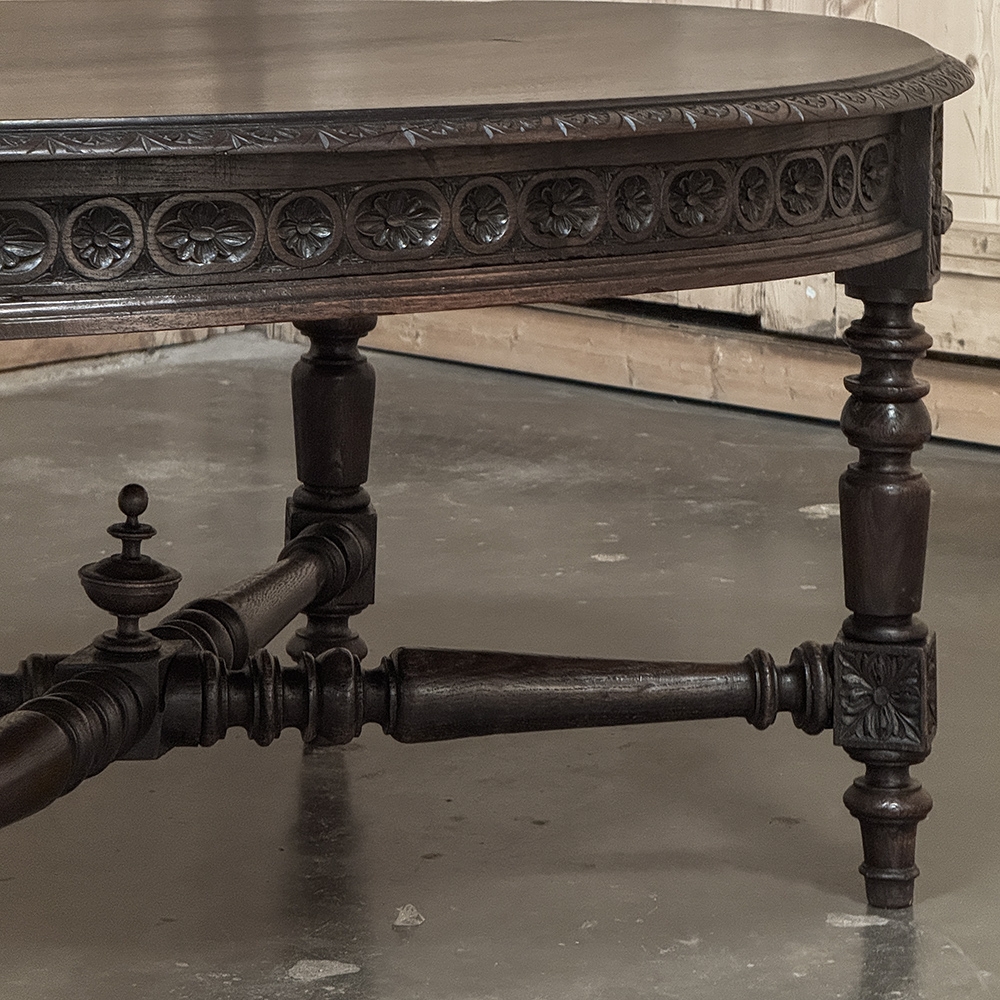 19th Century French Louis XVI Oval Coffee Table is a masterwork of the classical style! Crafted from fine French walnut, it features a generously sized oval top trimmed in demilune bordering all around, with an apron below also carved with a variation of Greek coin with alternating round and oval rosettes all around, interrupted only by the rectangular rosettes on the plinth blocks that connect to the elegantly turned legs. The legs are joined below with smaller plinth blocks, again carved with rosettes, that create a juncture for the "X" shaped stretcher which consists of stretchers turned in the same manner as the legs, centered with a turned finial. Perfect for placement in any room designed for daily living or entertaining, the design presents no corners whatsoever in the design making it the most traffic friendly table you'll own!
