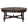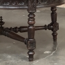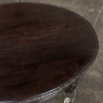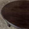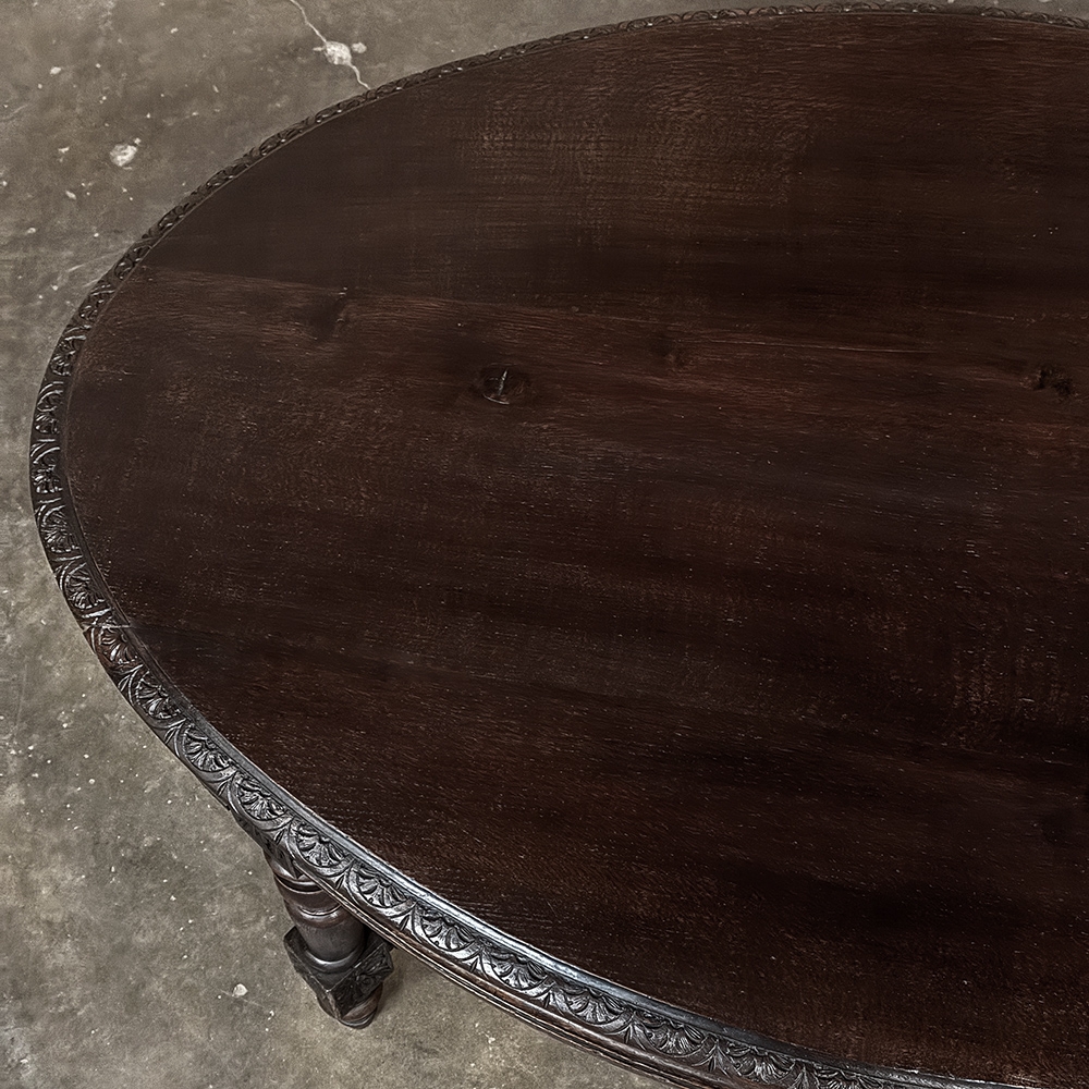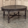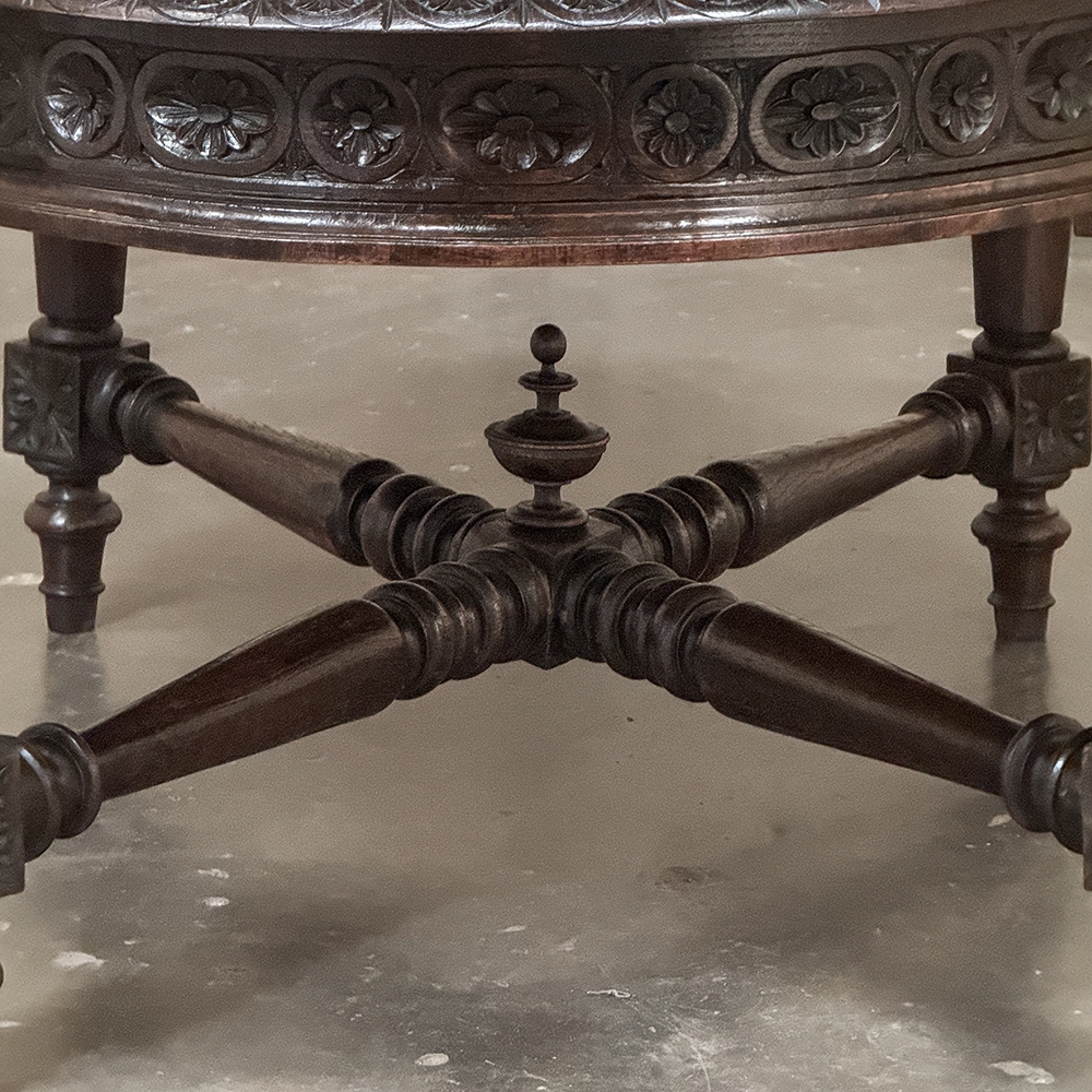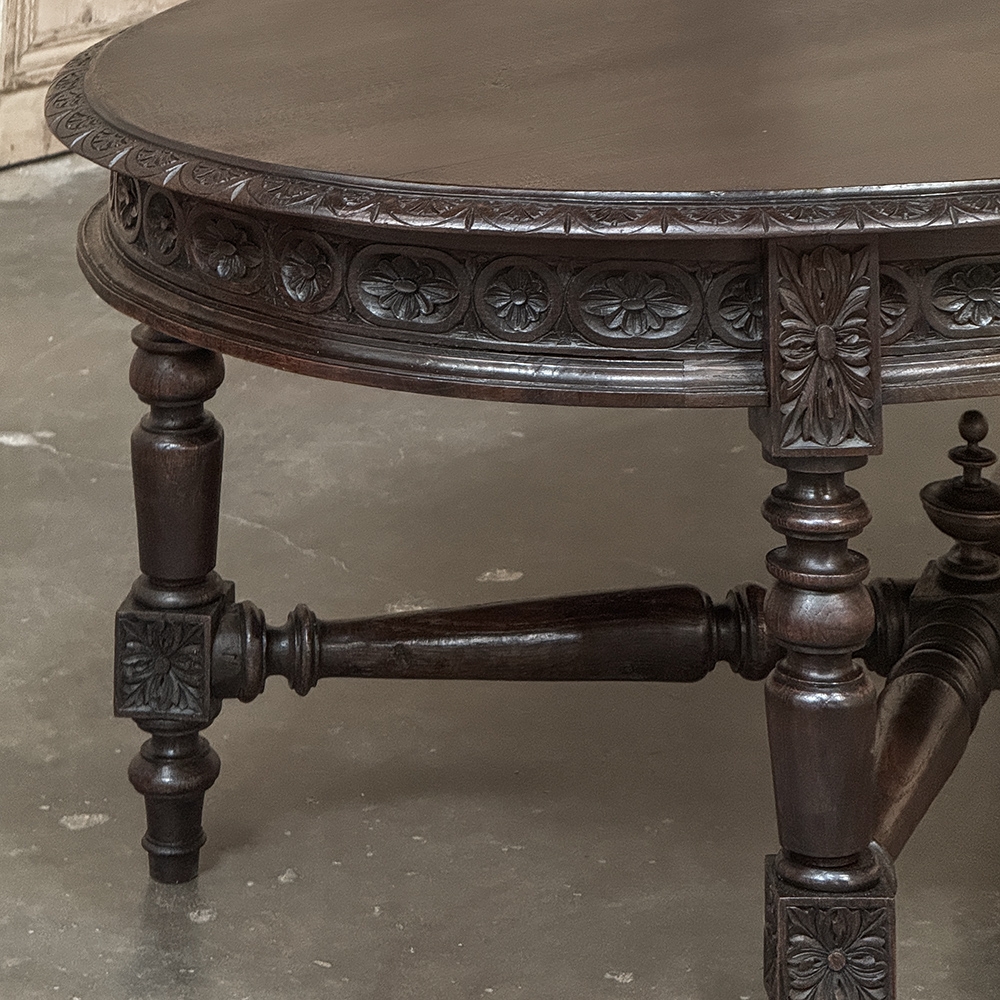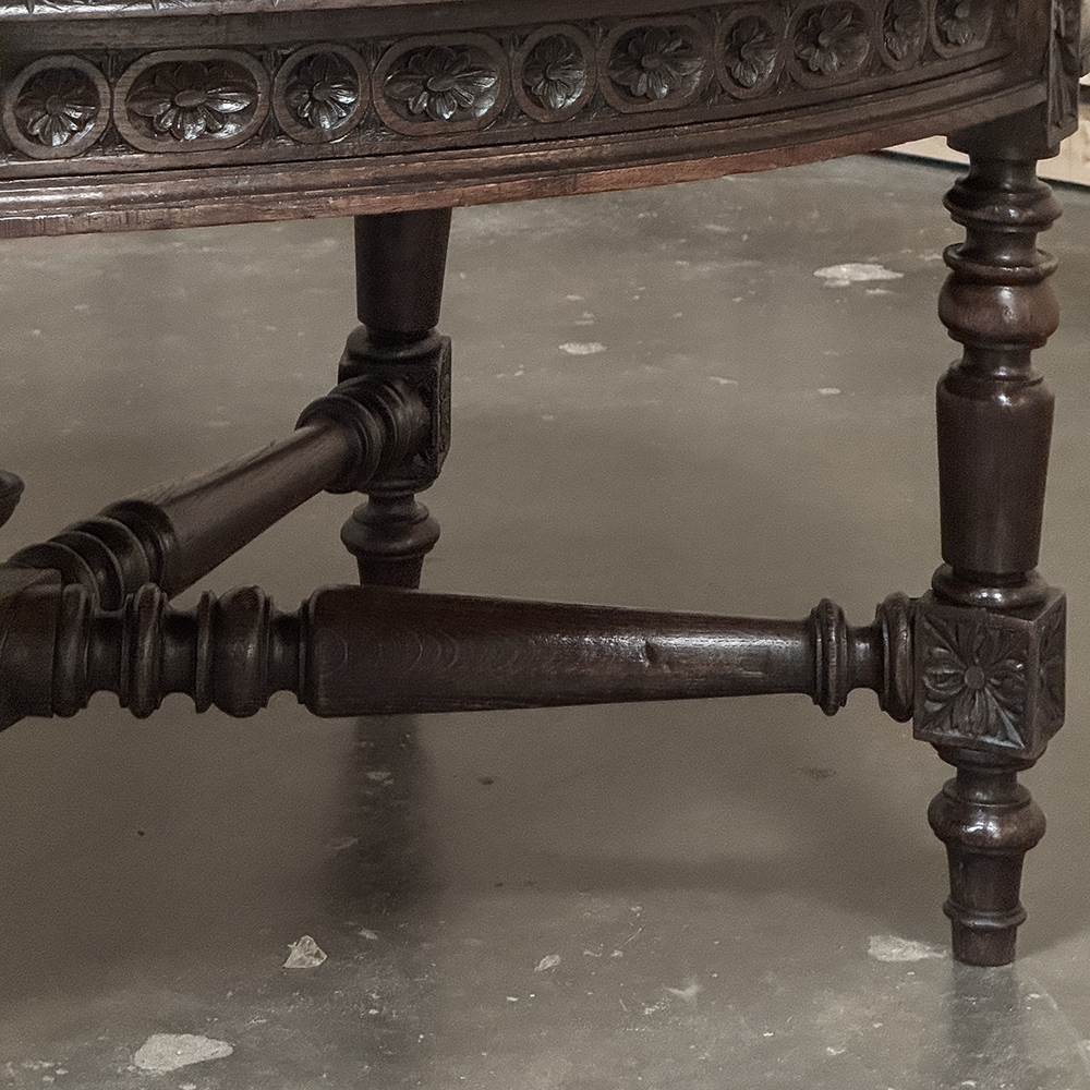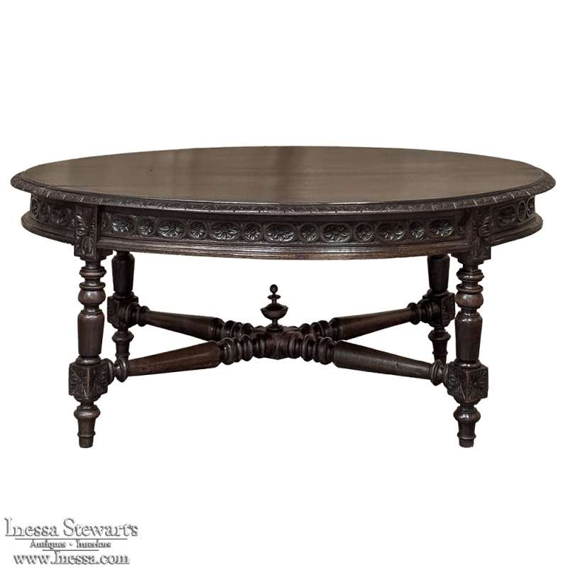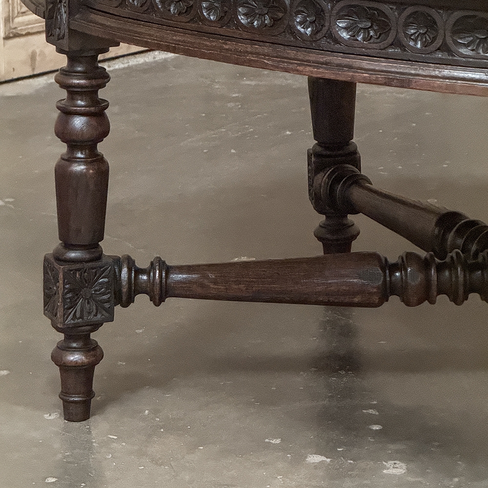 19th Century French Louis XVI Oval Coffee Table is a masterwork of the classical style! Crafted from fine French walnut, it features a generously sized oval top trimmed in demilune bordering all around, with an apron below also carved with a variation of Greek coin with alternating round and oval rosettes all around, interrupted only by the rectangular rosettes on the plinth blocks that connect to the elegantly turned legs. The legs are joined below with smaller plinth blocks, again carved with rosettes, that create a juncture for the "X" shaped stretcher which consists of stretchers turned in the same manner as the legs, centered with a turned finial. Perfect for placement in any room designed for daily living or entertaining, the design presents no corners whatsoever in the design making it the most traffic friendly table you'll own!