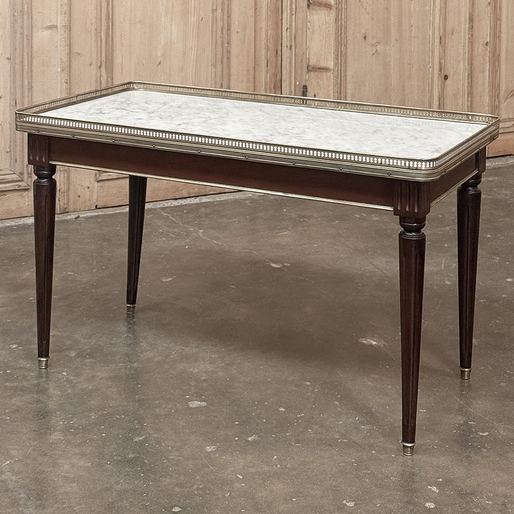Antique French Louis XVI Mahogany Coffee Table with Carrara Marble is perfect for adding the finishing formal touch to your entertaining room. Tailored lines include an apron bordered with brass trim connecting four tapered and fluted legs tipped with brass feet. On top appears luxuriously veined Carrara marble surrounded by a gallery style brass railing which also incorporates the brass trim molding around the top. The rich natural beauty of the exotic imported mahogany only adds to the allure.