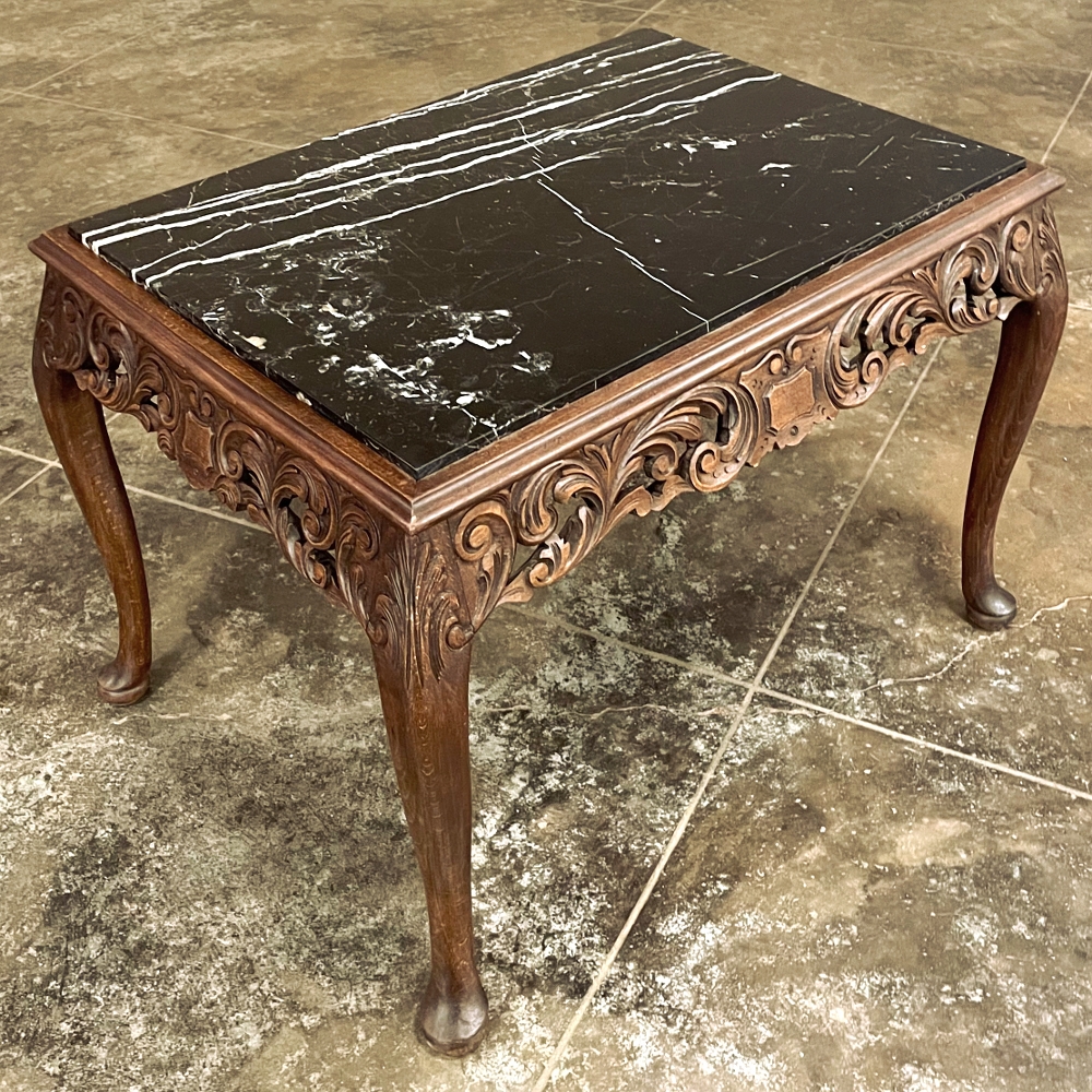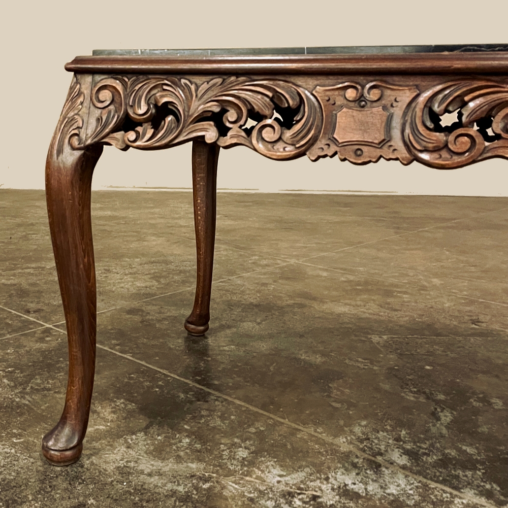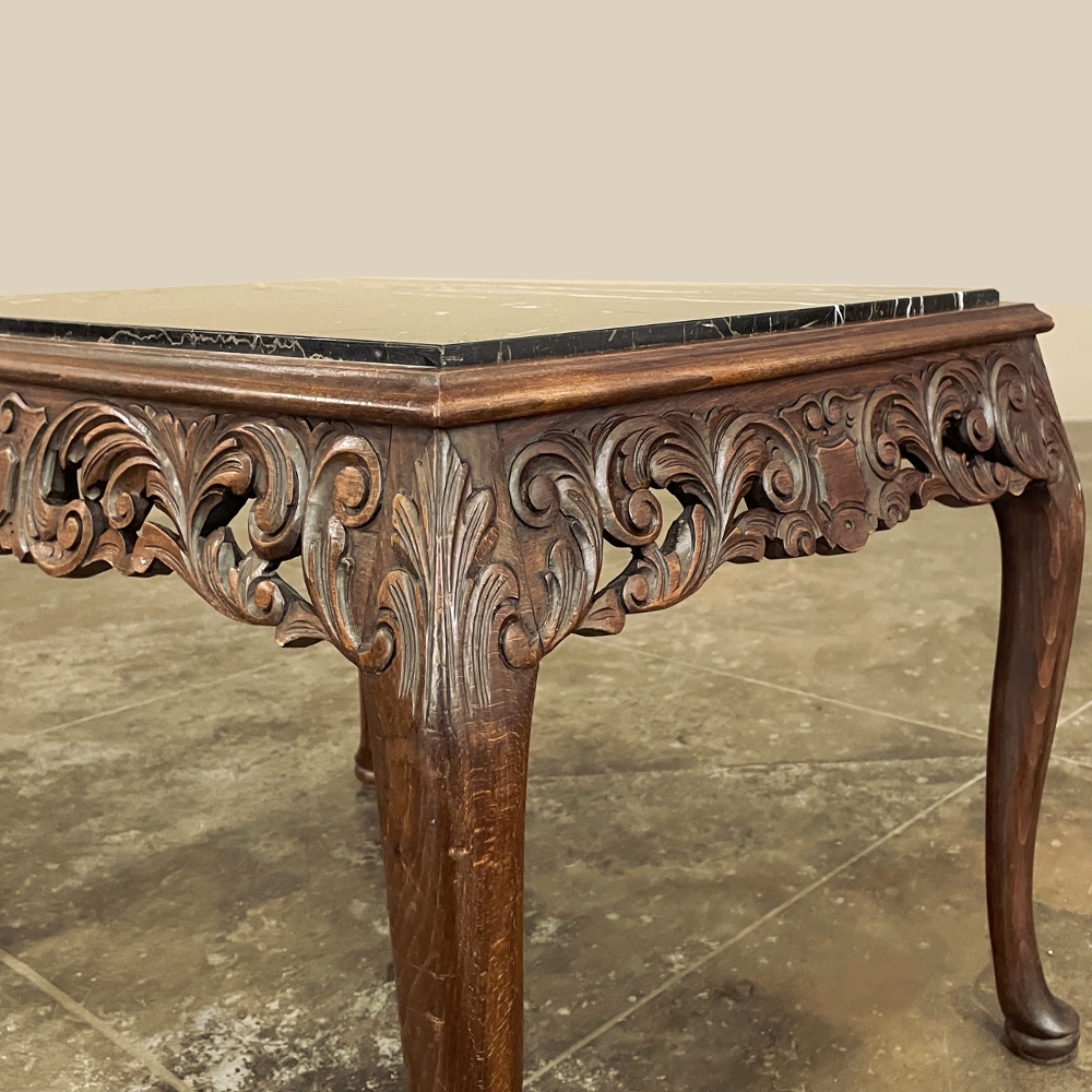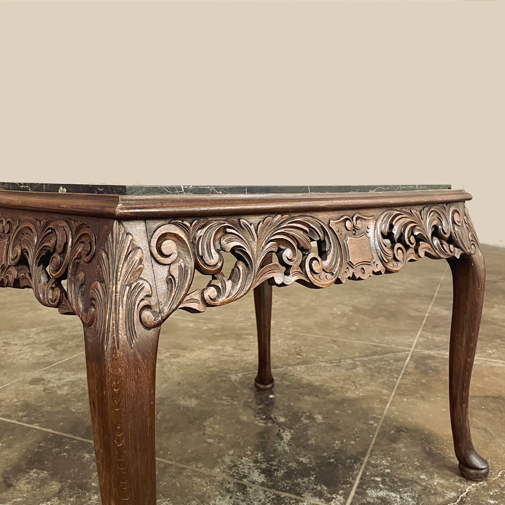 Antique Italian Baroque Fruitwood Marble Top Coffee Table is a beautiful expression of the Baroque revival style as expressed in a restrained manner from solid fruitwood, sculpted all around the apron completely through the wood for a stunning three dimensional effect. Four gracefully scrolled legs with club feet provide support, while the top is a gorgeous piece of subtly veined black Italian marble that will provide decades of enjoyment for your family!