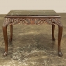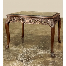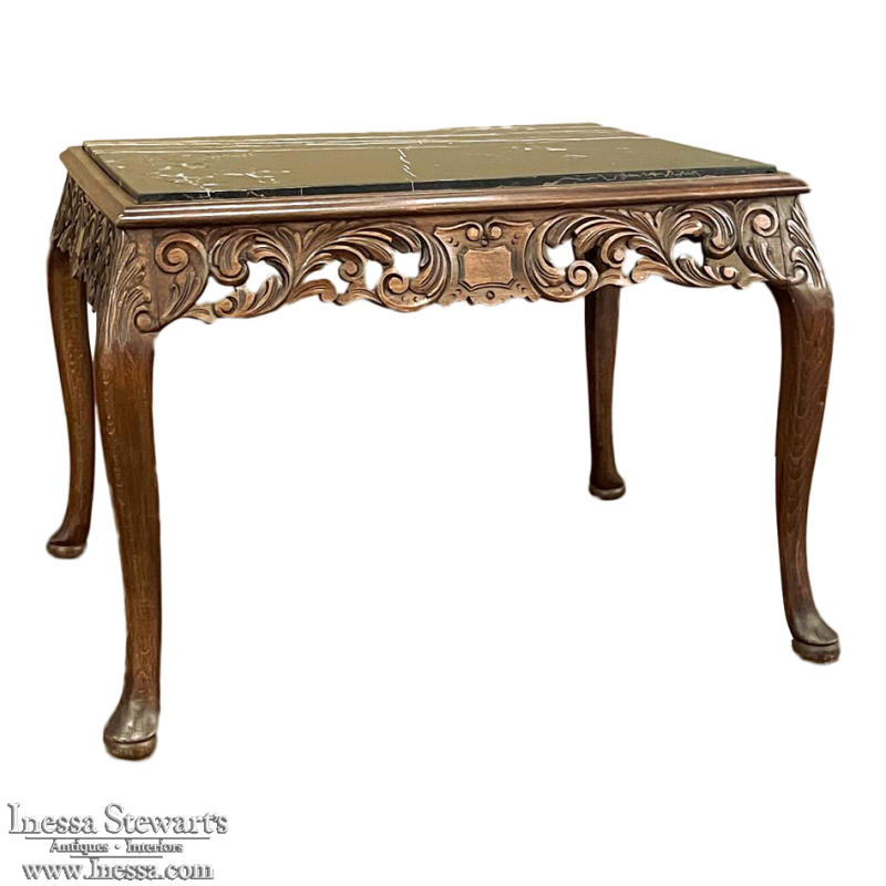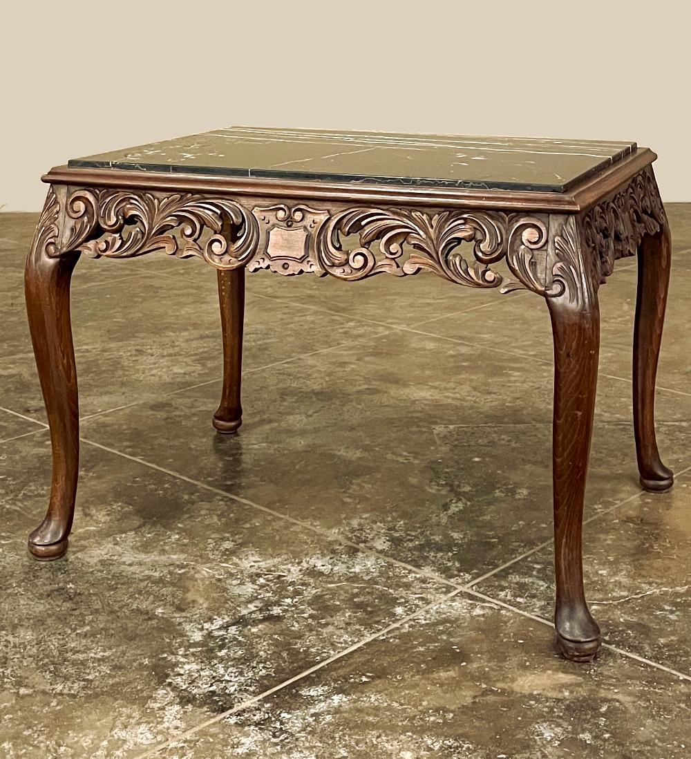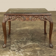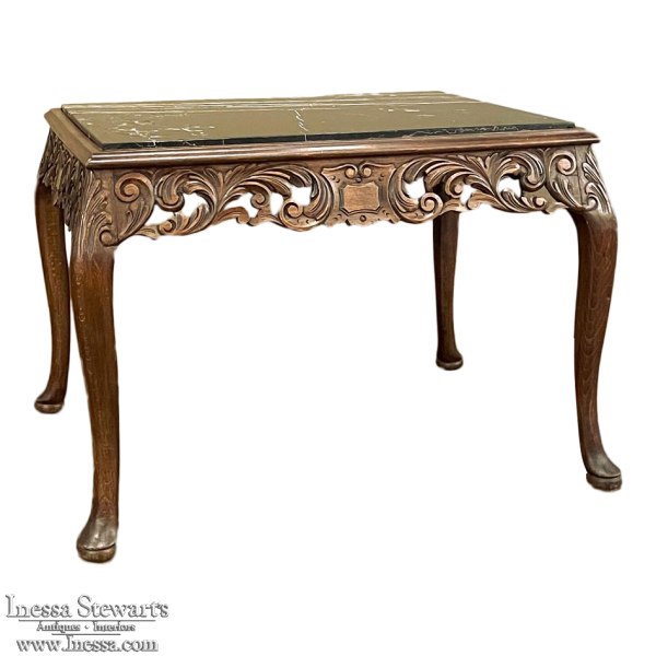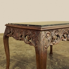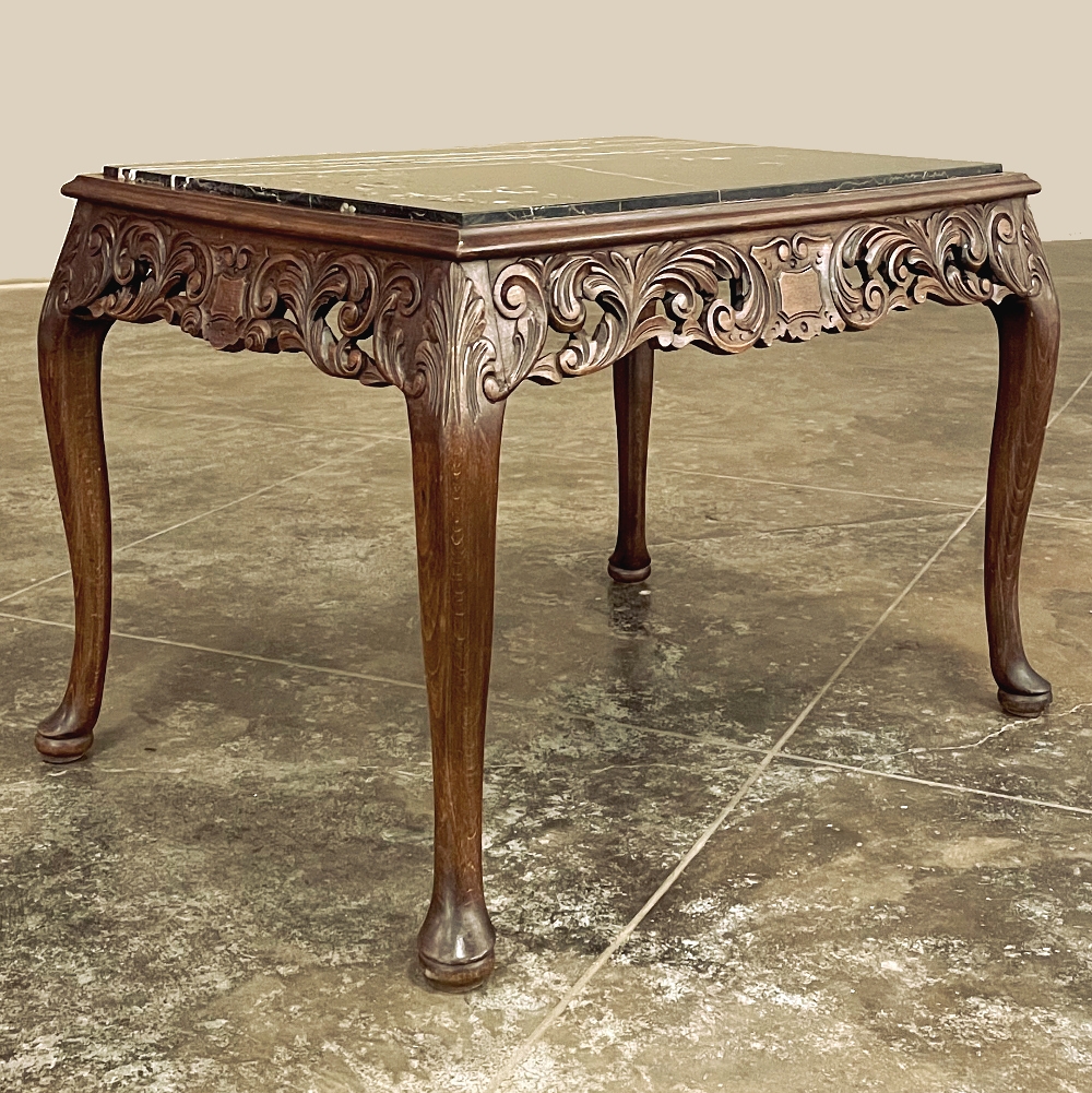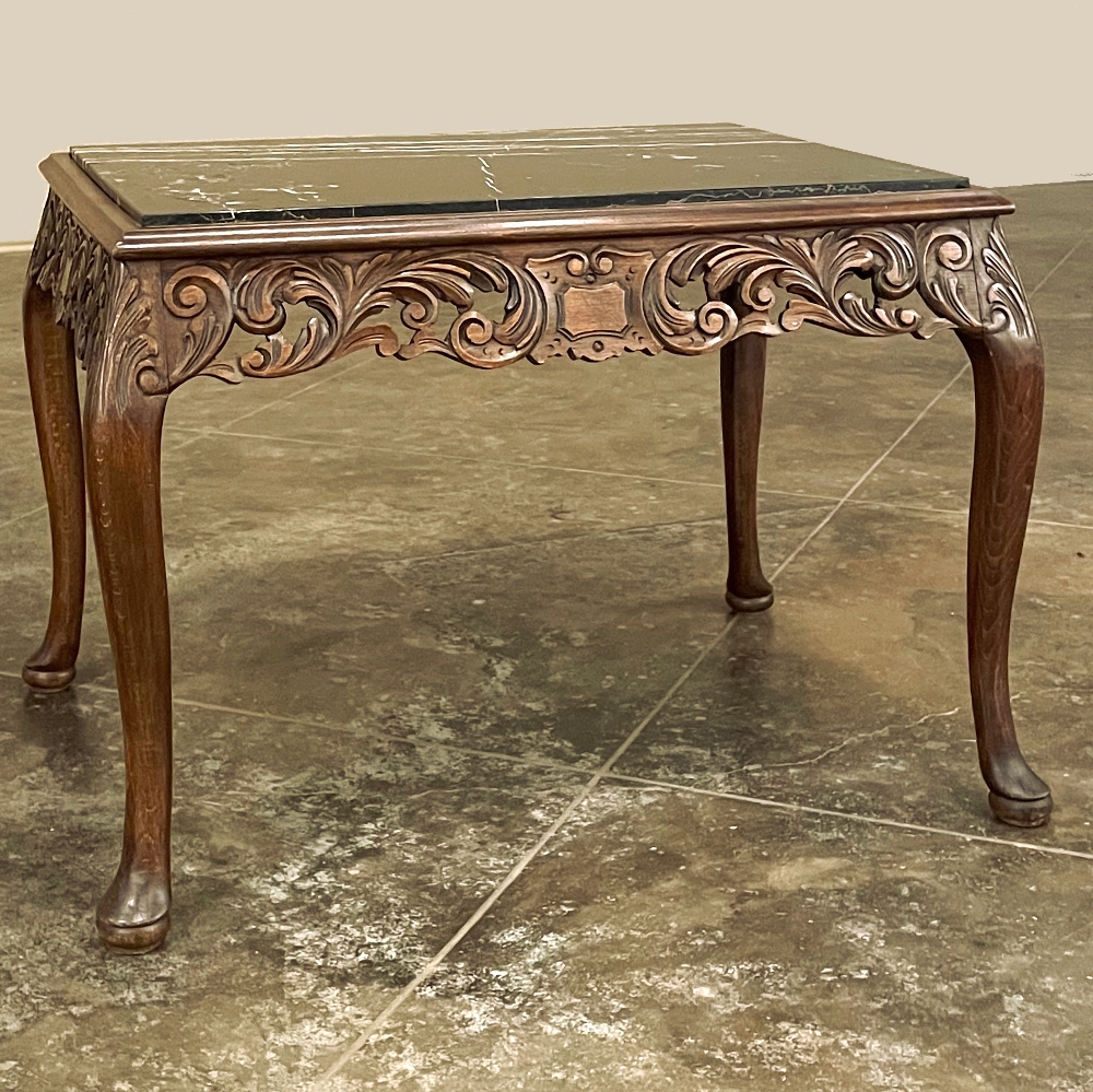 Antique Italian Baroque Fruitwood Marble Top Coffee Table is a beautiful expression of the Baroque revival style as expressed in a restrained manner from solid fruitwood, sculpted all around the apron completely through the wood for a stunning three dimensional effect. Four gracefully scrolled legs with club feet provide support, while the top is a gorgeous piece of subtly veined black Italian marble that will provide decades of enjoyment for your family!