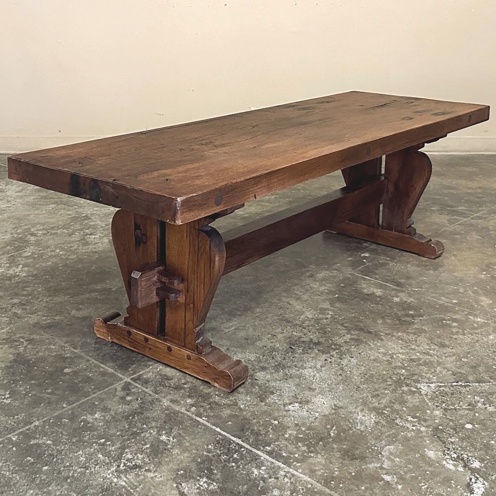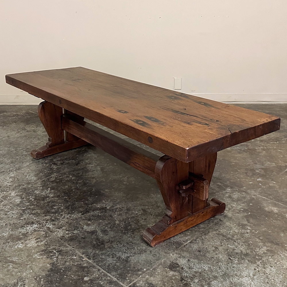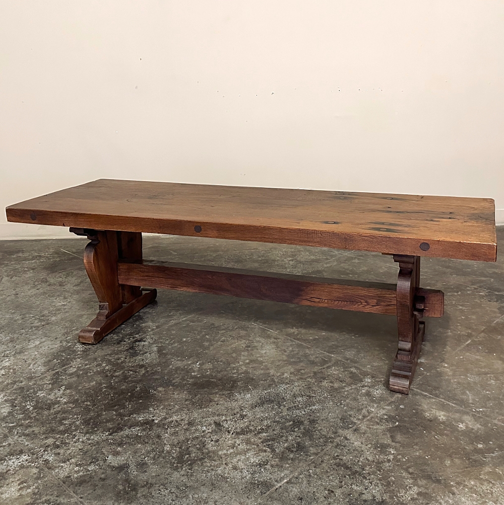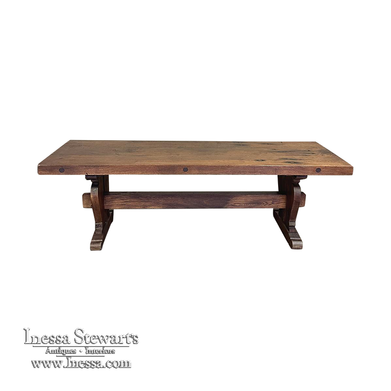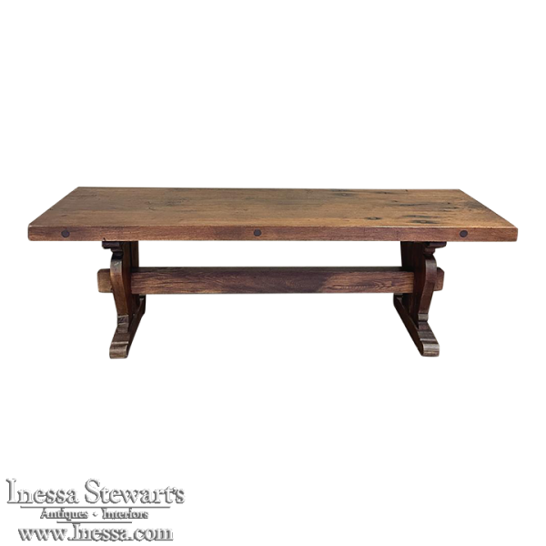 Antique Rustic Country French Trestle Coffee Table combines craftsmanship, timeless style and extraordinary longevity all in one! The charm of the rustic design dates back centuries, with twin contoured legs on each end separated by a gap sufficient to contain the trestle which is shimmed into place, a method that has produced rock-solid furniture since before written history. The legs are affixed to transverse legs for stability, with a similar cross piece above that mounts to the bottom of the extra-thick solid planks of old-growth oak that make up the top. Ideal for the active family, it will bring a smile to your face at the end of each workday!