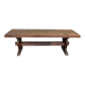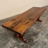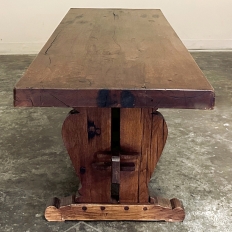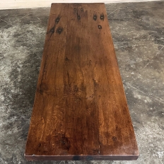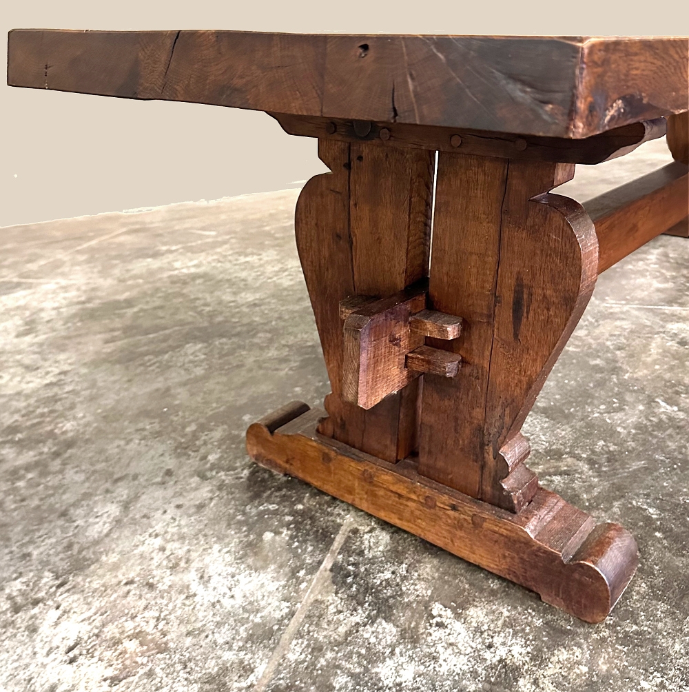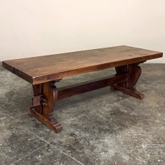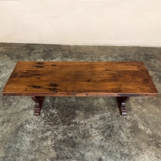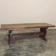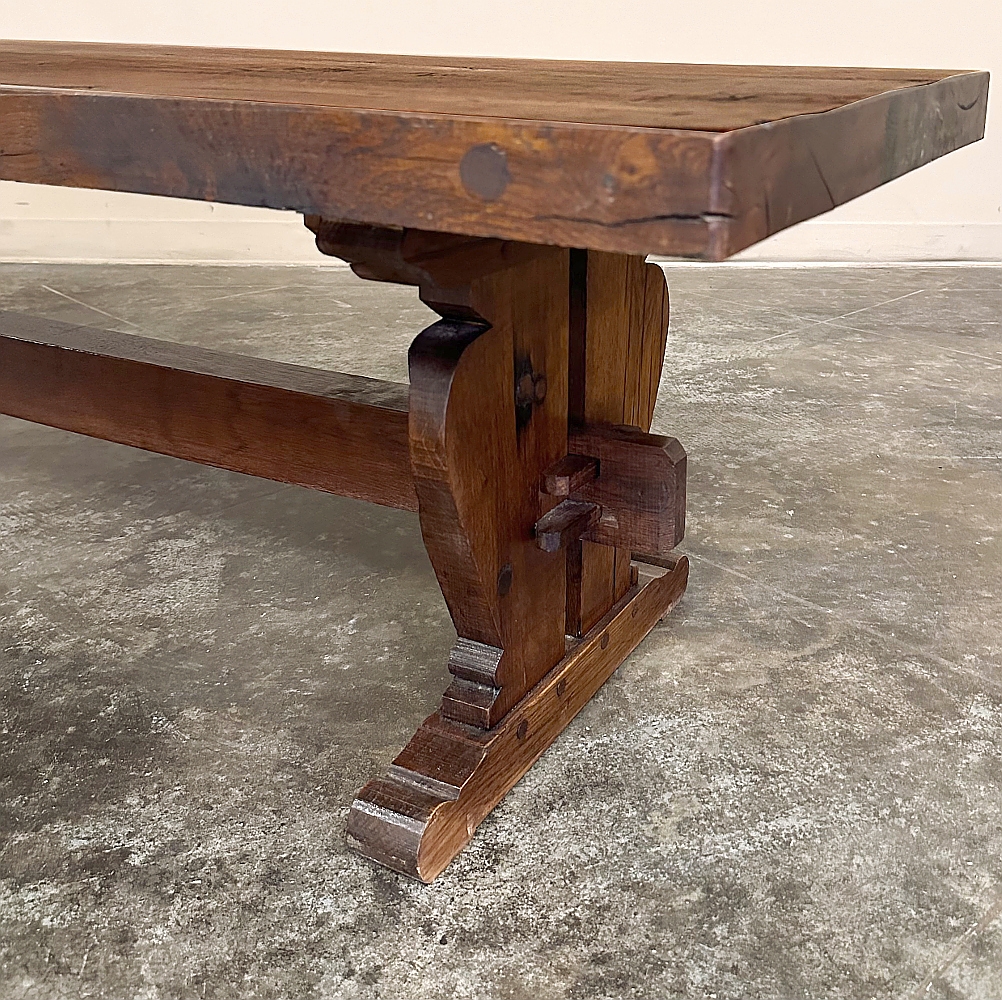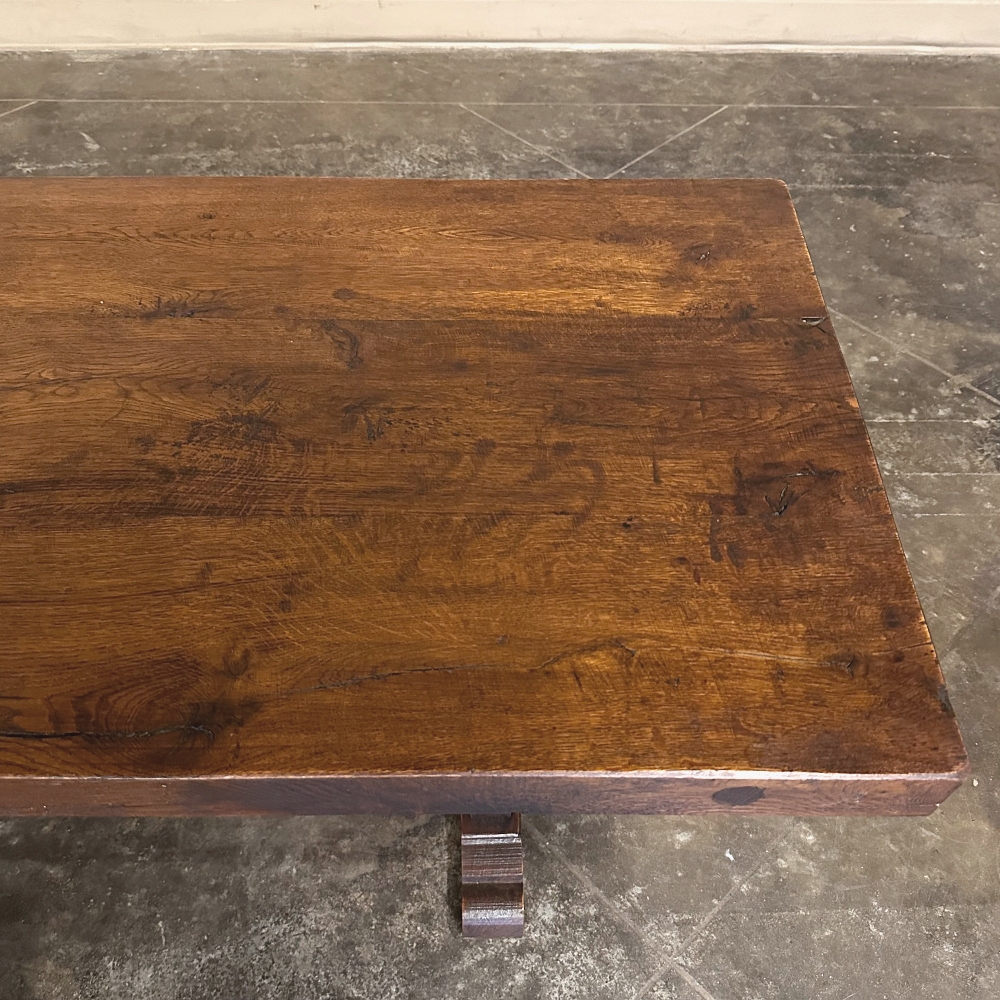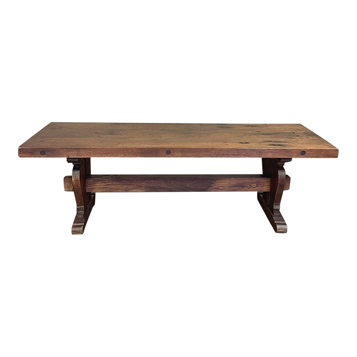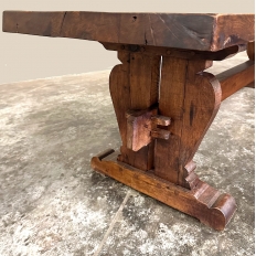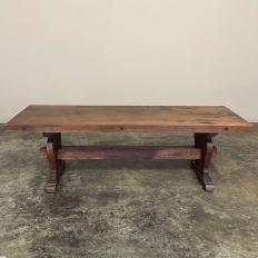 Antique Rustic Country French Trestle Coffee Table combines craftsmanship, timeless style and extraordinary longevity all in one! The charm of the rustic design dates back centuries, with twin contoured legs on each end separated by a gap sufficient to contain the trestle which is shimmed into place, a method that has produced rock-solid furniture since before written history. The legs are affixed to transverse legs for stability, with a similar cross piece above that mounts to the bottom of the extra-thick solid planks of old-growth oak that make up the top. Ideal for the active family, it will bring a smile to your face at the end of each workday!