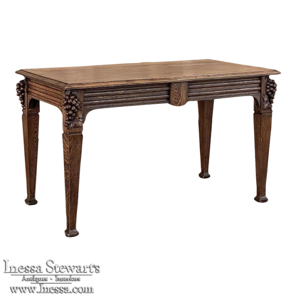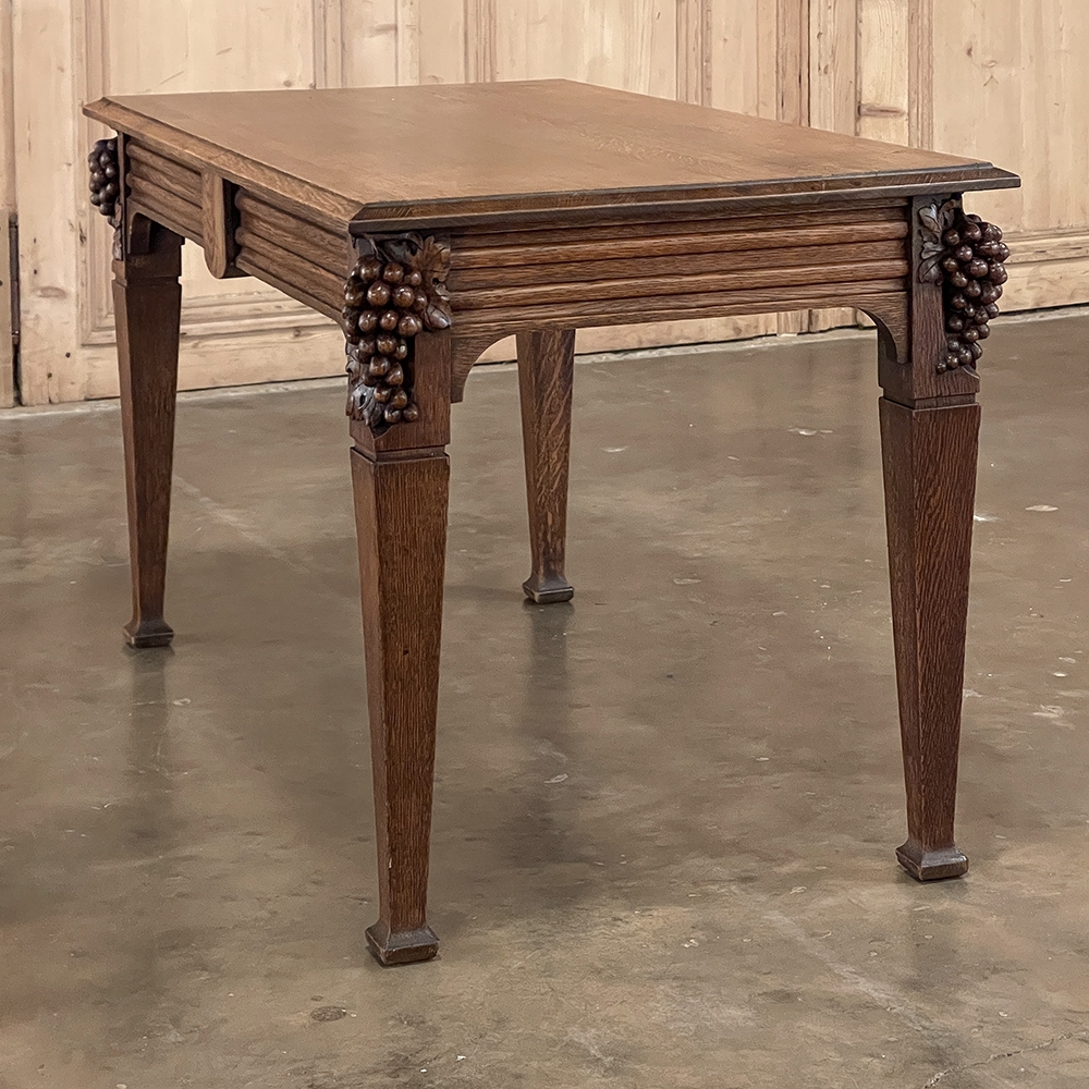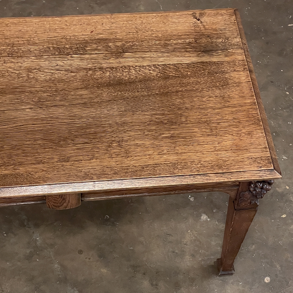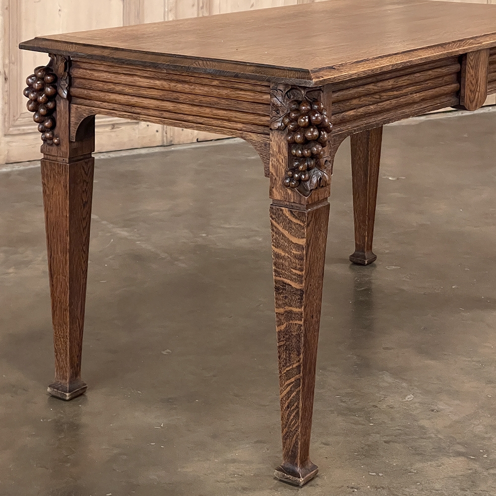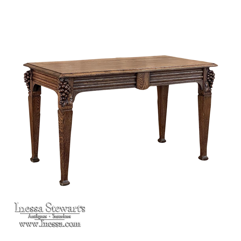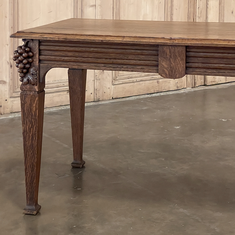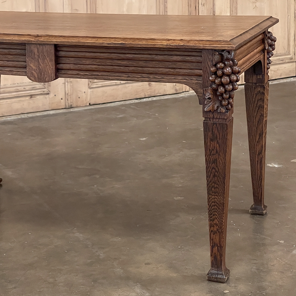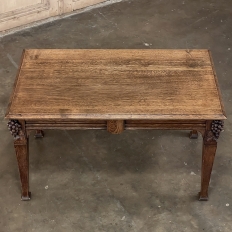 SaleArt Nouveau Period French Chestnut Coffee Table is a splendidly preserved example of one of Belgium and France's most significant contributions to the style world during a period of prosperity at the end of the Belle Epoque. The Art Nouveau style is a favorite of many discriminating connoisseurs, featuring a uniqueness of line and decoration. In this example, the generously sized table is lavished with full relief carvings of grape clusters with leaves on each corner, under which tapered and faceted legs extend down to flared feet. The apron design is tailored with parallel half-rounds and a shield form centered on and protruding from each long side. The table is also finished the same all around, making it ideal for placement anywhere a coffee or cocktail table is needed, especially one which exudes timeless style!