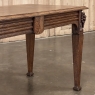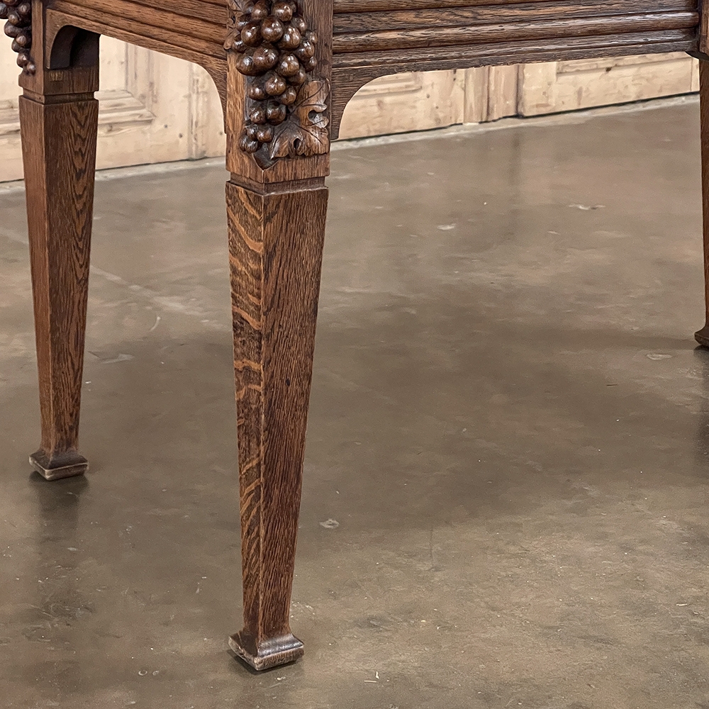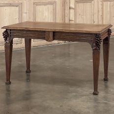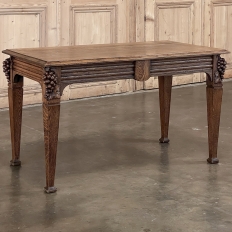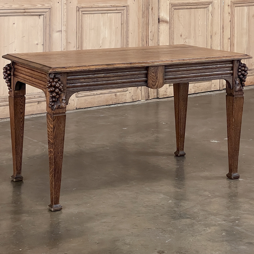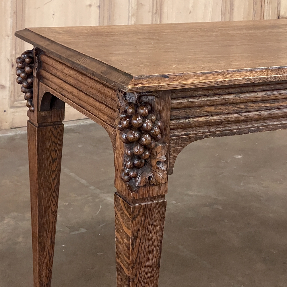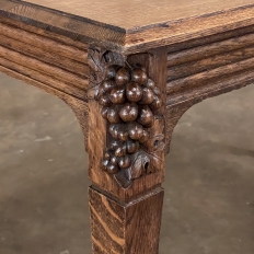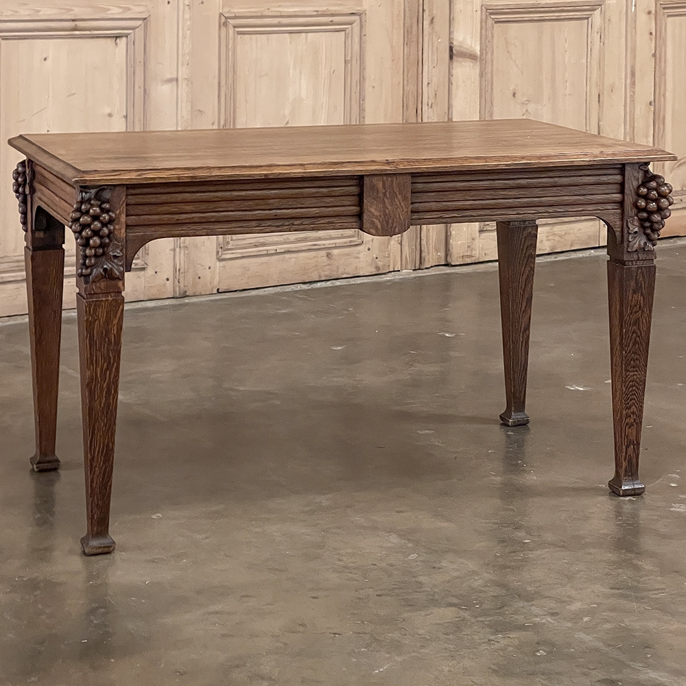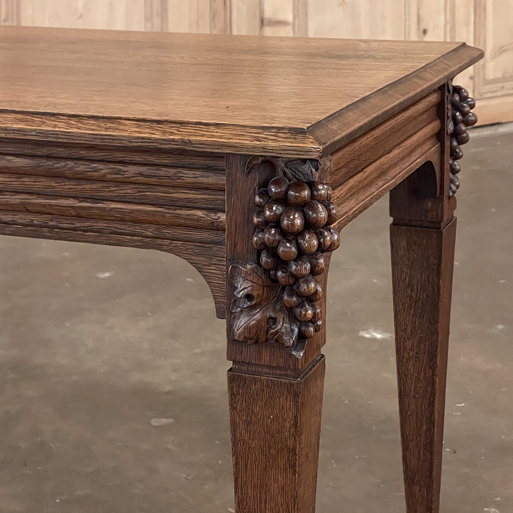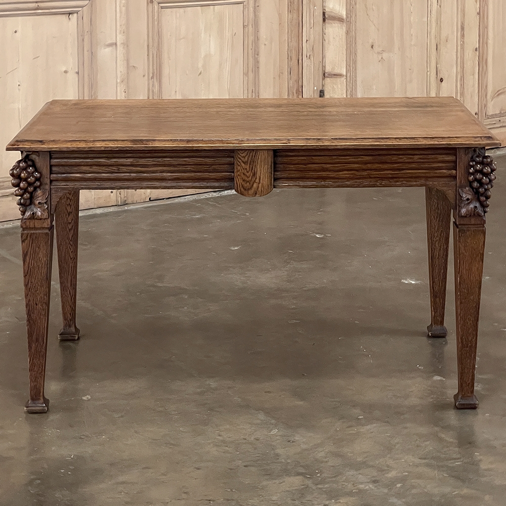 SaleArt Nouveau Period French Chestnut Coffee Table is a splendidly preserved example of one of Belgium and France's most significant contributions to the style world during a period of prosperity at the end of the Belle Epoque. The Art Nouveau style is a favorite of many discriminating connoisseurs, featuring a uniqueness of line and decoration. In this example, the generously sized table is lavished with full relief carvings of grape clusters with leaves on each corner, under which tapered and faceted legs extend down to flared feet. The apron design is tailored with parallel half-rounds and a shield form centered on and protruding from each long side. The table is also finished the same all around, making it ideal for placement anywhere a coffee or cocktail table is needed, especially one which exudes timeless style!