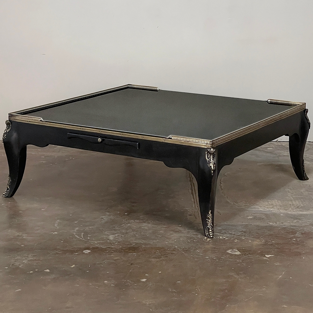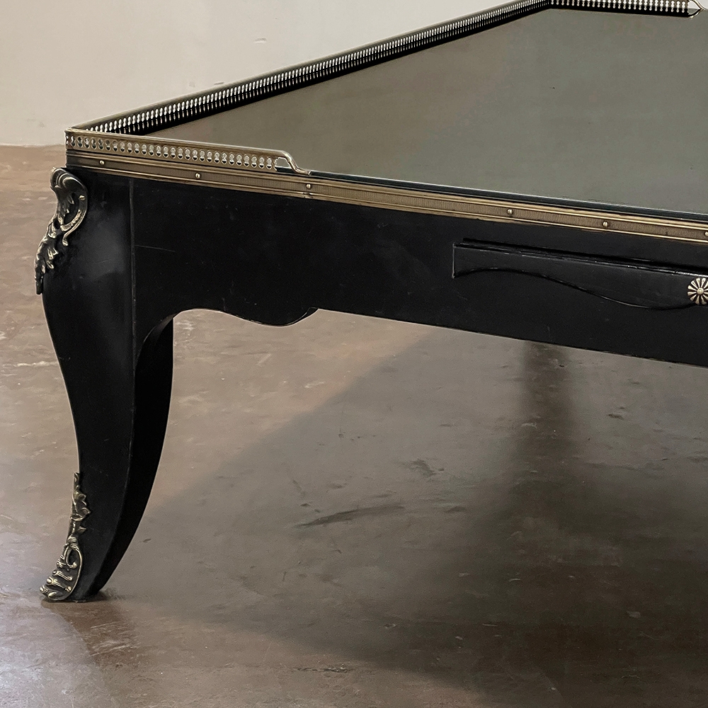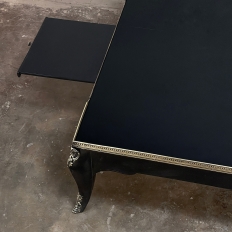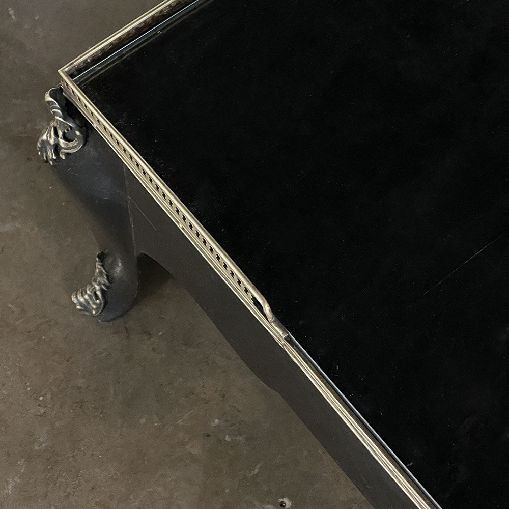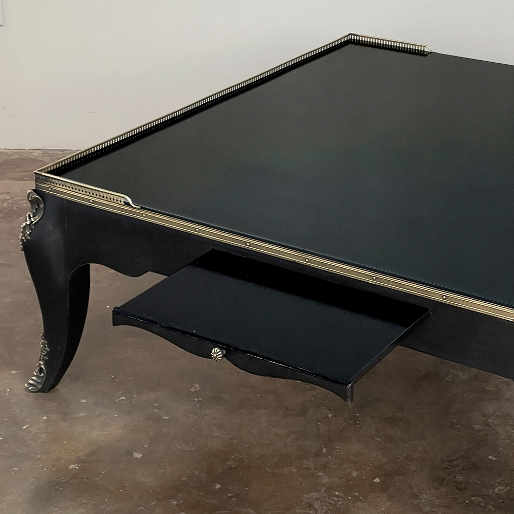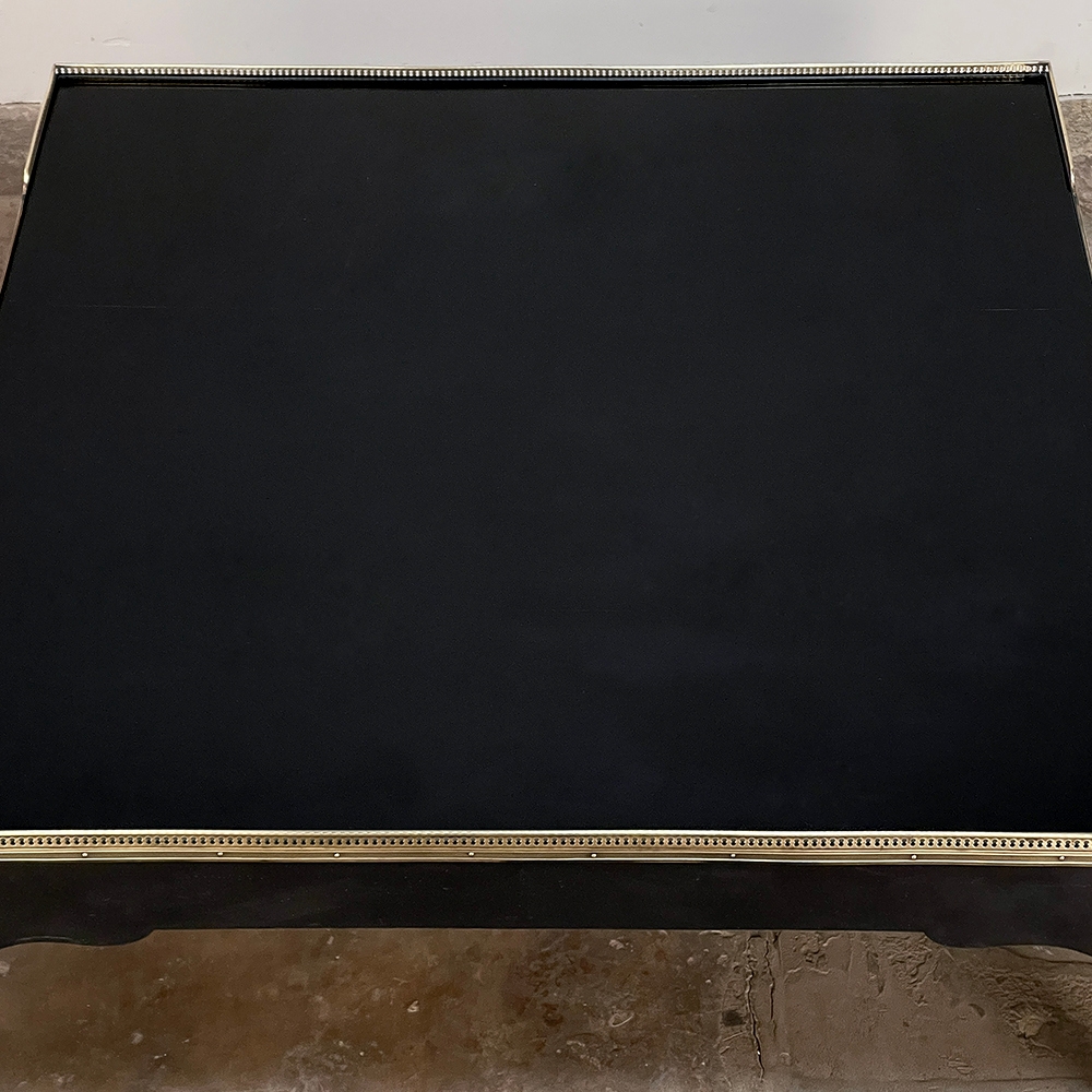 SaleGrand Mid-Century French Black Enamel Coffee Table with Glass Top is perfect for a large family room! Square in shape, it features a 2400 square inch glass top surface for carefree entertaining and daily use. The glass is held in place by a solid brass gallery rail all around the perimeter. The brass is accompanied by brass decorative mounts on the elegantly scrolled legs at each corner which depict stylized shell and foliate designs. Two convenient pull-out surfaces fitted with brass knobs add even more surface area for big families or large parties. Finished all around, it has been coated in black enamel for a timeless look.