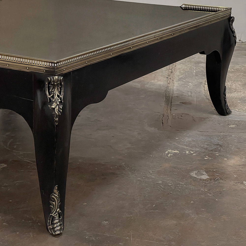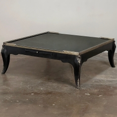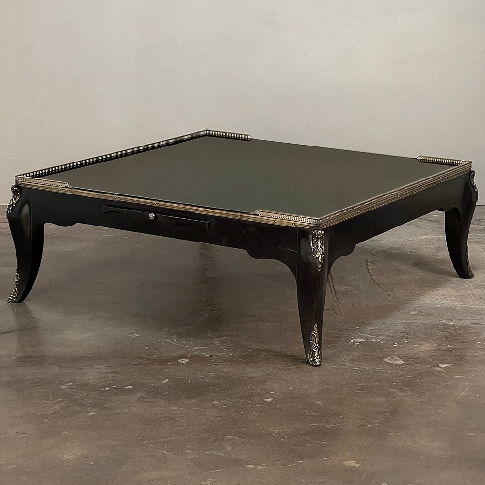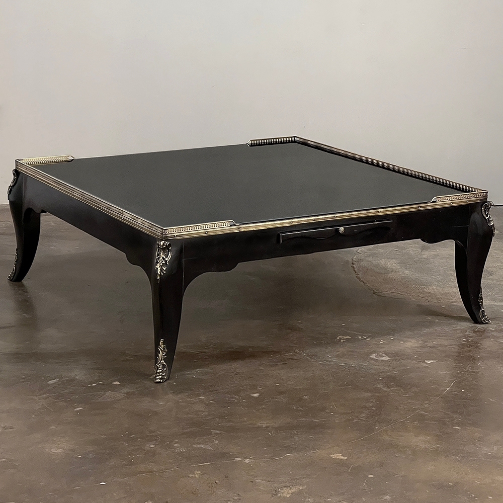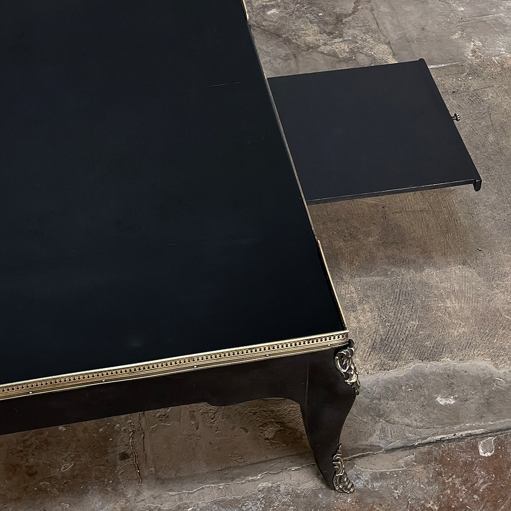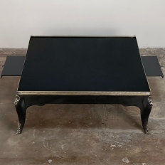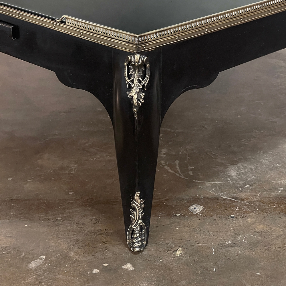 SaleGrand Mid-Century French Black Enamel Coffee Table with Glass Top is perfect for a large family room! Square in shape, it features a 2400 square inch glass top surface for carefree entertaining and daily use. The glass is held in place by a solid brass gallery rail all around the perimeter. The brass is accompanied by brass decorative mounts on the elegantly scrolled legs at each corner which depict stylized shell and foliate designs. Two convenient pull-out surfaces fitted with brass knobs add even more surface area for big families or large parties. Finished all around, it has been coated in black enamel for a timeless look.